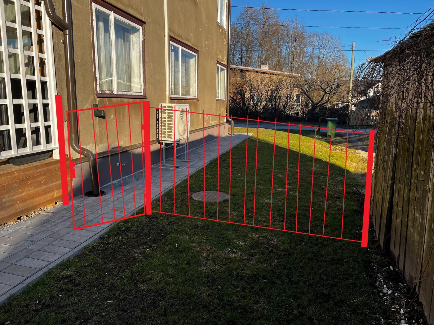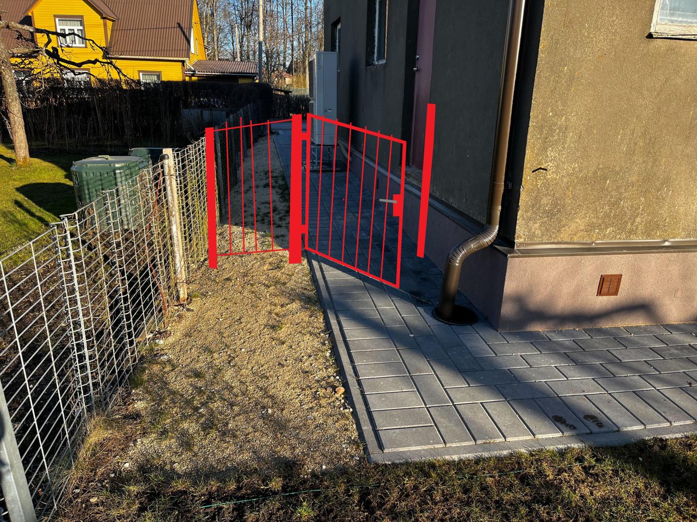 Eesmärk on majatagune aed ära piiritleda, et laps ei saaks mänguhoos joosta maja ette autoteele. Vaja on kaks sektsiooni, mõlemale poole maja. 4mm 3D paneelaed ~1200mm kõrgusega, tumehall (RAL7016), kuumtsingitud.