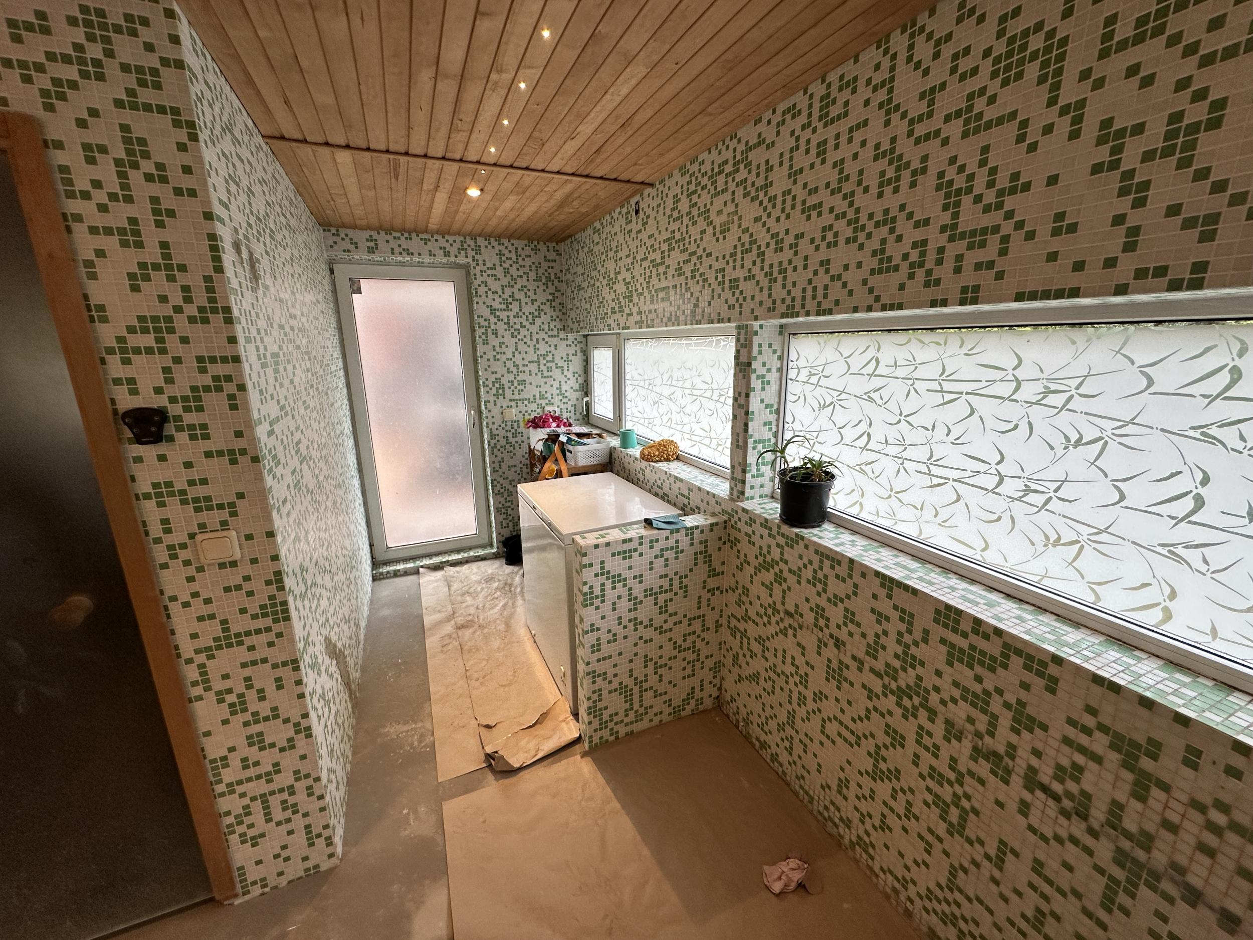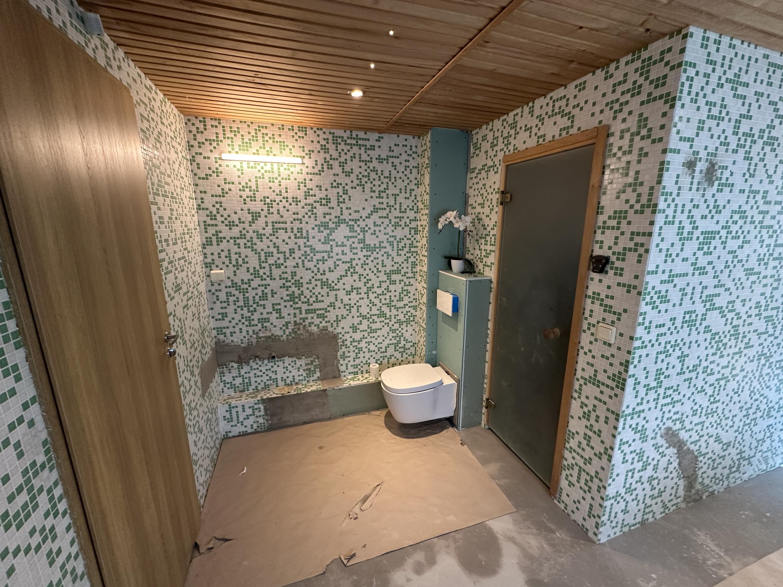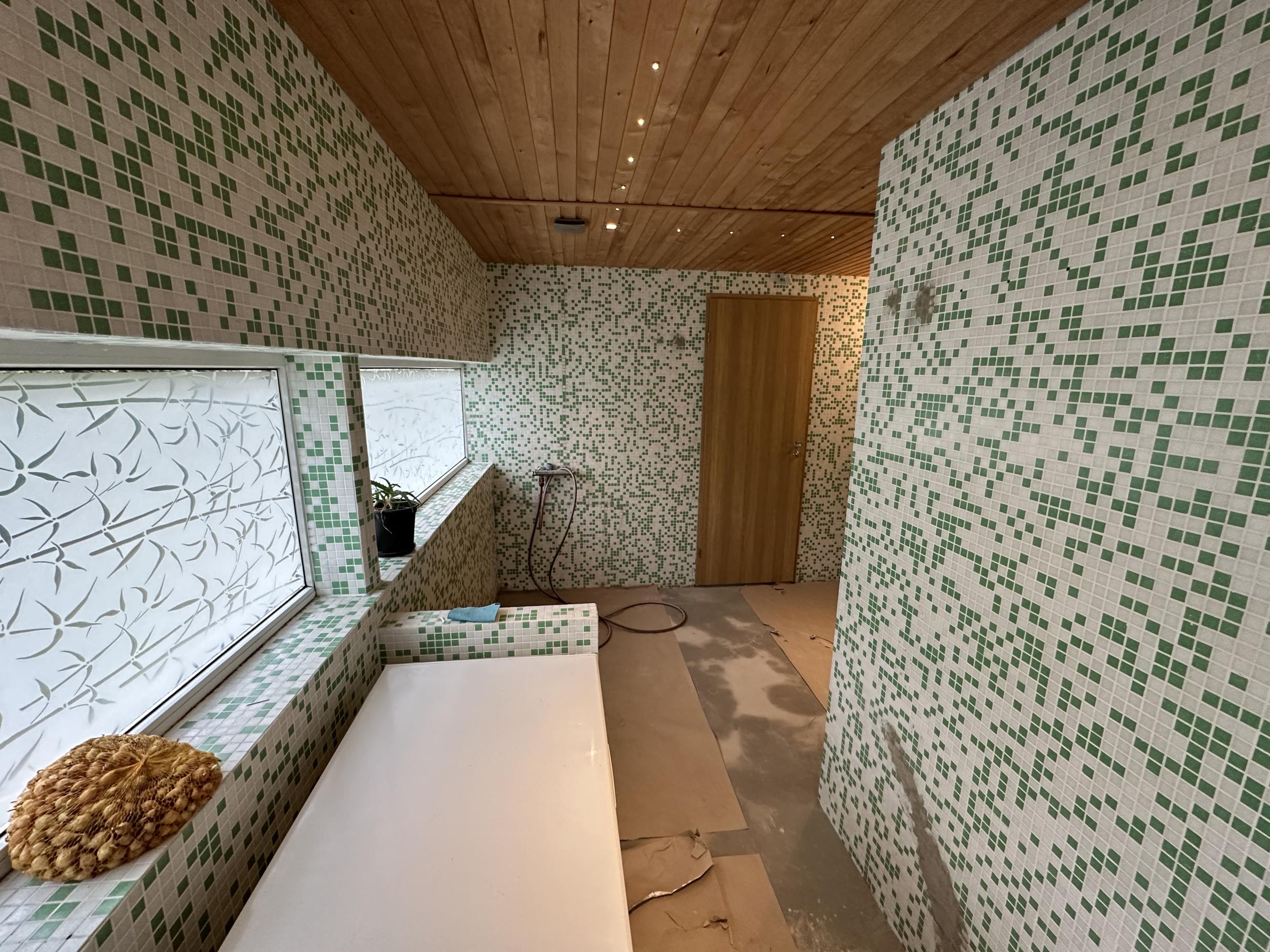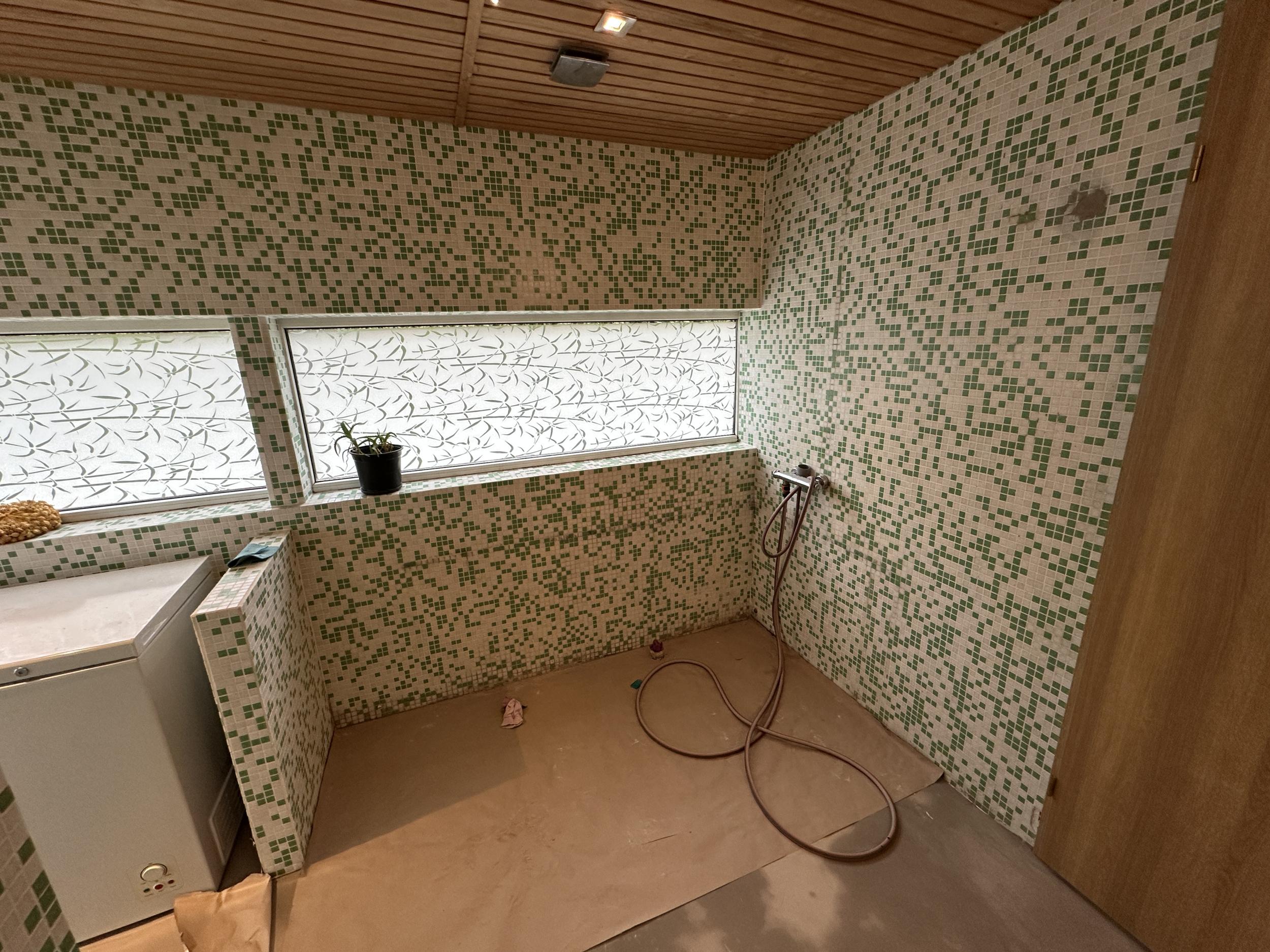 Vannitoa seinte plaatimine. Kuna vana mosaiiki pole mõistlik maha võtta, siis peaks plaatima vanale plaadile nö tile-on-tile. Plaadid on valitud mõõdus 60x30cm. Plaaditavat pinda on ca 30m2