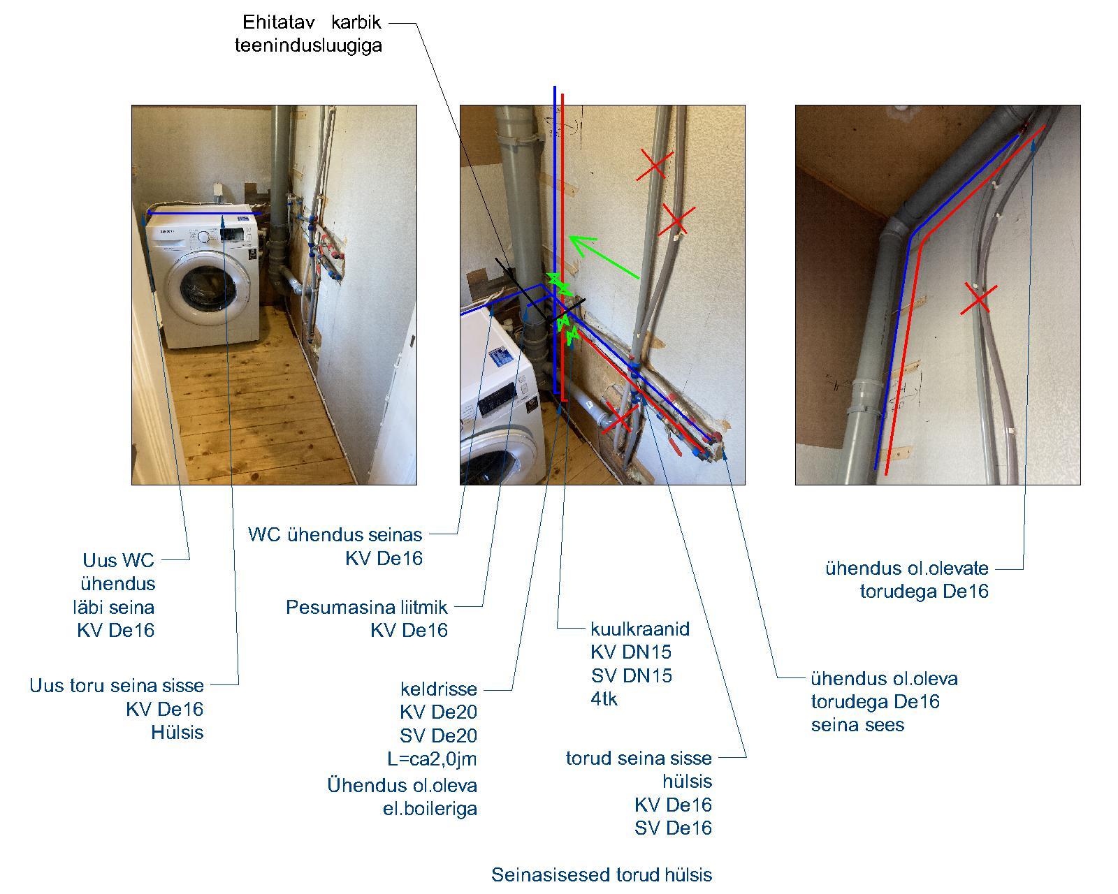 Olemasoleva toimiva veetorustiku ümberehitus vastavalt pildile. Külmavee ja soojavee PEX torude ümbertõstimine. Võimalusel uus torustik paigaldada alupex torudest. Uue pesumasina ja WC ühenduse tegemine koos ühendusliitmikuga.