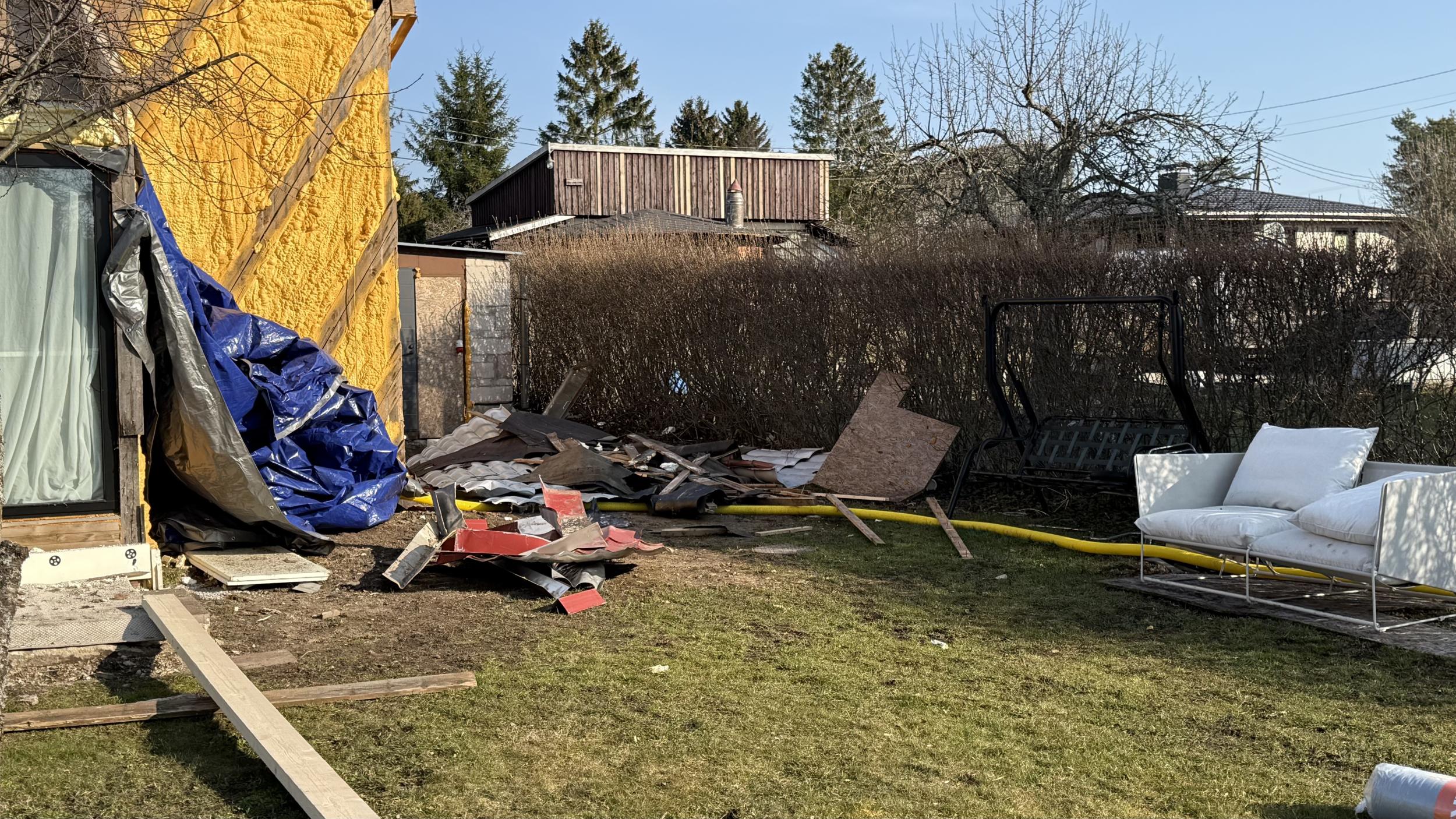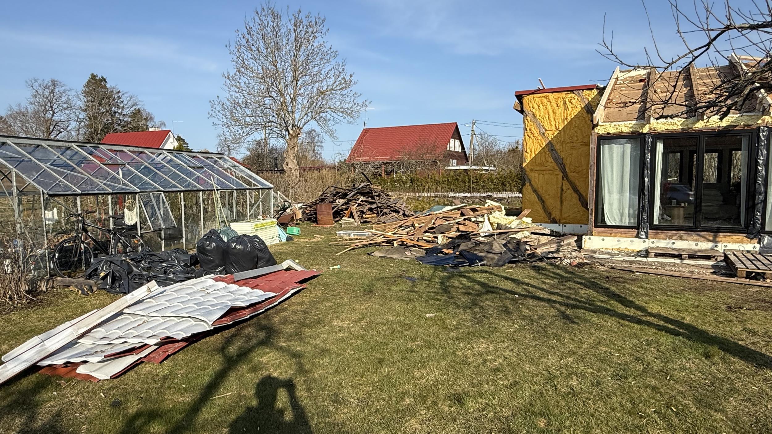Ehitusjärgselt on kogunenud suurem hulk puitu (naelad sees/ pool on must laudis, pool värvitud laudis), katuseplekki u 100m2 jagu ja mõningane hulk klaasvilla pakendatud 150L kilekottidesse. Vaja oleks hoov puhtaks saada ja vajalik praht prügimäele viia. Tšekkide alusel prügimäe komp.