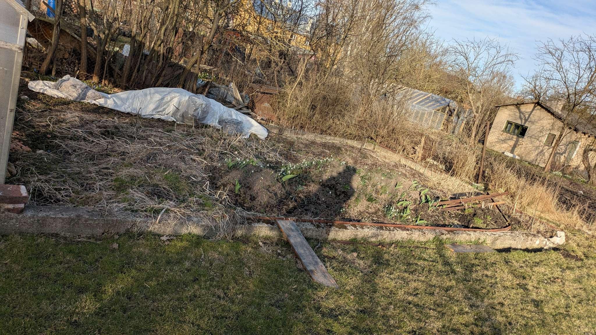Kohas, kus algab kasvuhoone, tuleb teha sirgem lõige (st kasvuhoone jääb alles sinna kus on). Ühes küljes on ka viinapuu (pildil valge talvekangaga kaetud koht), sealt tuleb hoolikamalt lõigata/piigata/lammutada, et need kahju ei saaks.