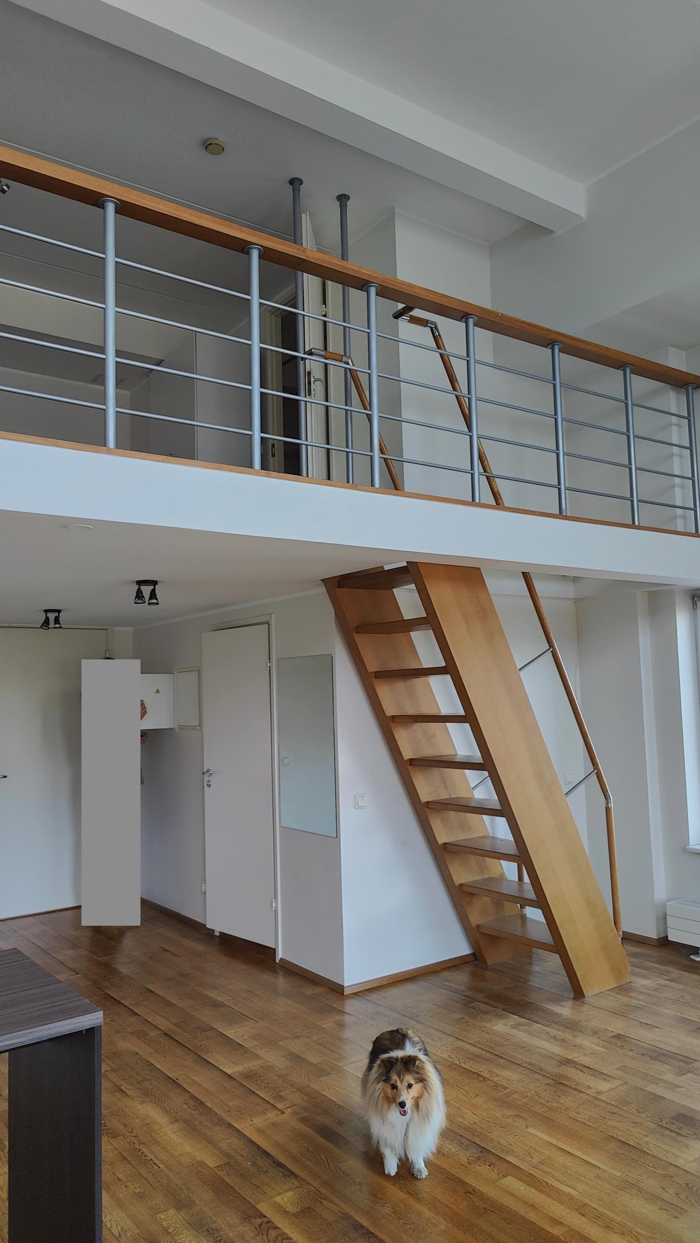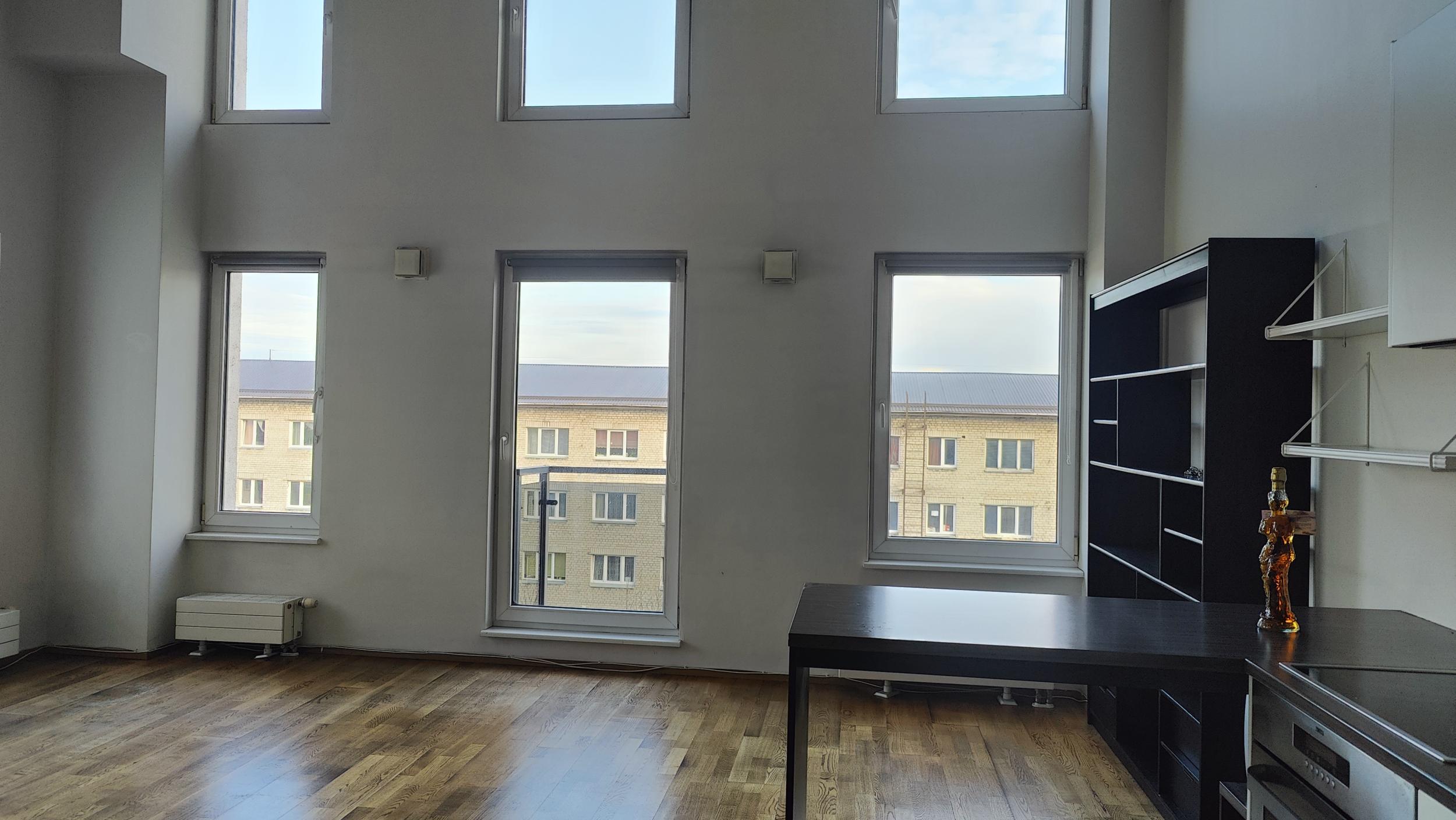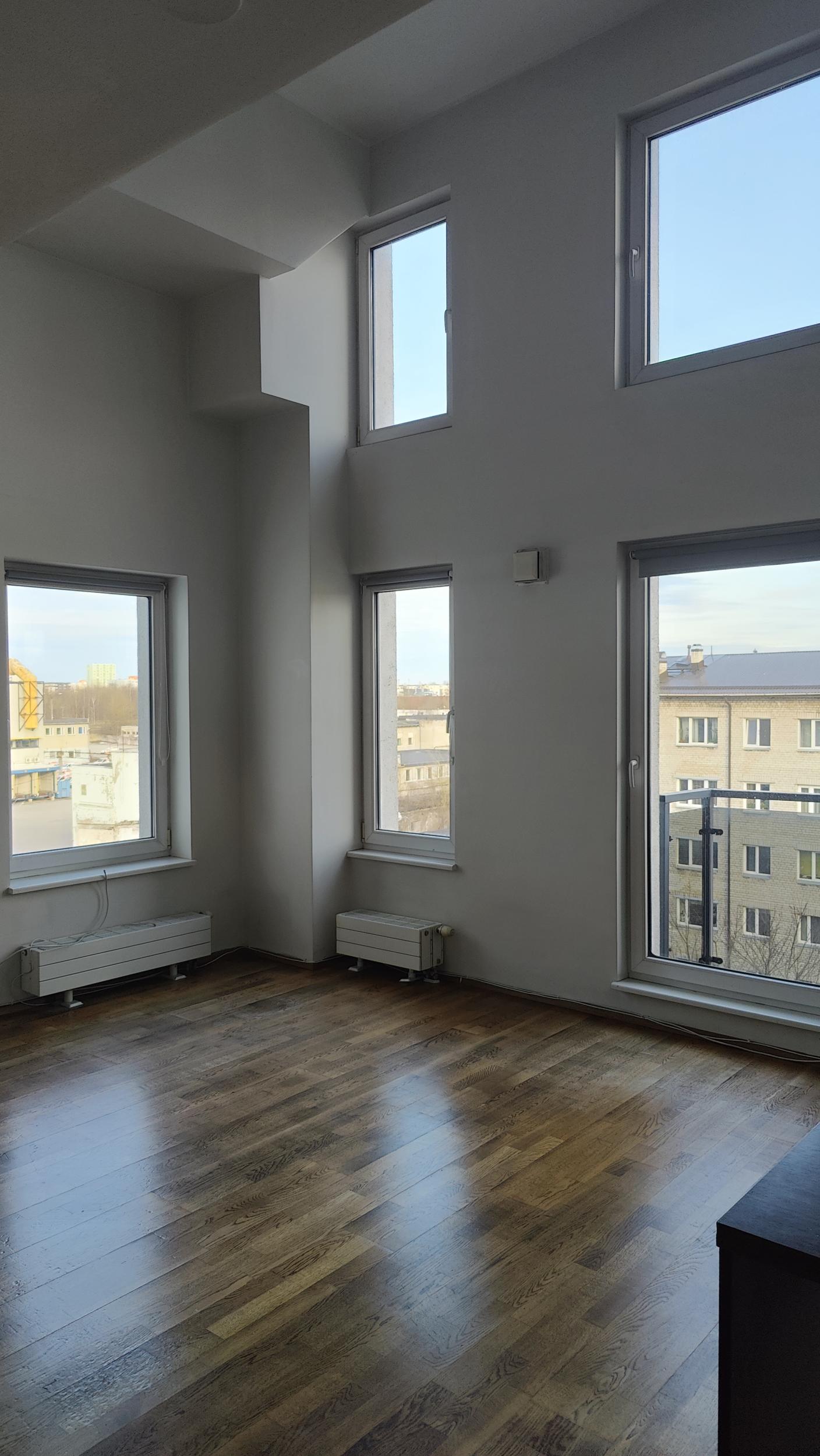Korteris põrandapinna ruutmeetrid u 58m2, millest osa on läbi kahe korruse ja osa teine korrus.