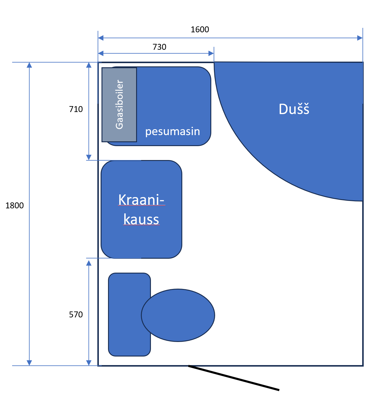 Vannitoa suurus on 1.6m x 1.8m, ruumi kõrgus u 2.5m.