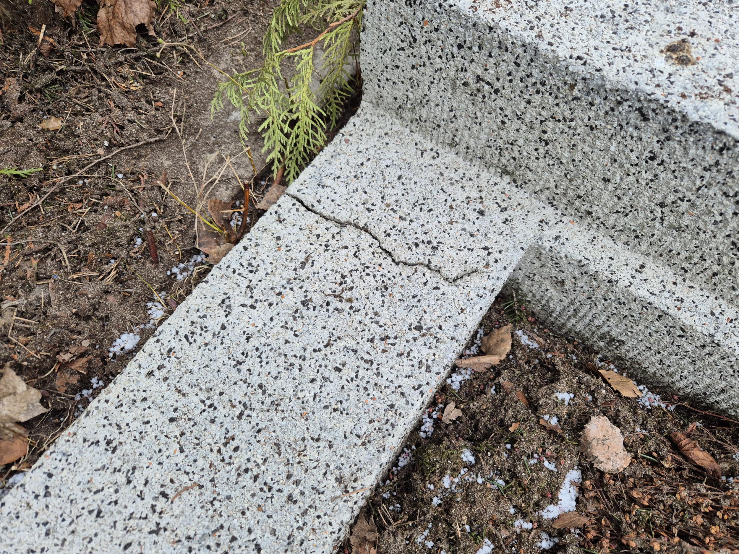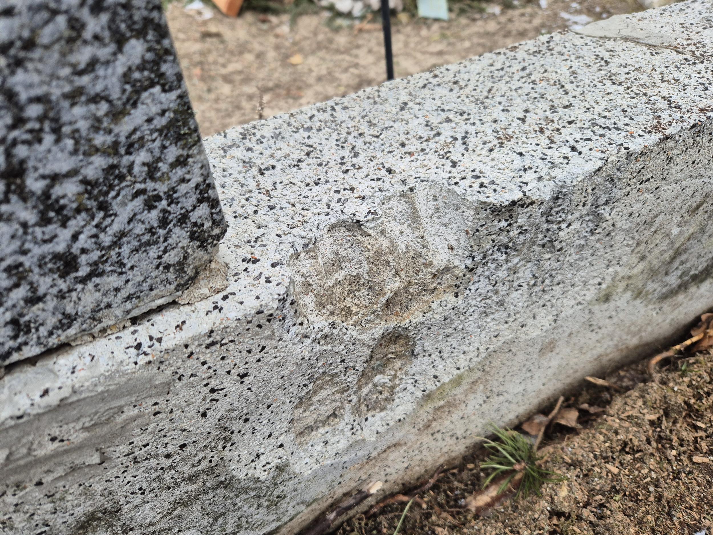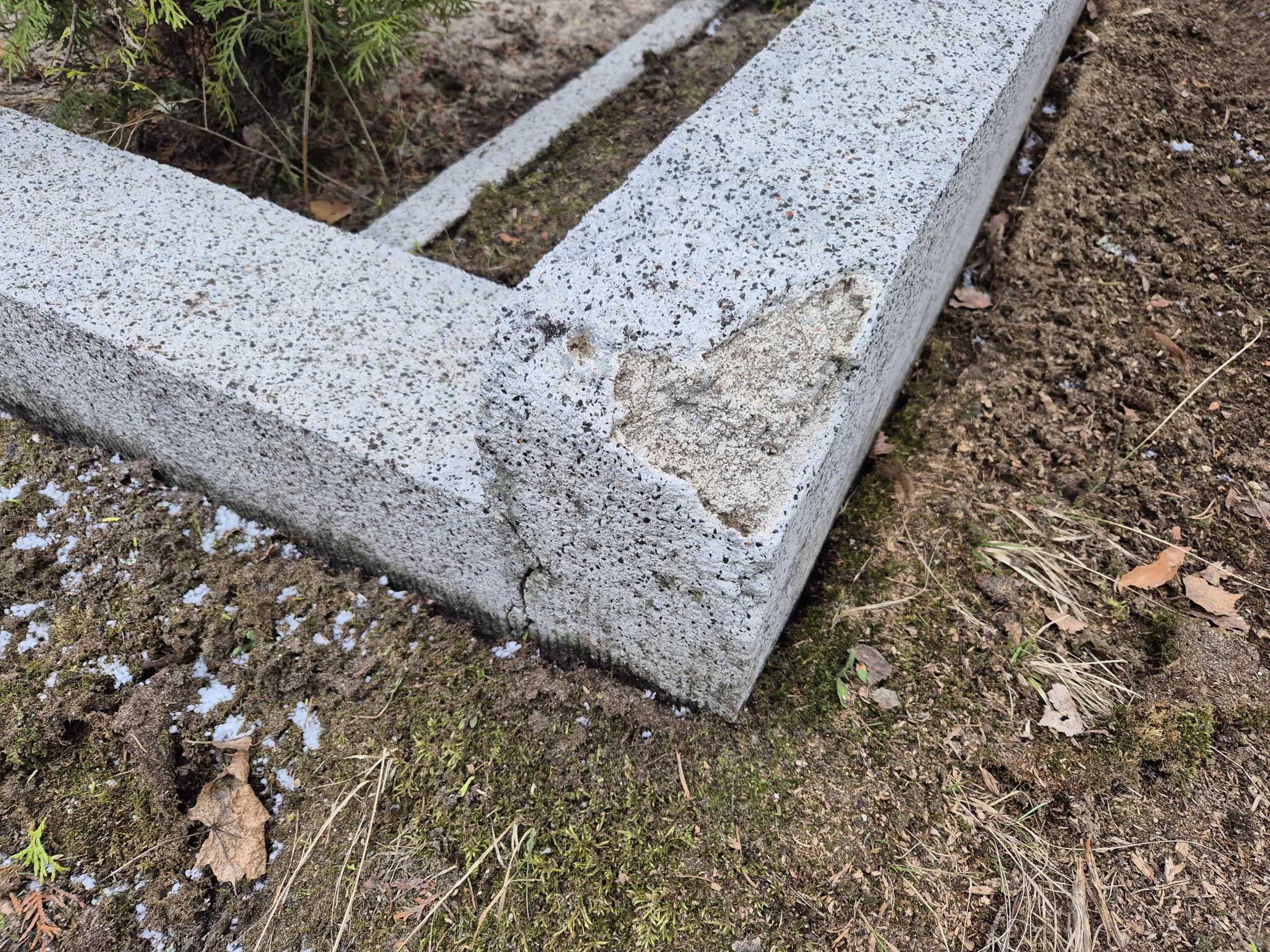 tegemist 60 a tagasi tehtud hauapiirdega, kus nurk ära tulnud ja ühelt küljelt tükk välja kukkunud. samuti 2 pragu tekkinud. sooviksin head meistrit, kes freesiks praod välja ning krohviks nii praod kui nutlrgad samasuguse terrassiitkrohviga ära.