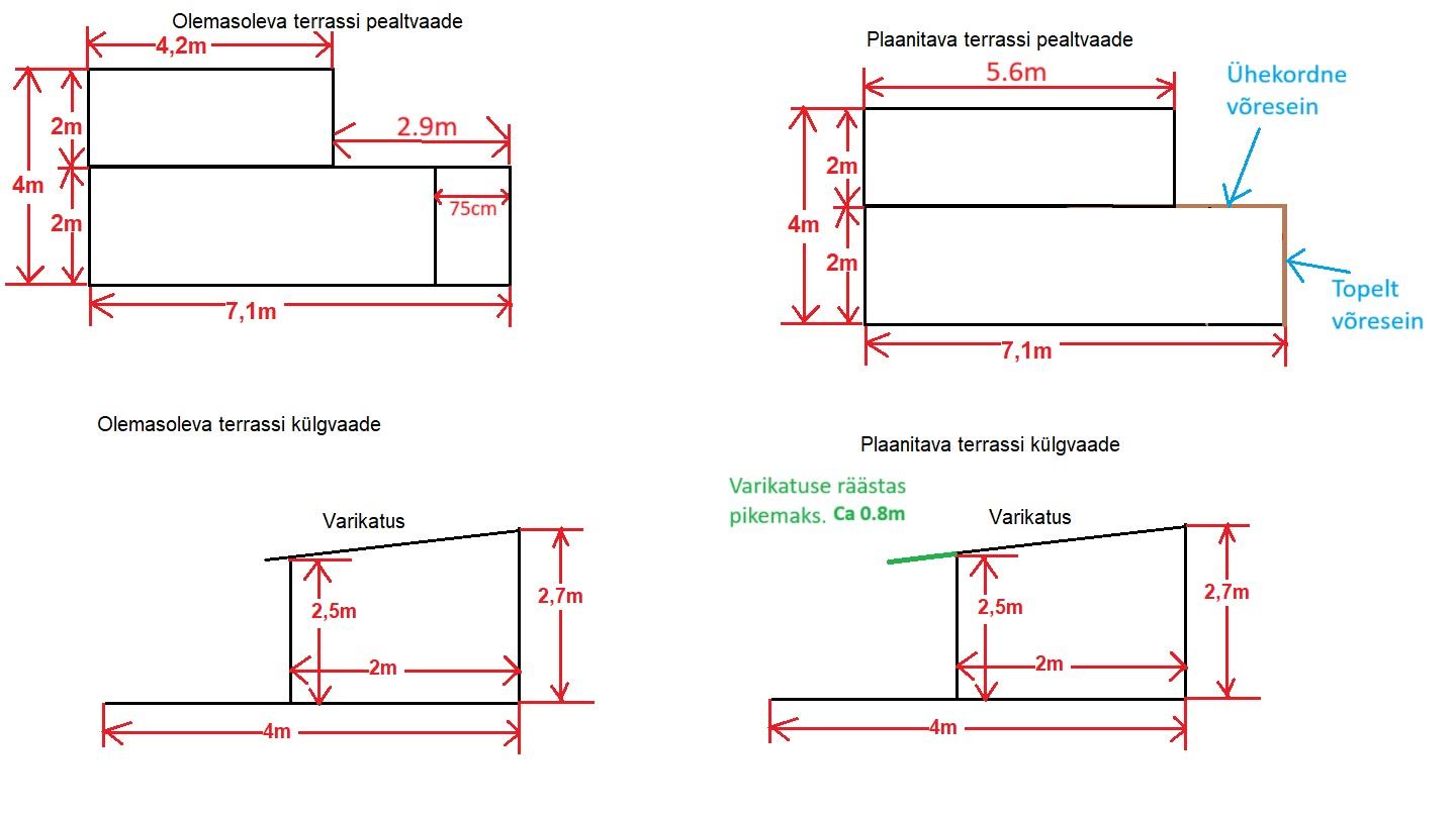 Asemele tuleb praegusest pisut suurem terrass pindalaga ca (2m x 7.1m) + (2m x 5.6m). Kokku ca 26m2.