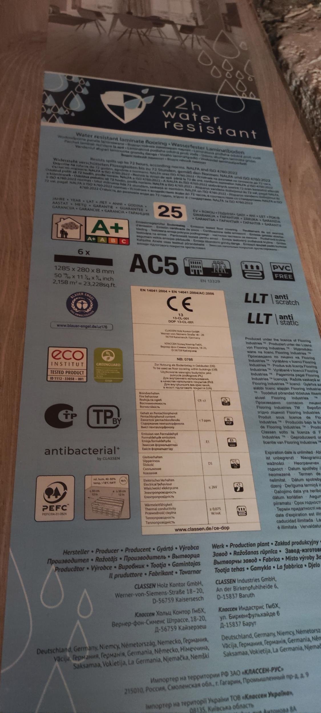 Uus laminaat on ostetud (6 pakki pildil olevat laminaatparketti). Võimalik, et on vaja juurde osta mõnda materjali (vaigustuseks vms), mis käib selle alla vahekihina - vajan nõustamist, materjali ostan ise (või kokkuleppel).