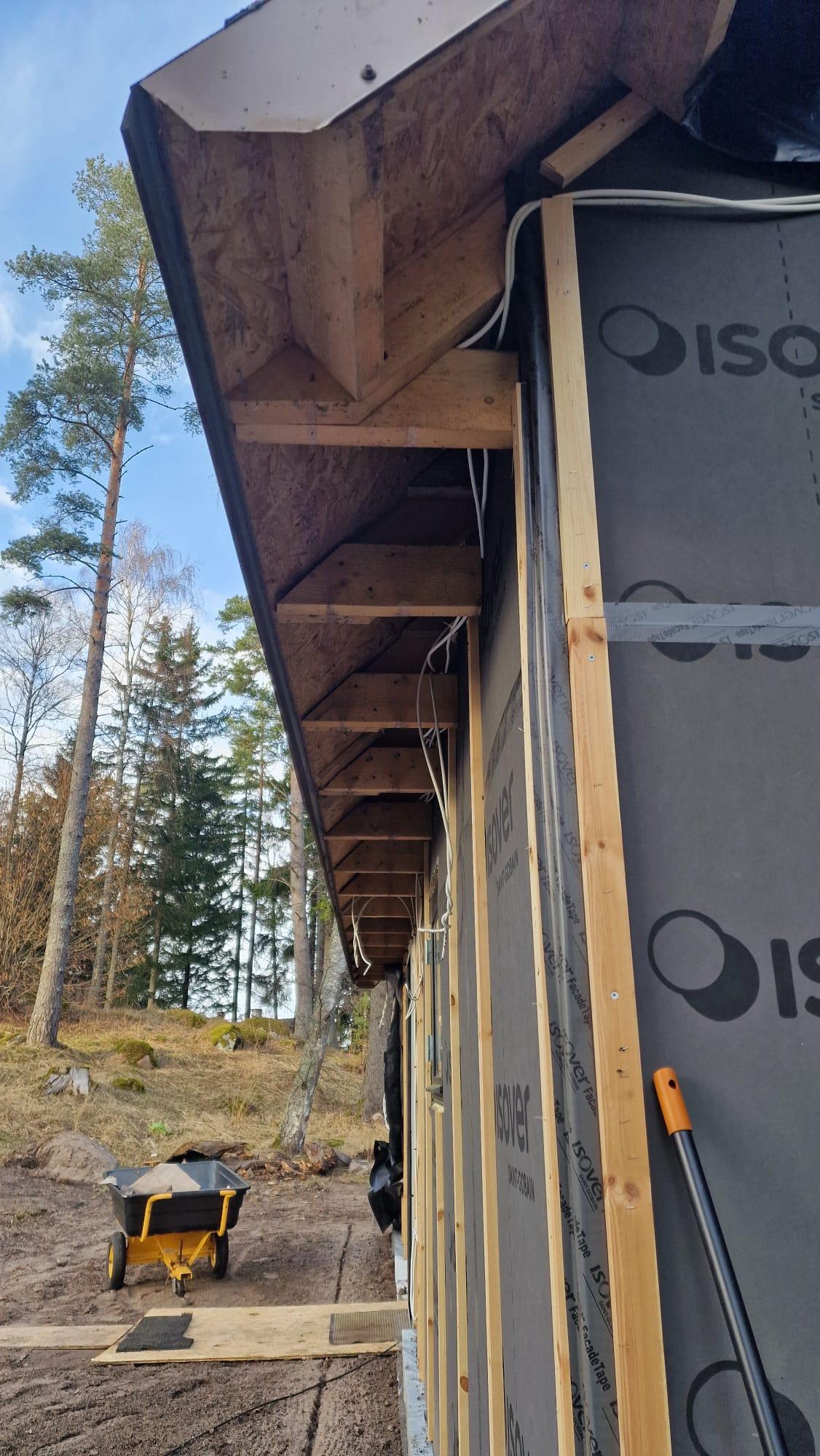 6. Tuulekasti laudise paigaldus (samuti termopuit). Otsaseinte tuulekastil jookseb laud alt üles (mitte risti). Tuulekasti laudise pind 15,5 m2. Servalaudasid ei ole, ainult lapiti. Tuulekasti kandvad osad olemas, sh kutsikad, arvestada mõningase rihtimisvajadusega.