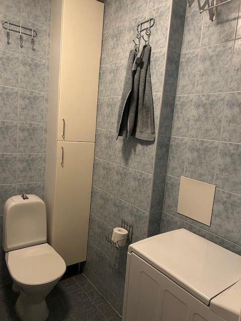 Uue dušinurga, valamu ja -kapi, valgustusega peegelkapi, wc-poti, segisti, pesumasina, ripplae ja ukse paigaldus.