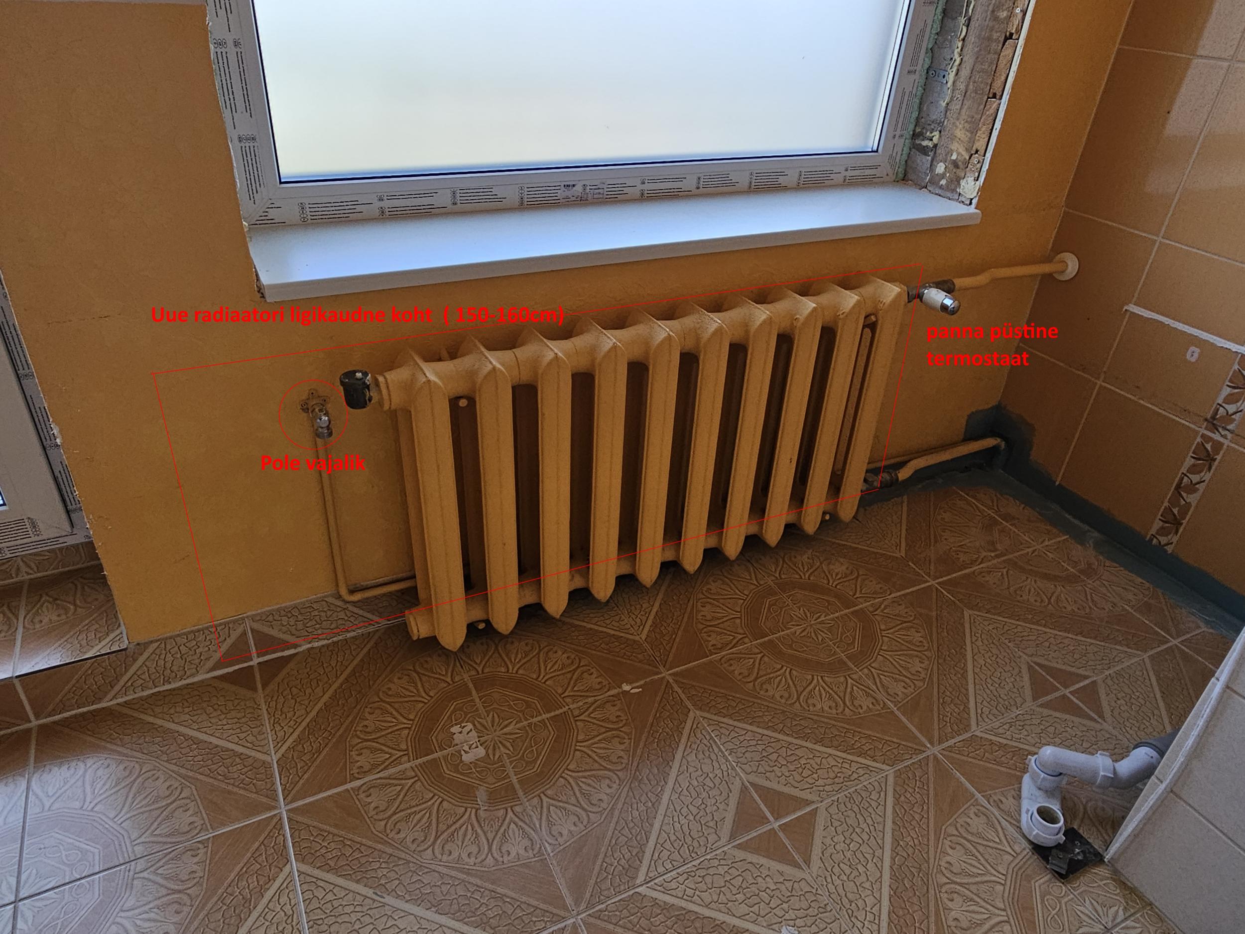 Pakkumist sooviksime vana radiaatori utiliseerimise, kogu töö ja materjali peale (sh. radiaator, termostaat, kraanid, ühendused, õhutusventiil jms). Tegemist on avatud küttesüsteemiga.