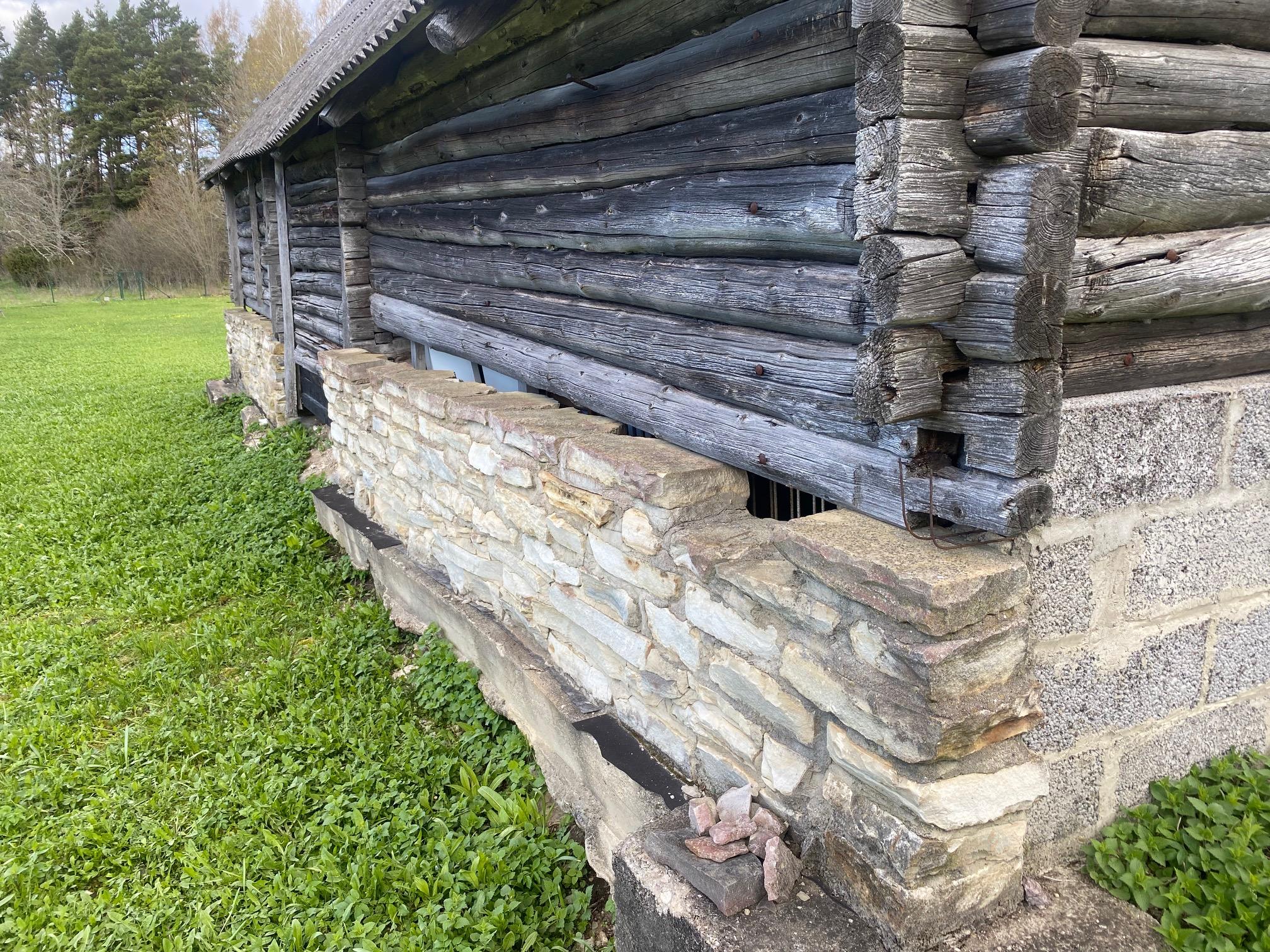 Tundub, et maja kolme külje vundament on enam-vähem OK - st tuleb lisada barjäär kivi ja palgi vahele, parandada mõni üksik auk. Neljandal küljel on minu meelest osa vundamenti viltu laotud, osa üleüldse puudu. See külg tuleks koda teha, vajadusel vana käkk lammutada. Lõpptulemus peab olema see, et palkmaja ilusti istub korraliku vundamendi peal. Fibo võib kasutada, ei ole vaja viimistleda.