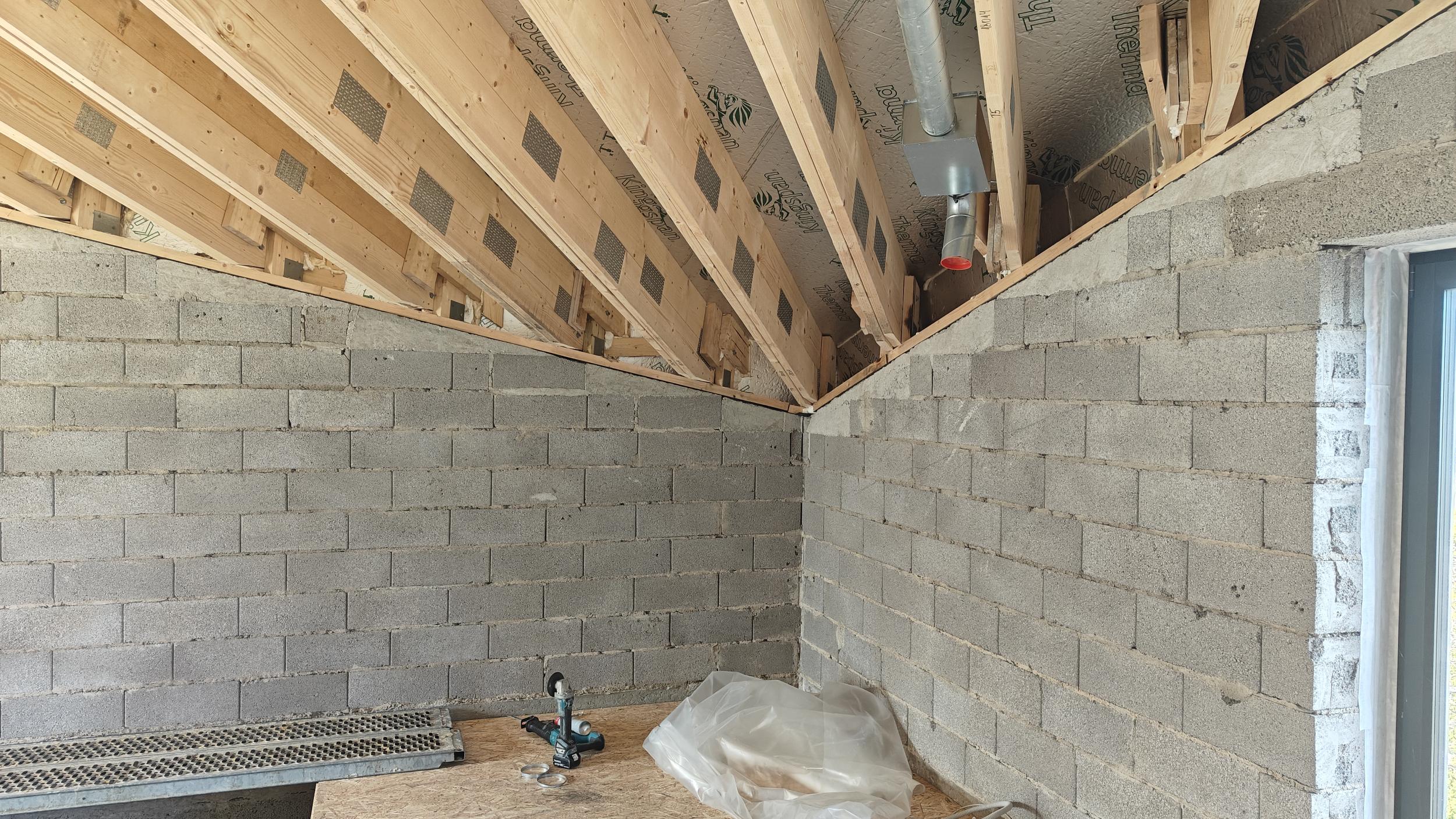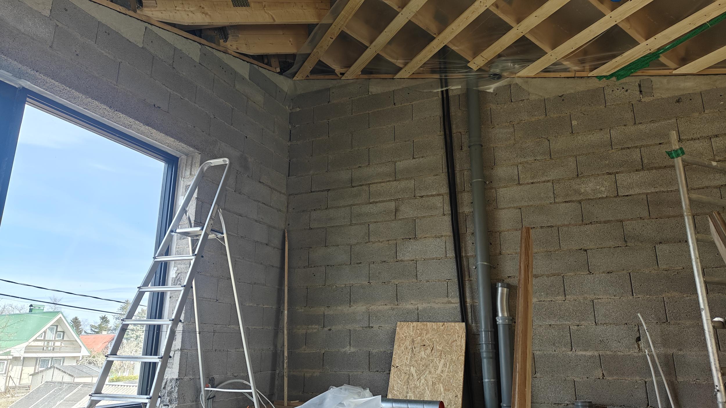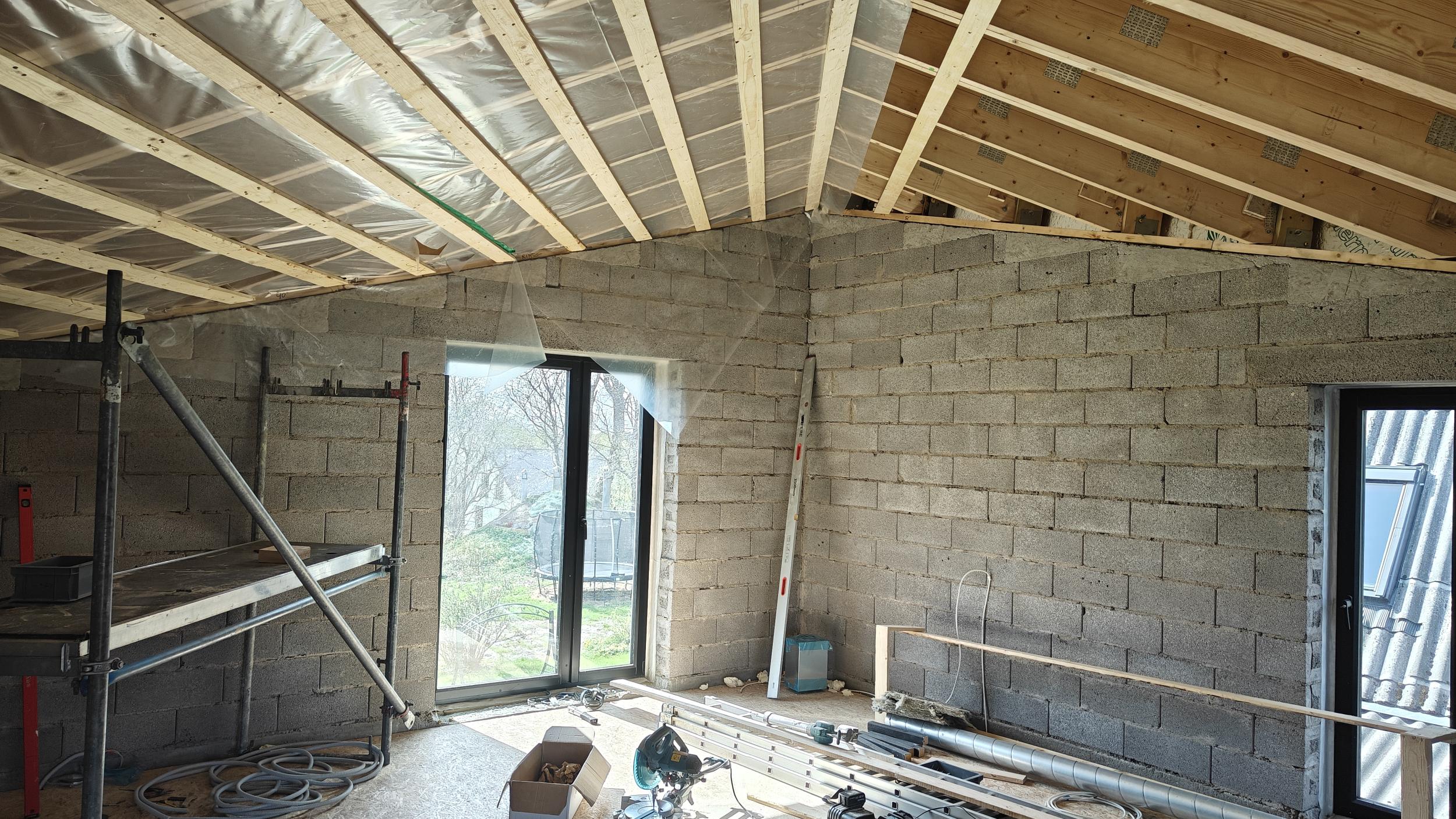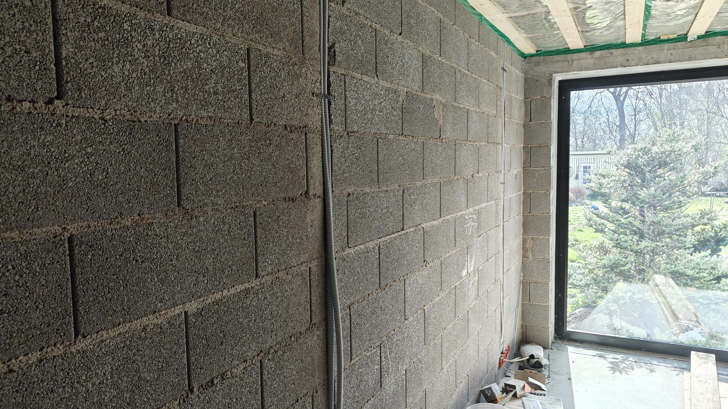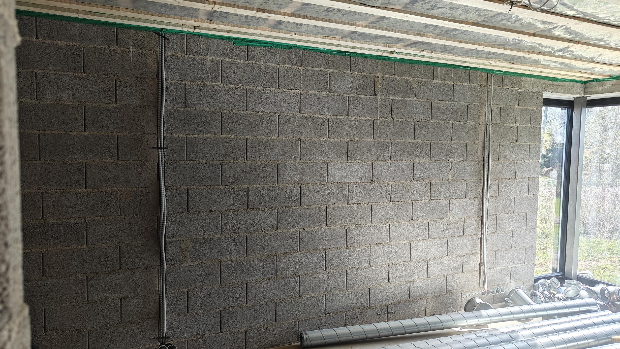Kahekordne maja, ca 100m2, siseseinad on paljas Fibo ja oleks vaja krohvida siledaks. Teiese korruse vaheseinad ei ole veel ehitatud, seega vähem nurkade nikerdamisi. Krohvitavat pinda on umbes 160m2, teise korruse lagi on 1.5-3.4m kõrge, alumine korrus kõikjal 2.5m kõrge.