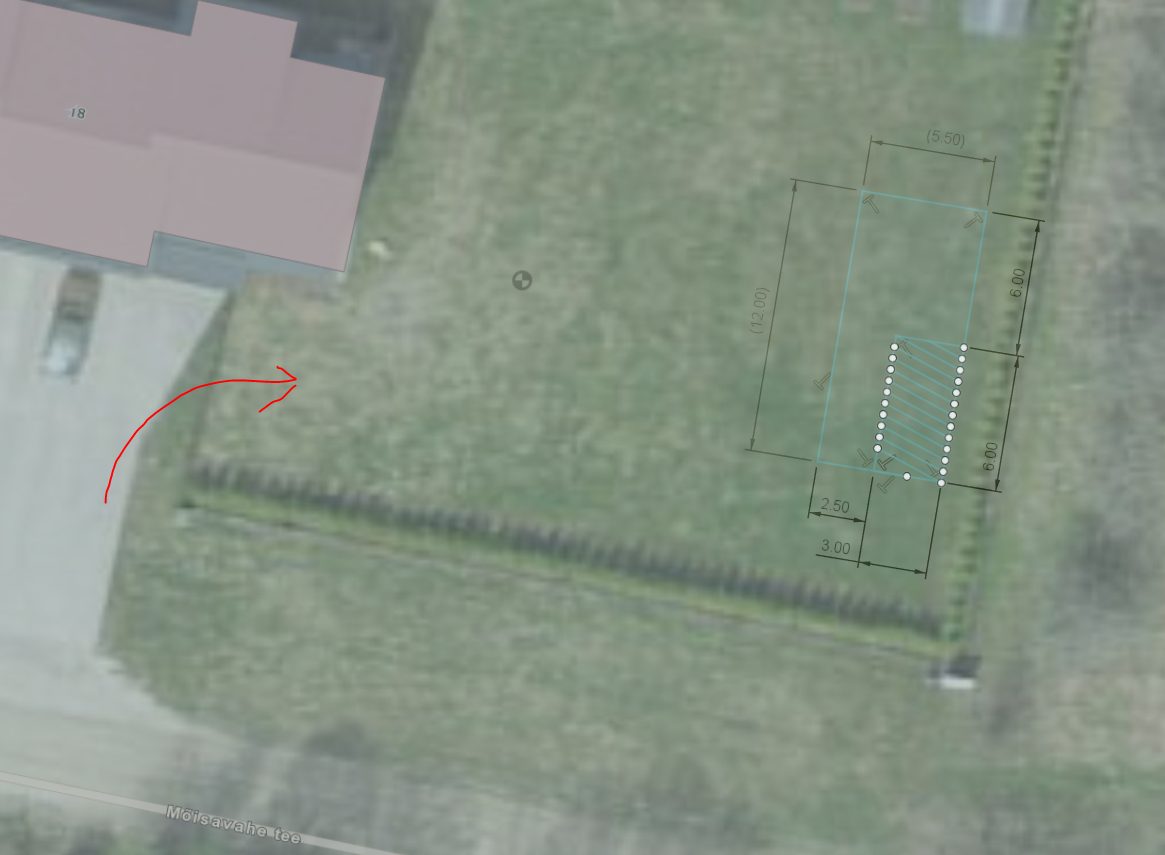 Murukamar tuleks eemaldada alalt 12x5,5m. Viirutatud alale tuleb aiamaja, mis läheb postidele. Sinna oleks vaja ainult geotektsiili taimekasvu peatamiseks ning natuke kruusa peale raskuseks(või kuidas seda parem on paigaldada).
