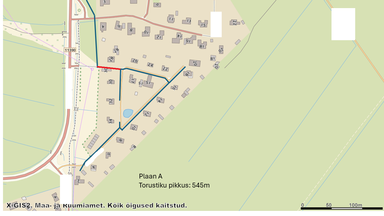 N.B. Pildil manuses on veetrassi paiknemis koht märgistatud sinise värviga, punasega on märgistatud kitsaskoht kuhu pääseb tehnikga mis on maksimaalselt 1.2m lai, selle osa pikkus on 30m. Kogu trassi pikkus on 545m.