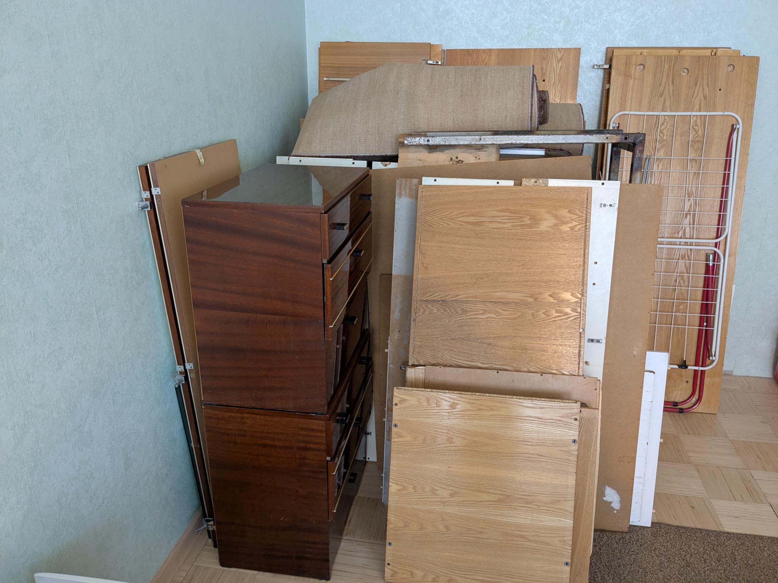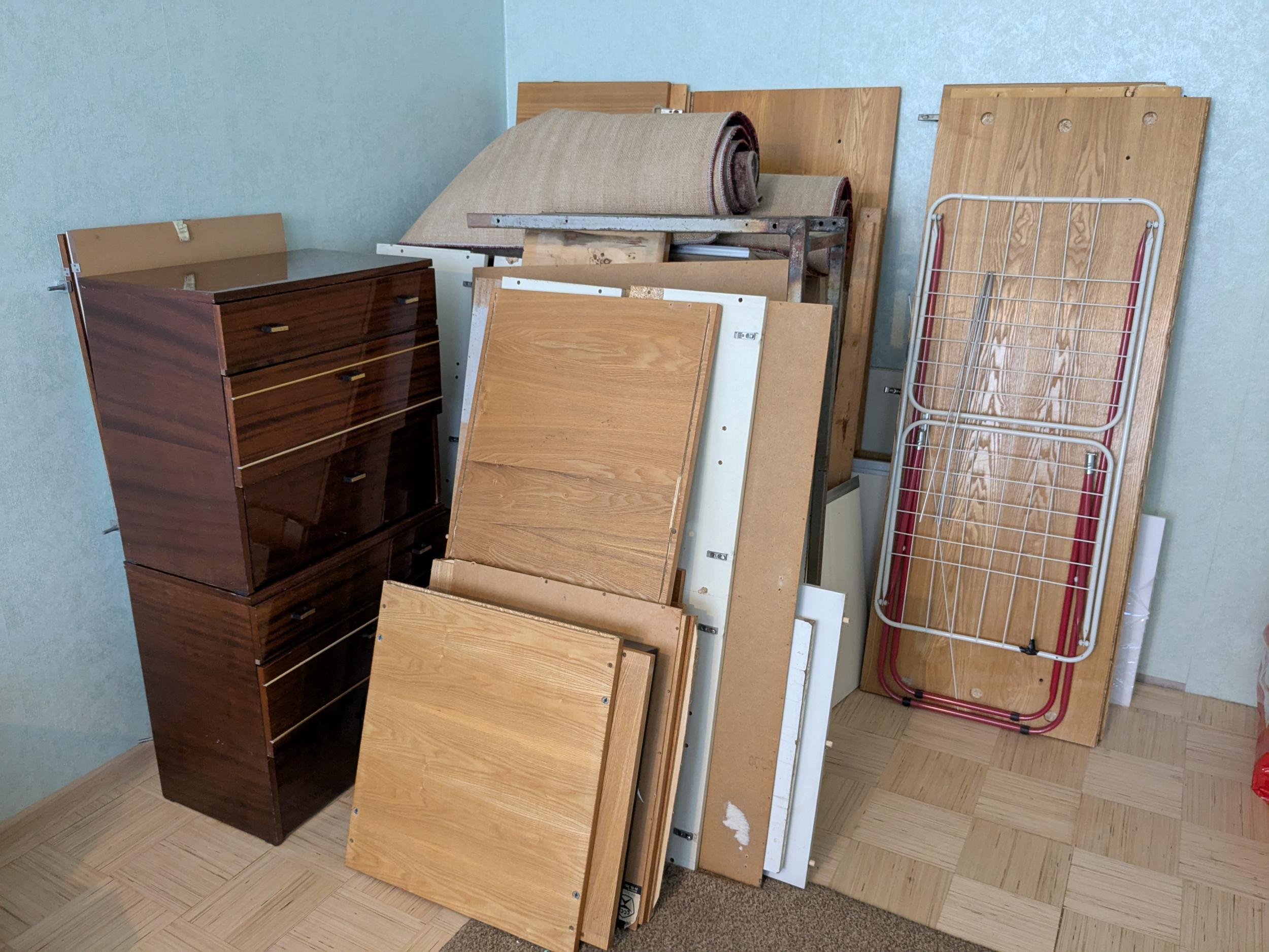 On vaja ära vedada ja utiliseerida suurjäätmed: mööbel (enamus juppidena), peegel, vaip, riidekuivatusrest ja lisaks ka seif. Mööbel mahub ära 1,5 x 1,5 x 1,5 m alale, seega mitte rohkem kui 3,5 kuupmeetrit.