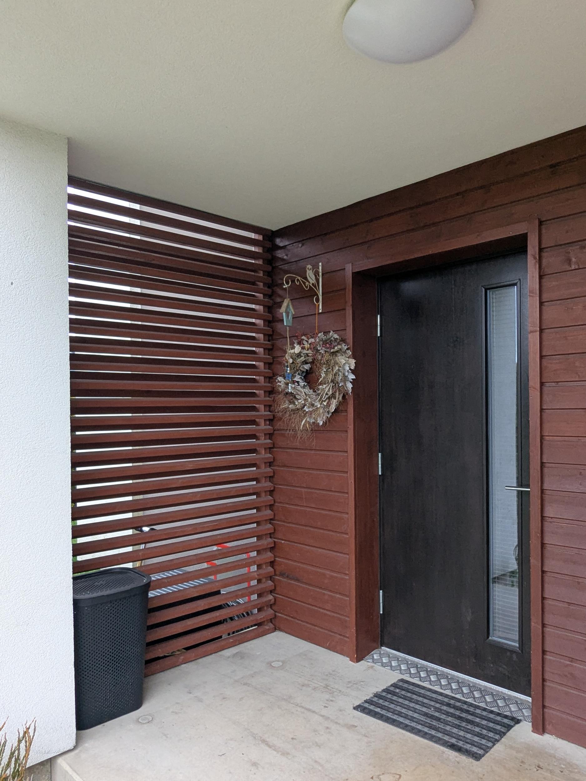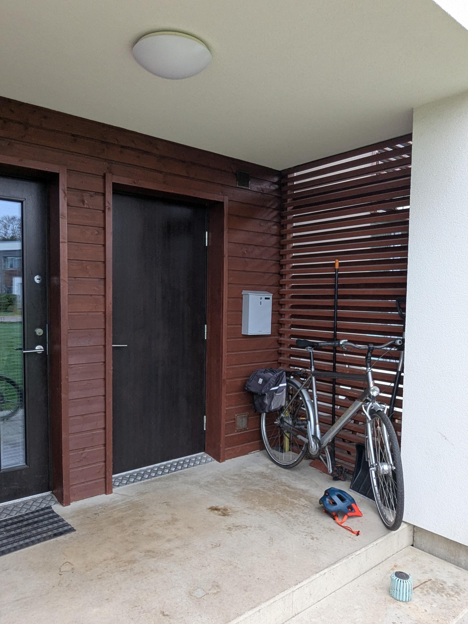Lisatud ka fotod korter elamu kõikidest külgedest koos korteri esiste sissekäikudega mille ümbrus on kaetud puitrestidega.