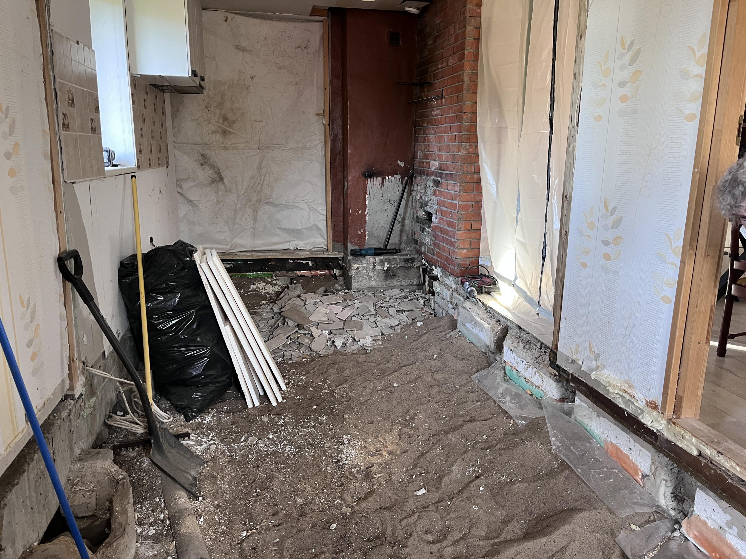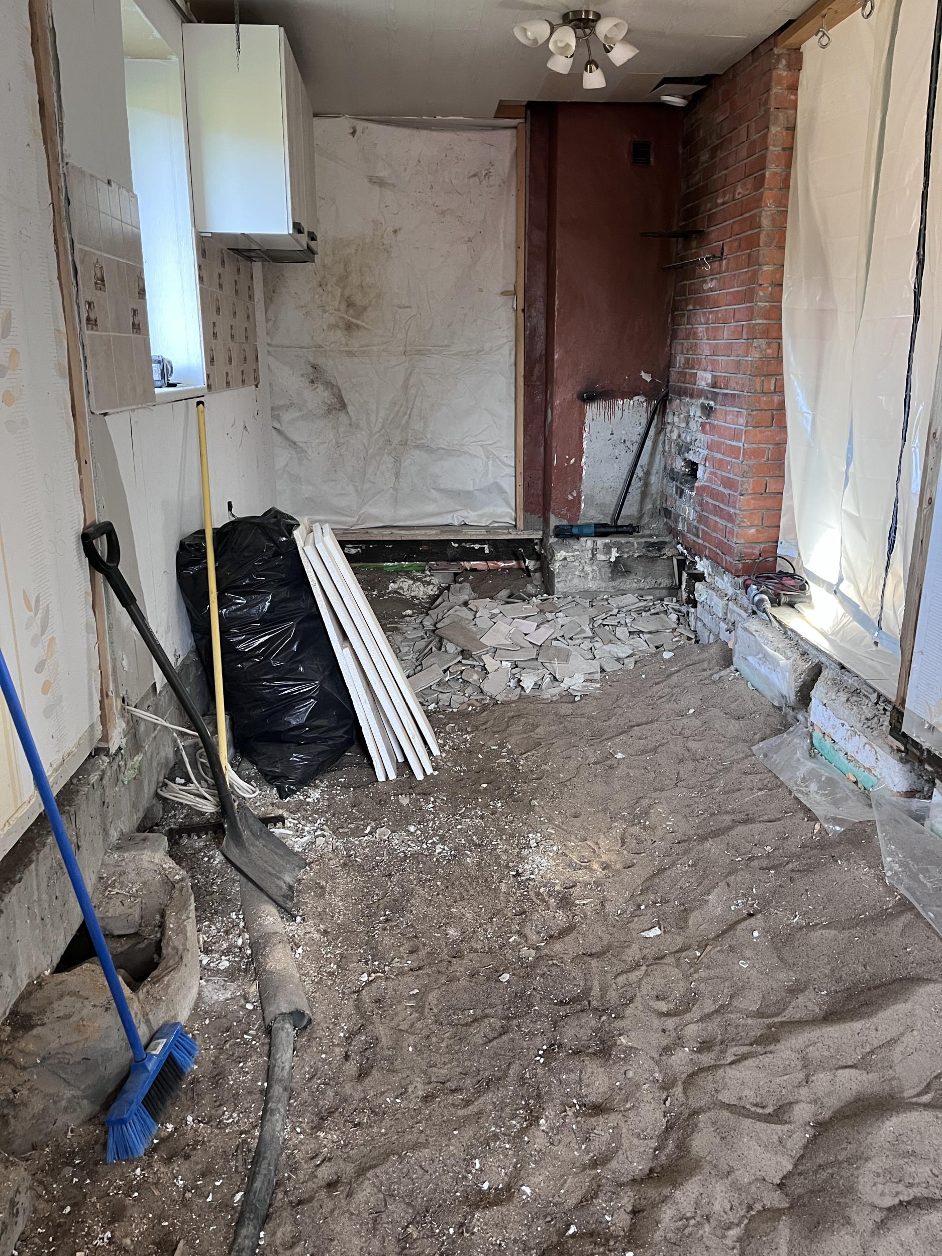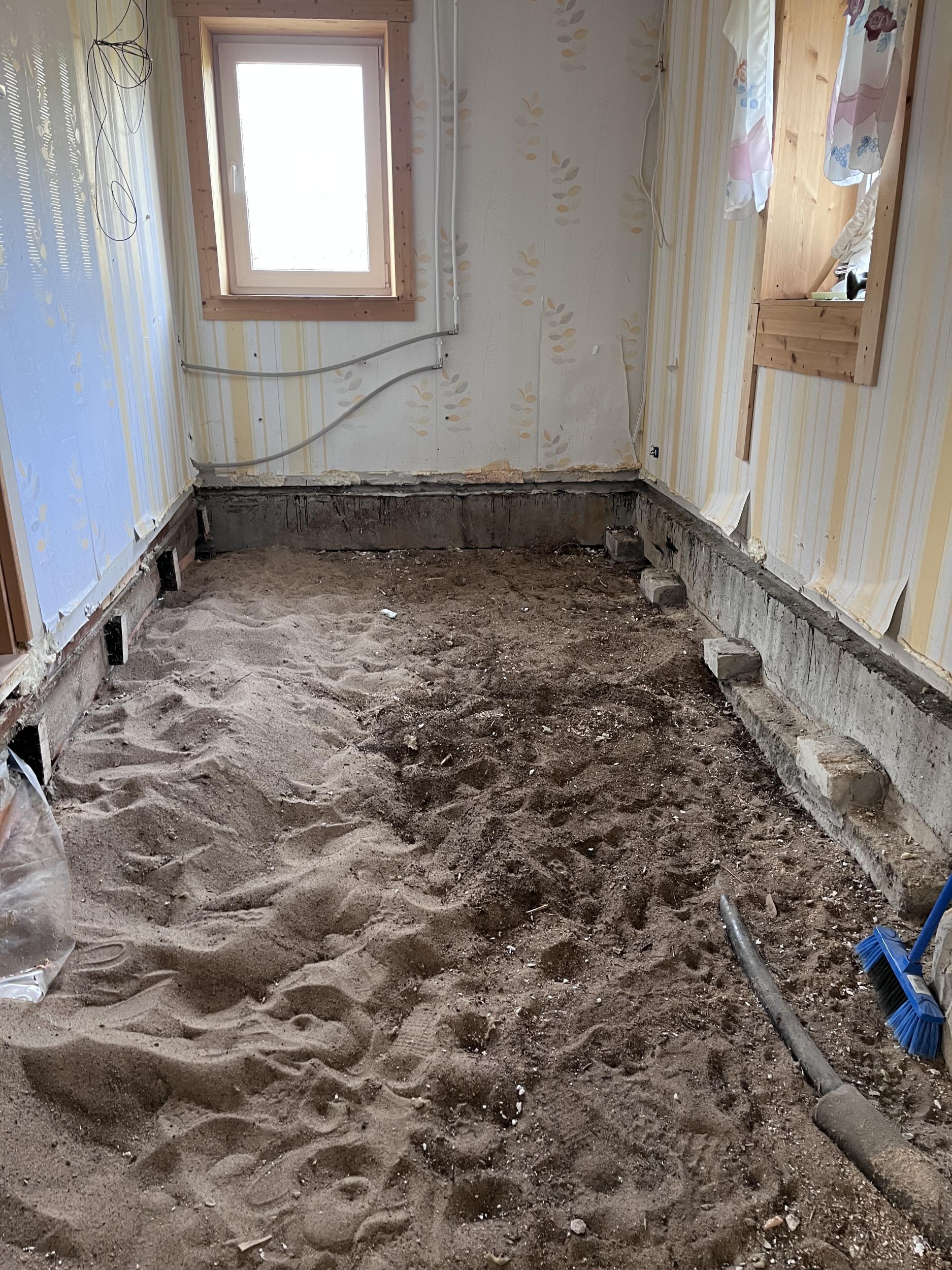 Sinisest tööalast väljapoole jääv ala on juba renoveeritud betoonpõrand koos põrandaküttega. Seal on betoonikihi paksus ca 20 cm; uue põranda kiht peaks jääma sama paksusega.