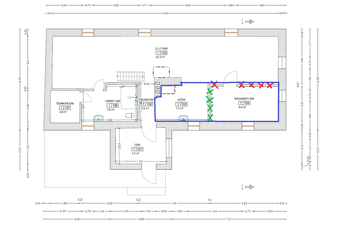 Punasega ristitatud sein plaanil tuleb töövõtjal demonteerida.