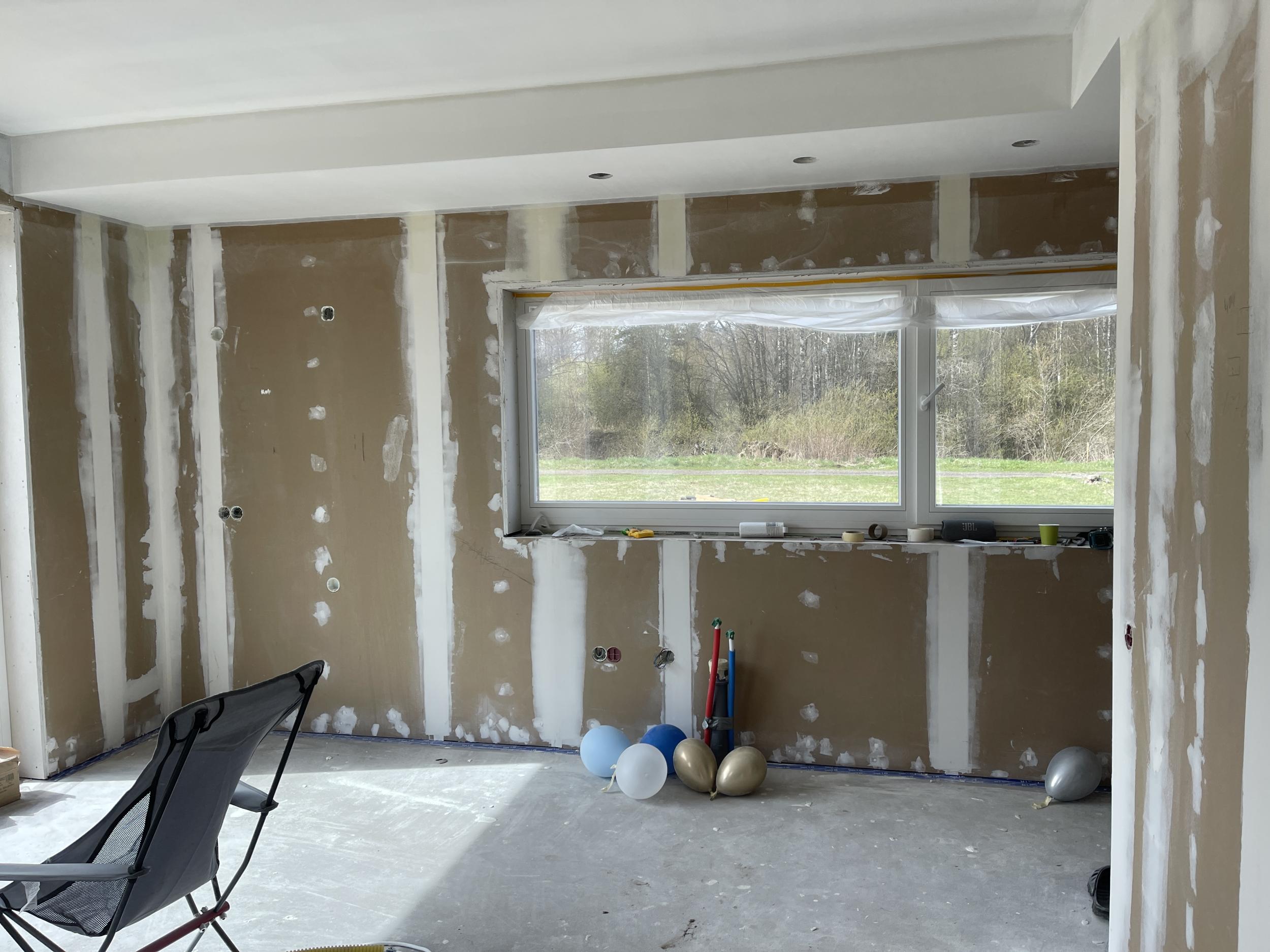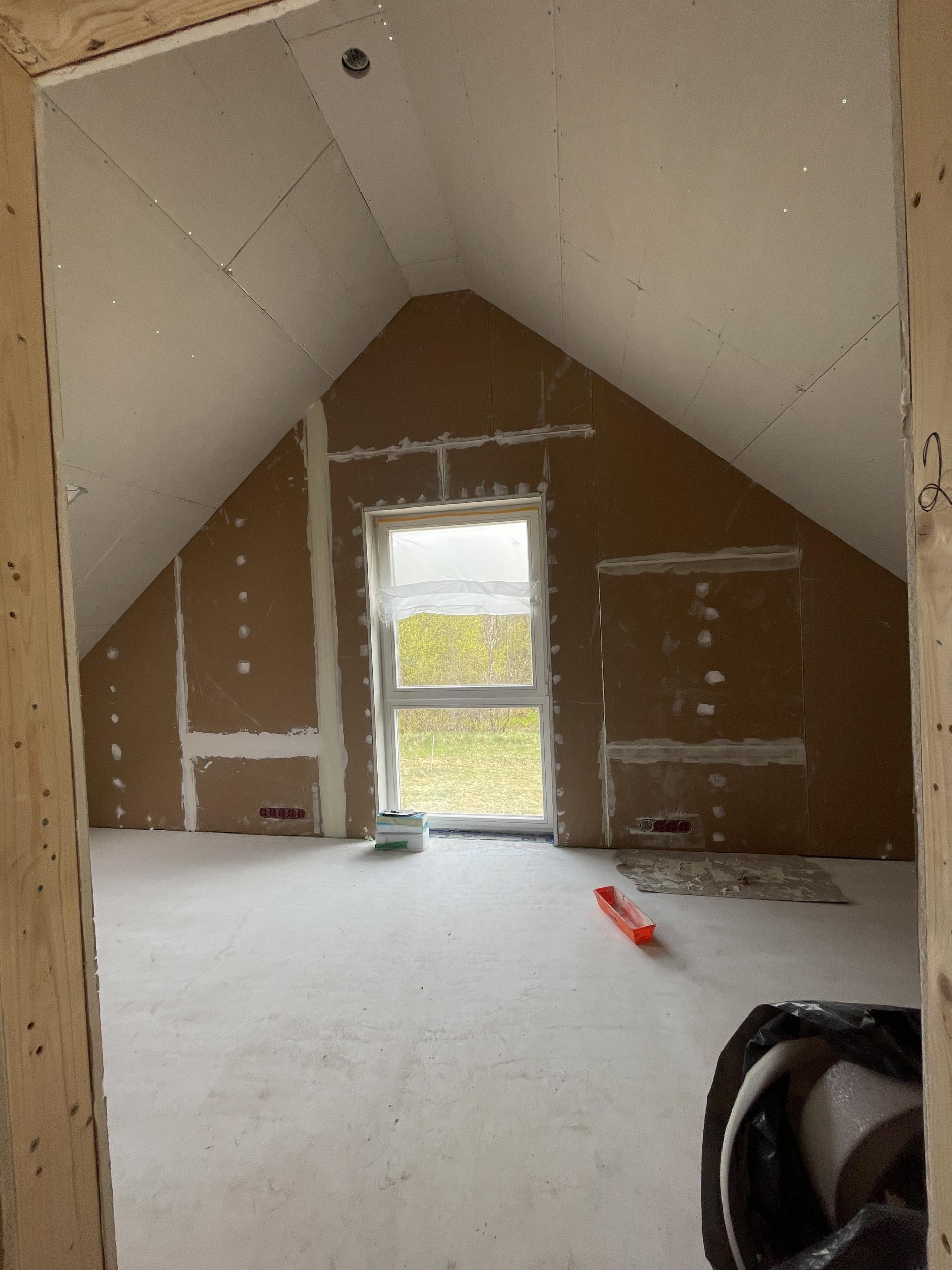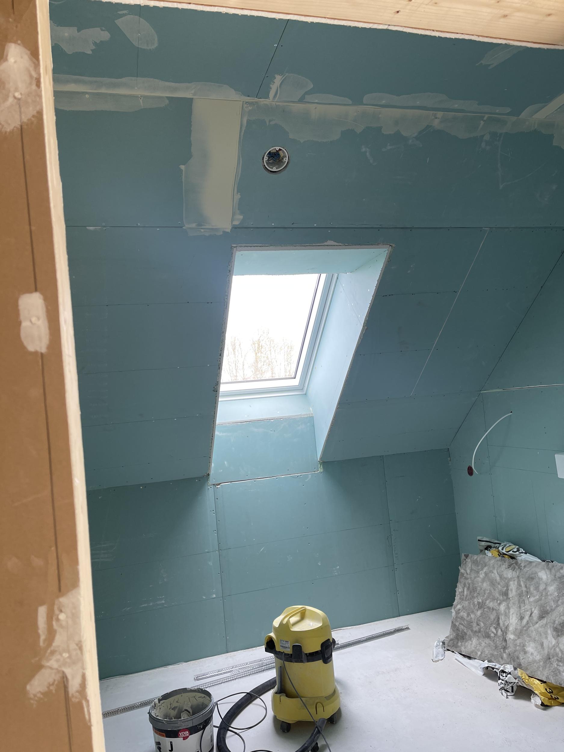 1. korruse laed on pahteldatud, krunditud. Vuugid ja kruvipead töödeldud. Teise korruse üks katuslaega magamistuba pahteldatud, krunditud.