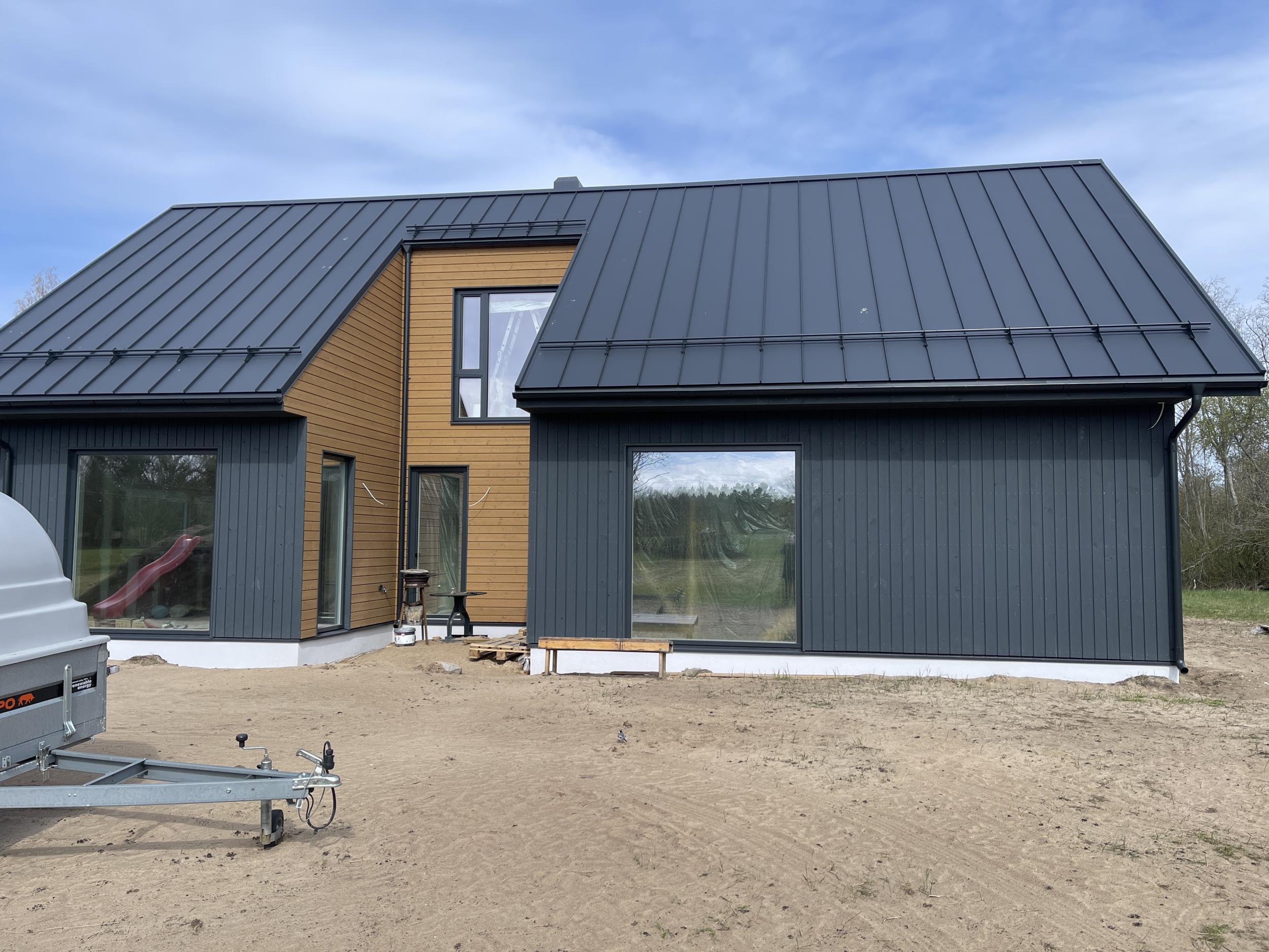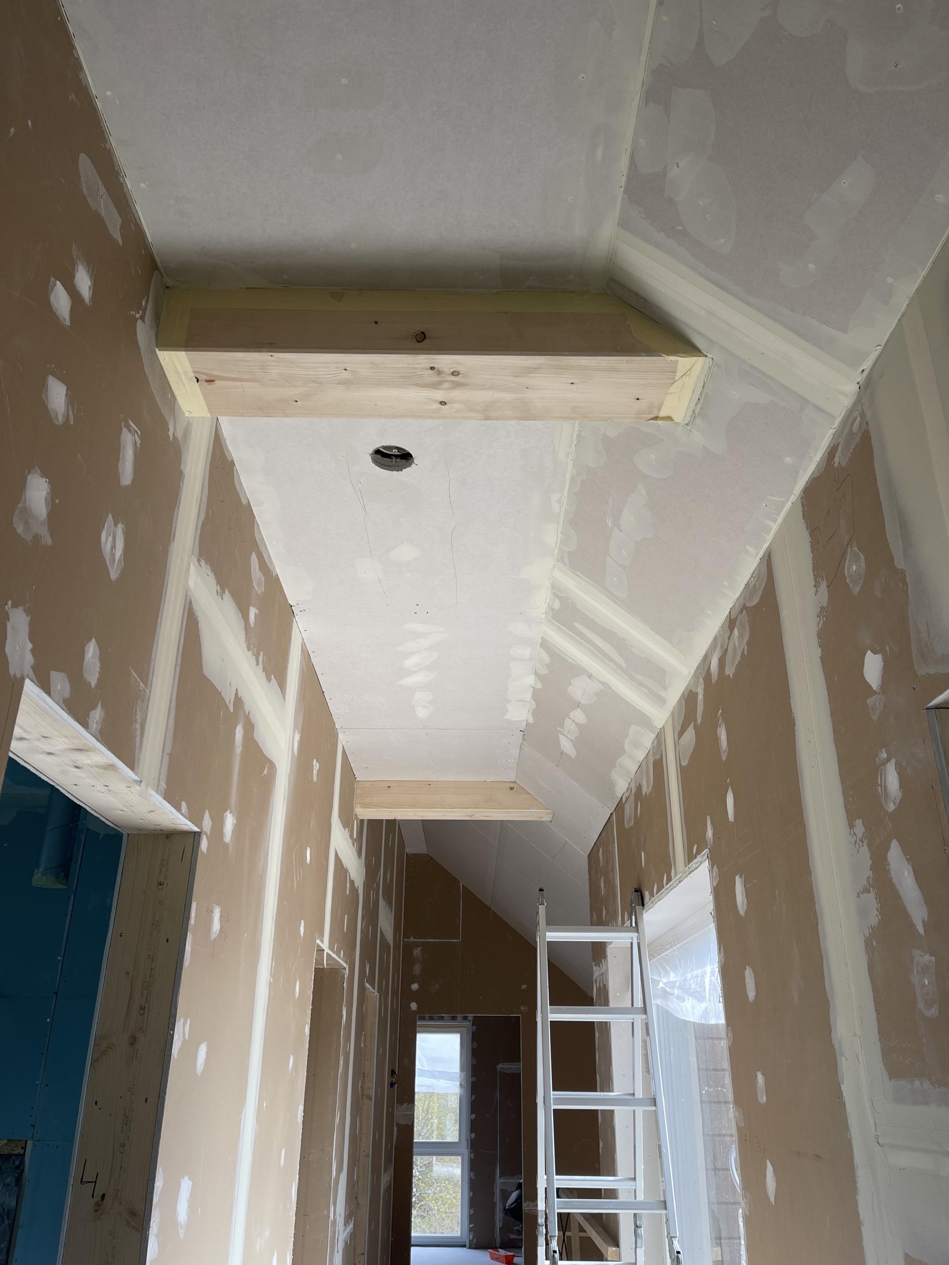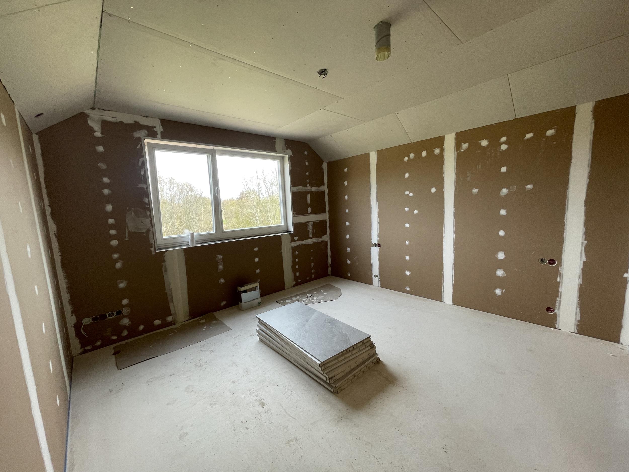 1. korruse laed on pahteldatud, krunditud. Vuugid ja kruvipead töödeldud. Teise korruse üks katuslaega magamistuba pahteldatud, krunditud.