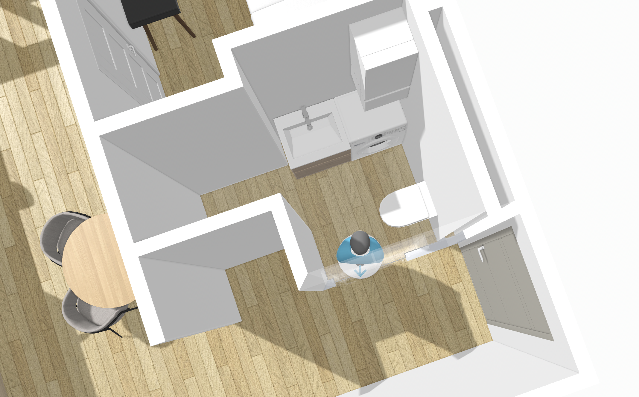 Kuna vana põrand ilmselt jääb alles, siis kaablid vedada põranda serva kaudu, uste alt. Uus kilp korterisse, märgruumidele ja veega seadmetele (nõupesumasin) rikkevoolu kaitsmed. Uute pistikupesade tooside ja soonte freesimine.