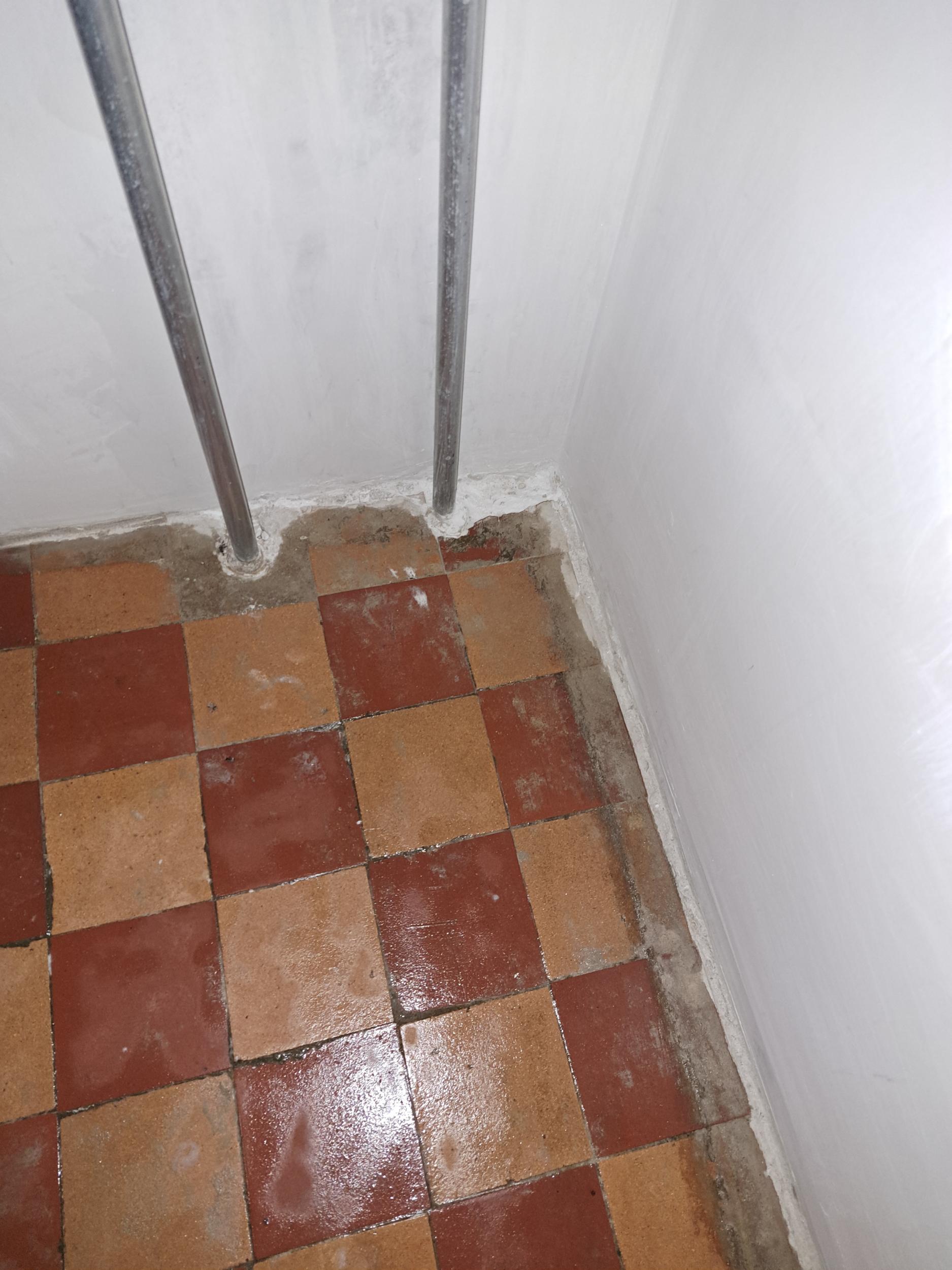Nõukaaegne vannituba kortermajas Tartu linnas. Ühes nurgas läbivad põranda kaks küttetoru ø18 mm. Plaadid eraldi arvega, Kiilto hüdroisolatsioonitooted olemas. Mida varem, seda parem.
