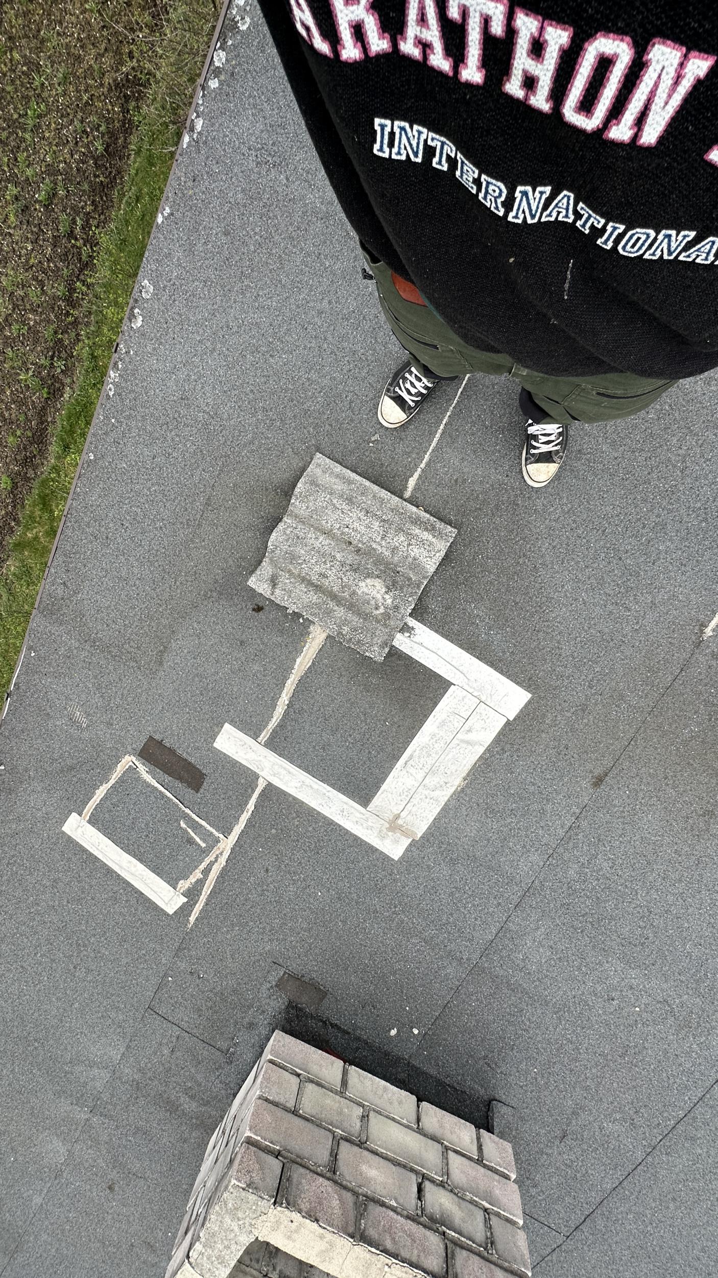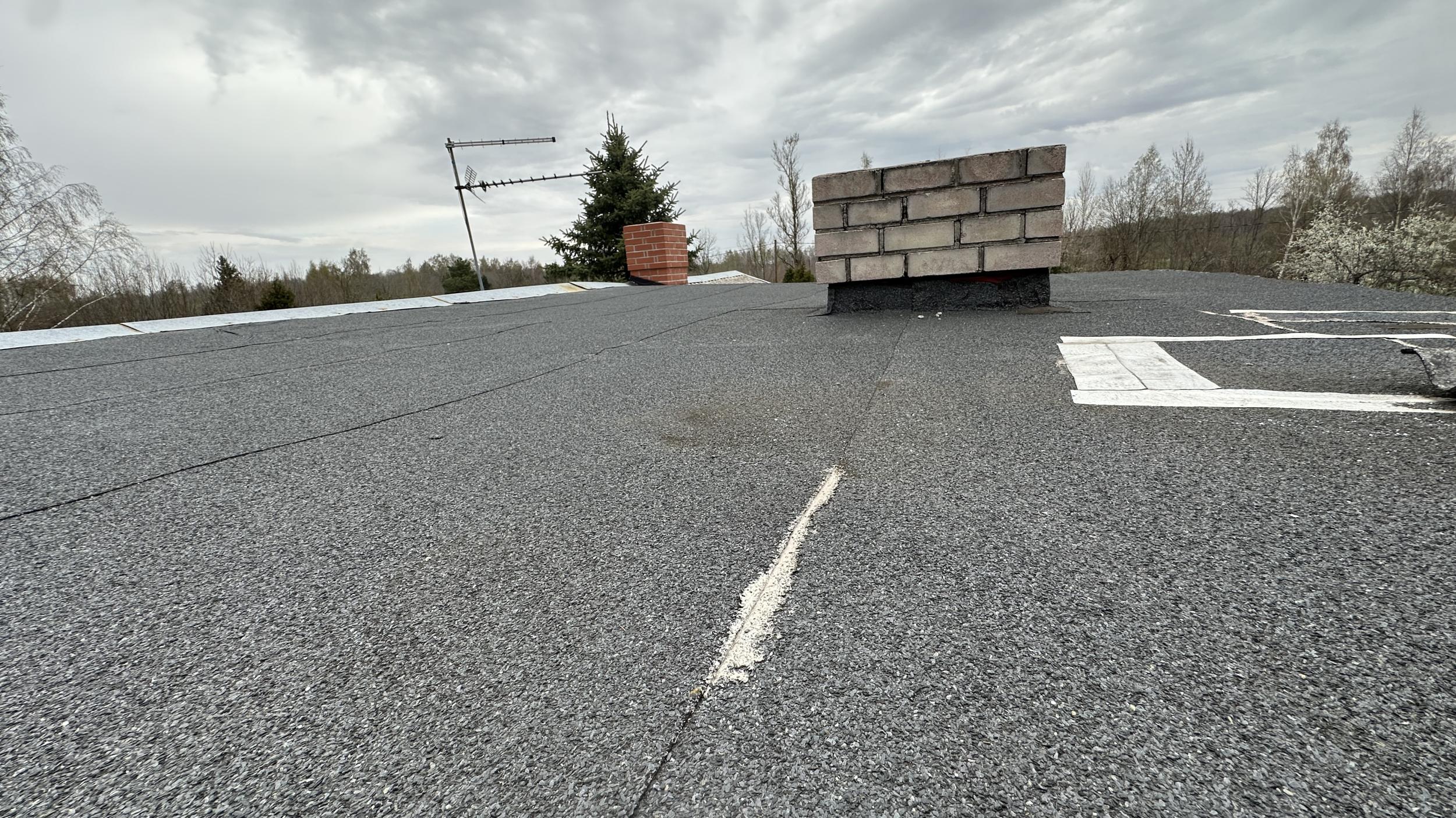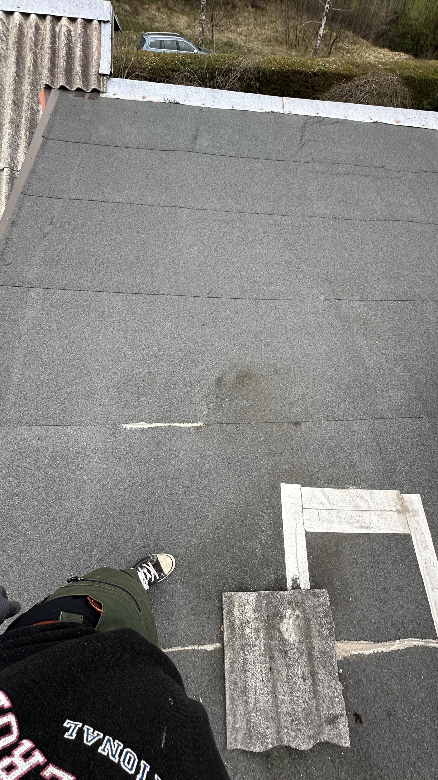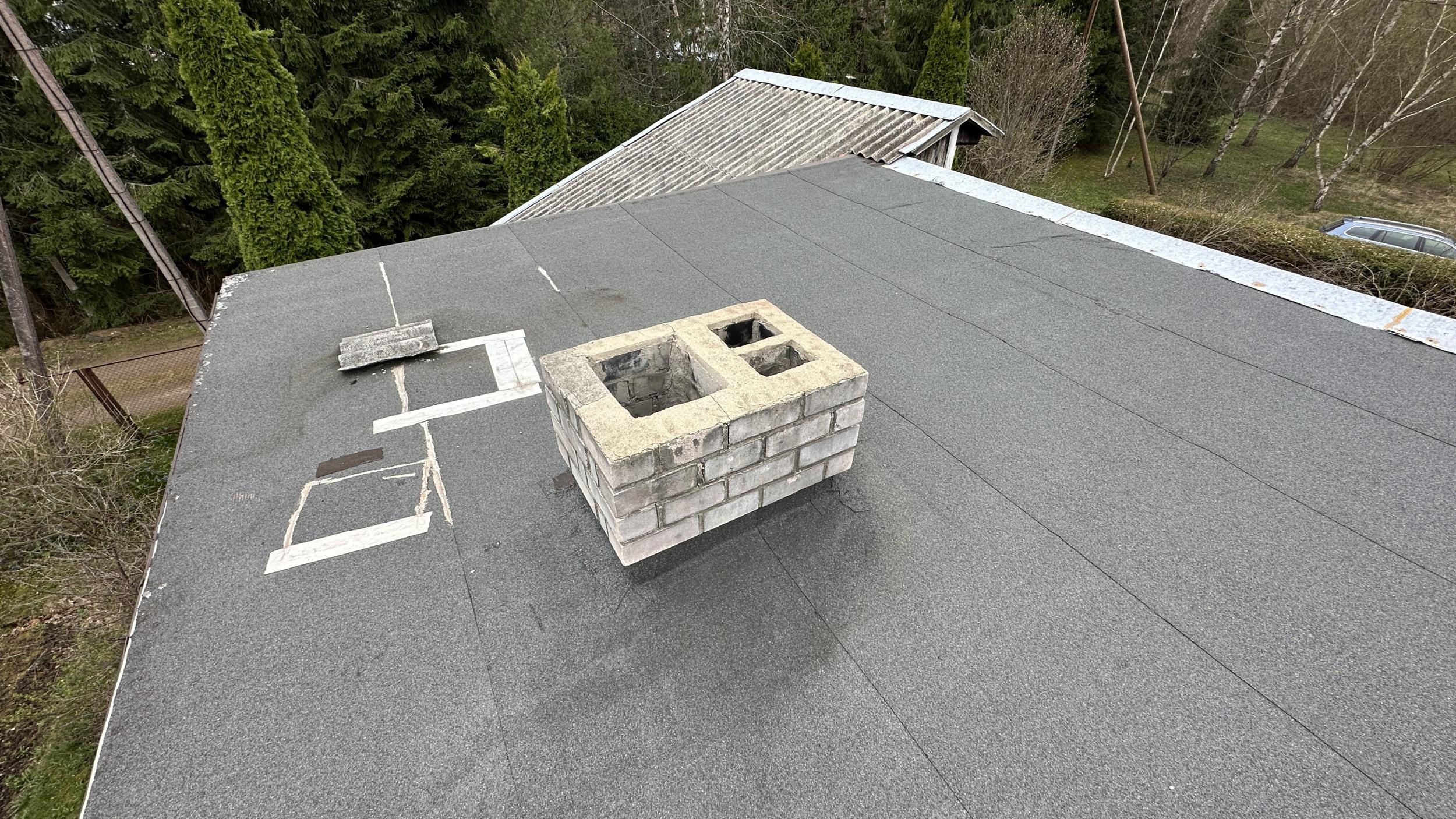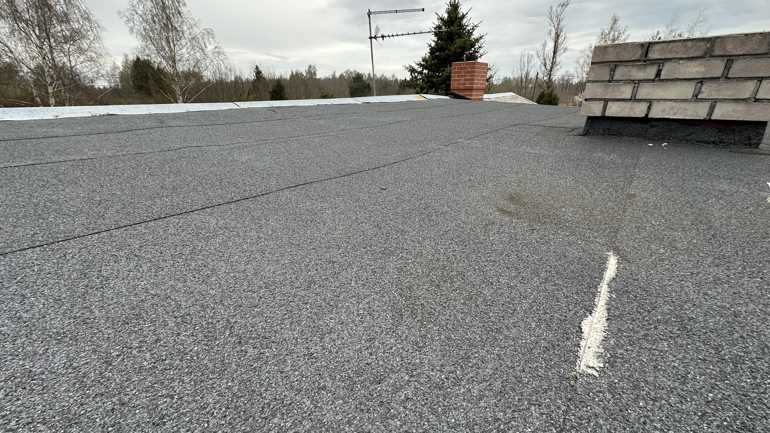 Algupäraselt paigaldatud plekk, hilisemalt kaetud rullmaterjaliga. See talv paistis, et on vett läbi tulnud ja tuleks üle vaadata, mis tegema peab, et vesi kindlasti tuppa ei tuleks.