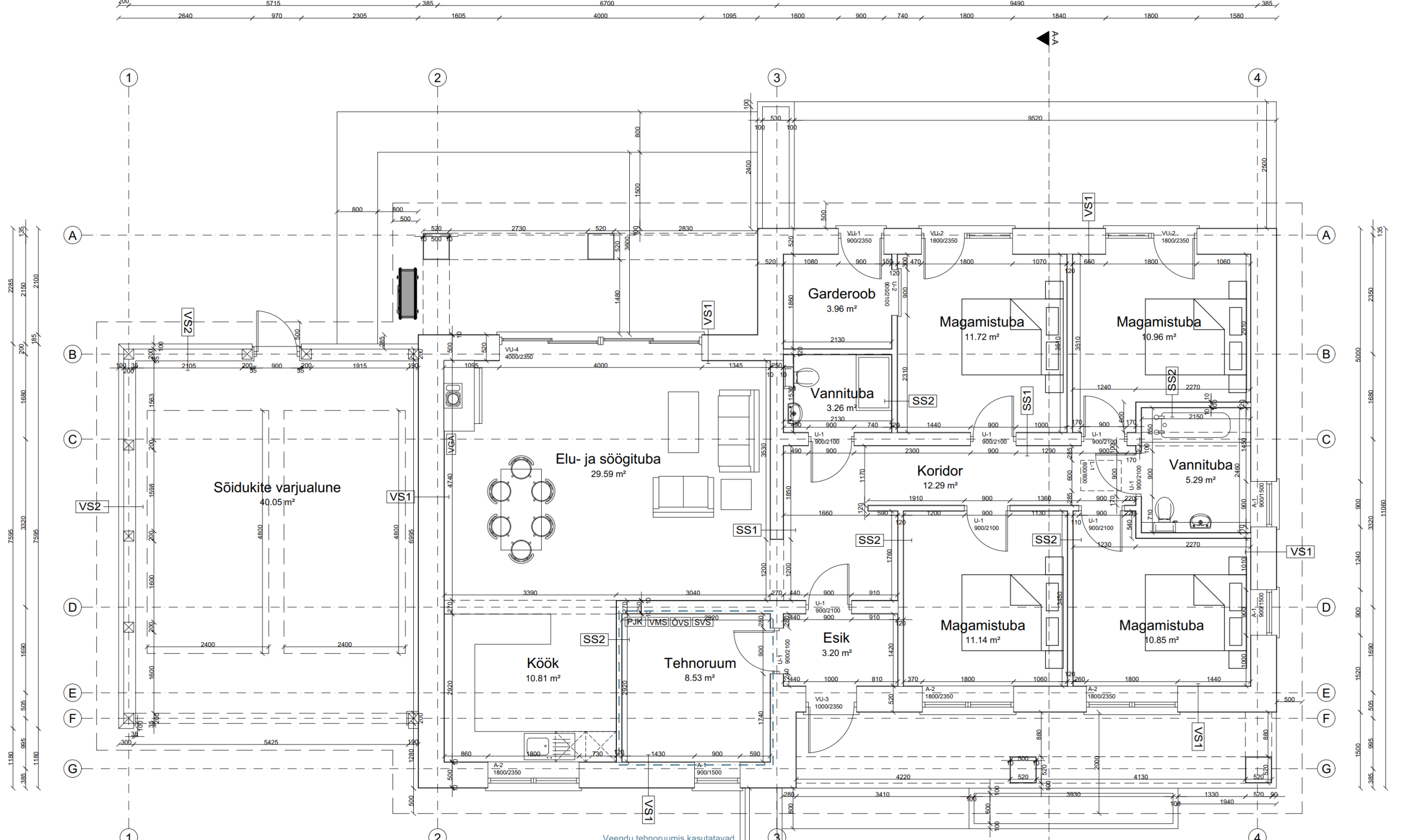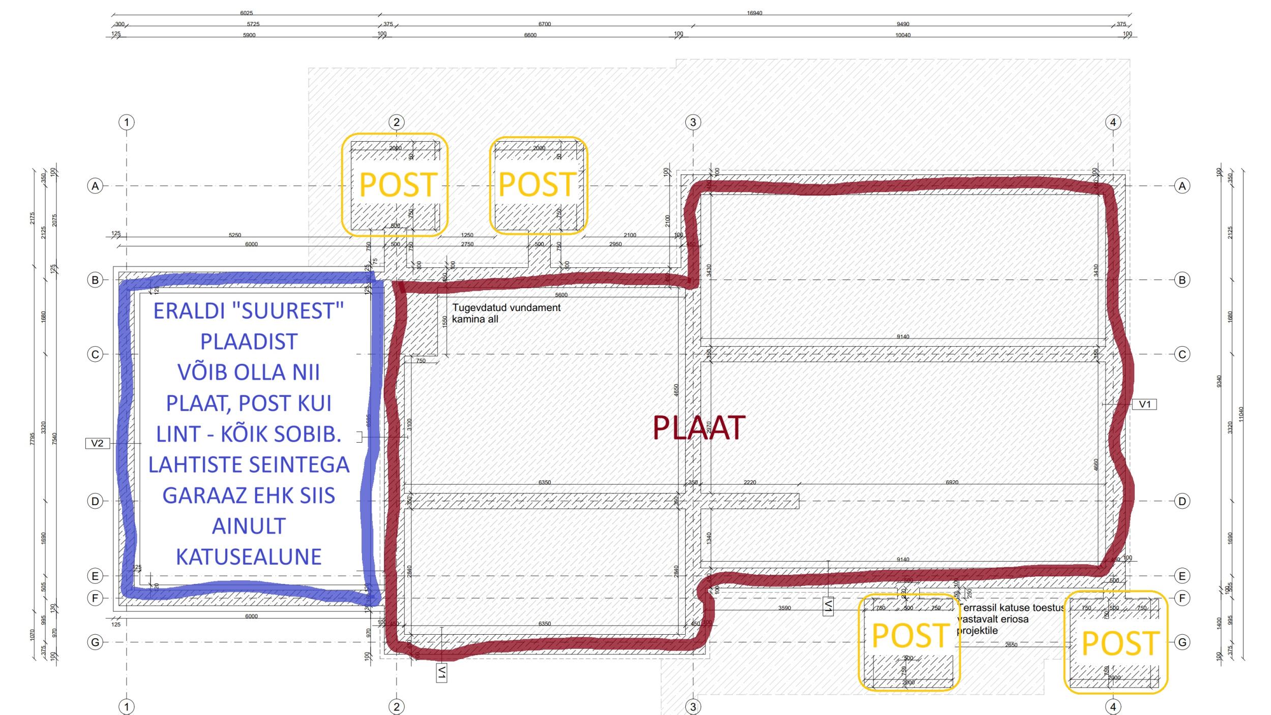 Olemas eelprojekt ja asendiplaan (dwg joonised on ka olemas kõige kohta). Pinnas on saviliiv- ja liivsavimoreen (kihi tüsedus 13m, kihi lamami sügavus 13m). Seinad on plaanitud bauroc ECOTERM+ 500 kivist, plekkkatus, ühekordne hoone. "Garaaz" on lahtiste seintega katusealune, Samuti sooviks võimalusel lahenduse kirjeldust ka vundamendi drenaažile. Rohkem ei oska hetkel midagi lisada, kui on lisainfot vaja siis palun küsige.