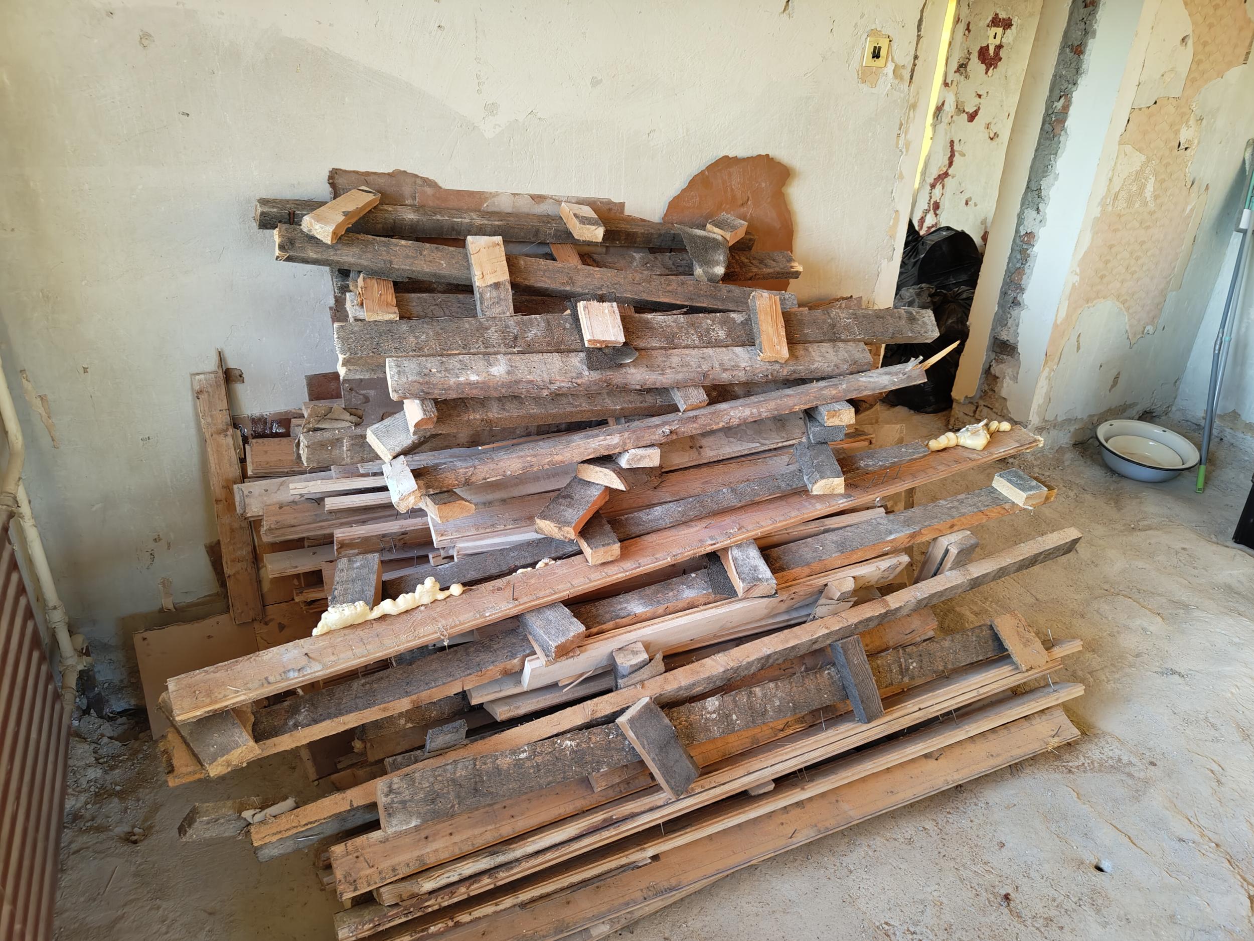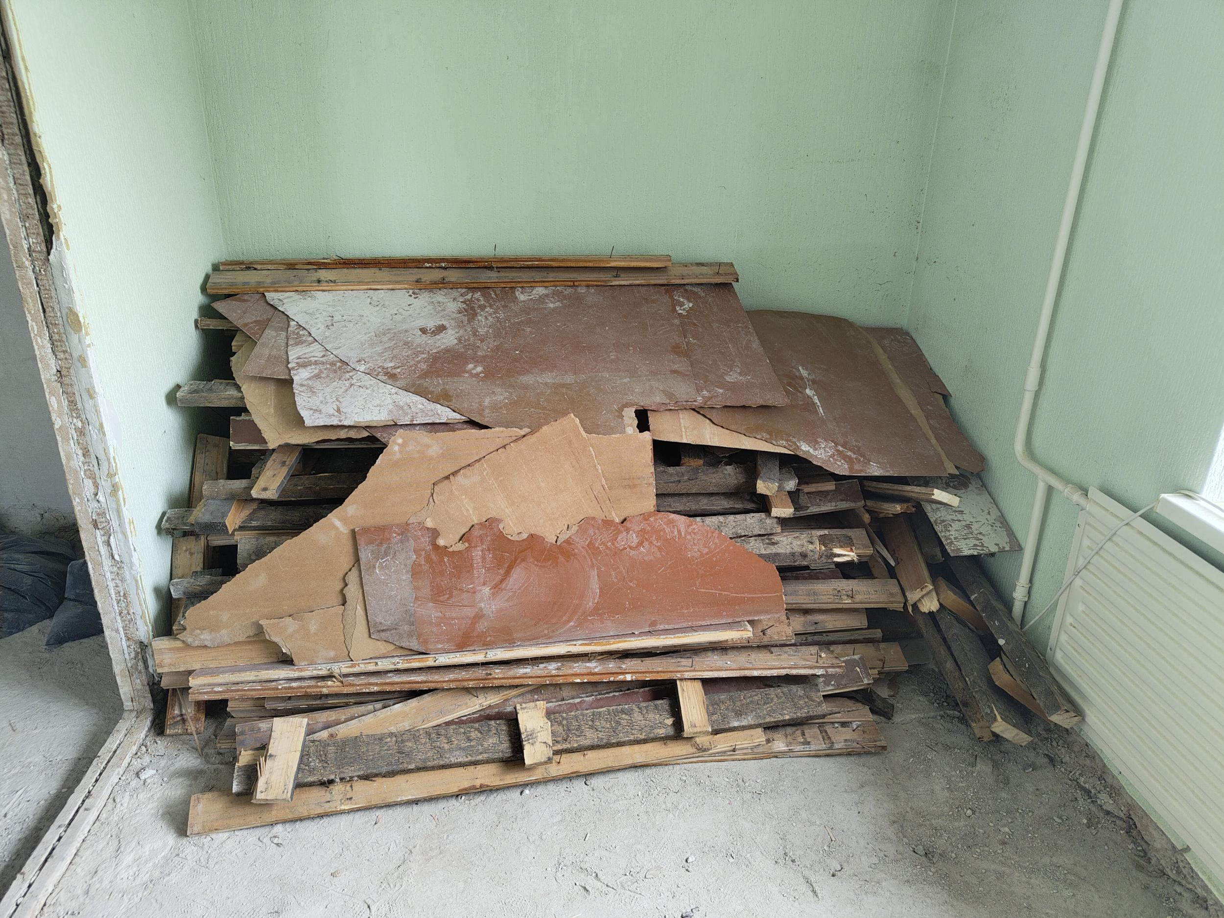 Tarvis korterist välja viia ja utiliseerida kaks hunnikut põrandapuitu. Lift on olemas. Tuleb eriti ettevaatlikult viia, et ei kraabiks koridori ega lifti seinu, kuna puidu juppidel on naelad sees. Transport peaks olema teostaja poolt. Konteineri toomine ei ole variant.