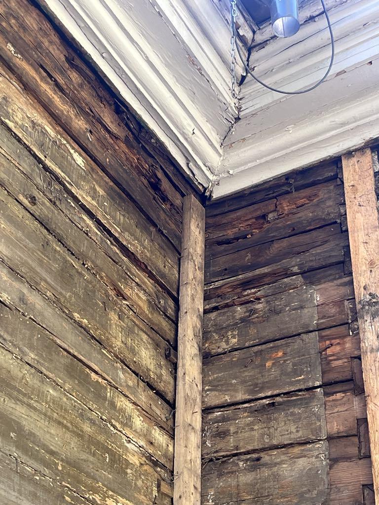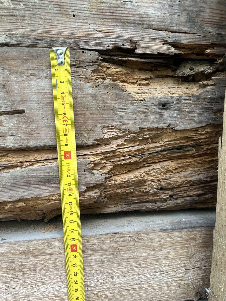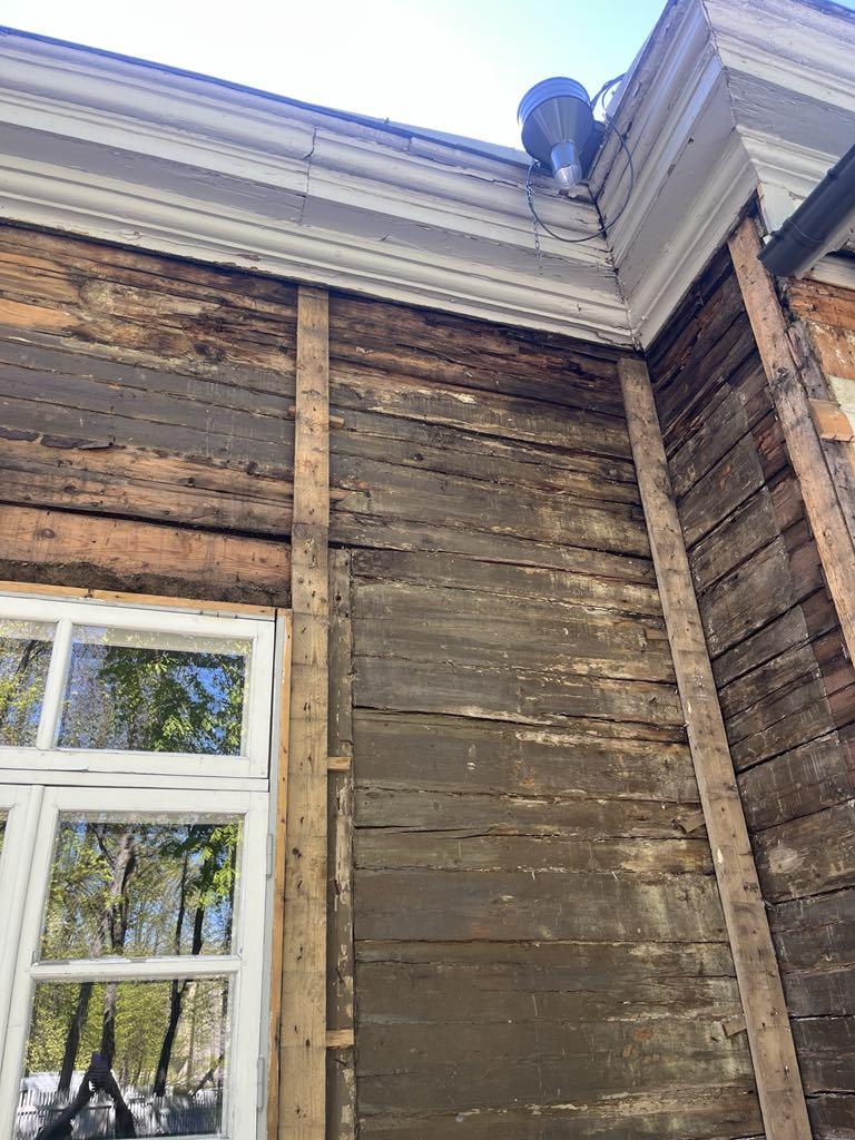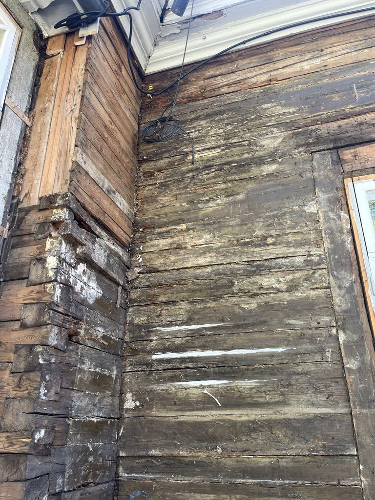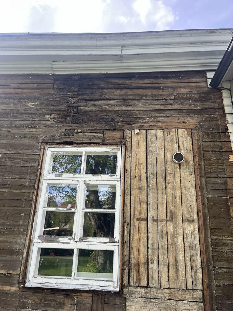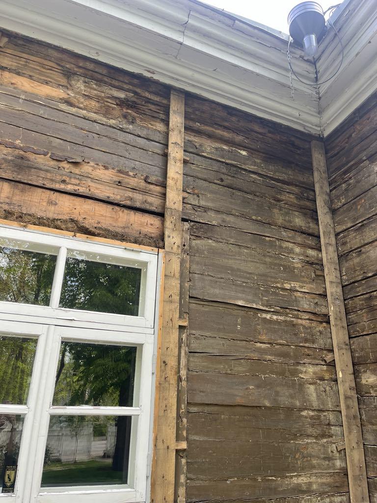 Vana suvemõis. Fassaad on eemaldatud ja selgus, et mõned kohad/palgid mädad ja vajavad vahtust/plommimist.