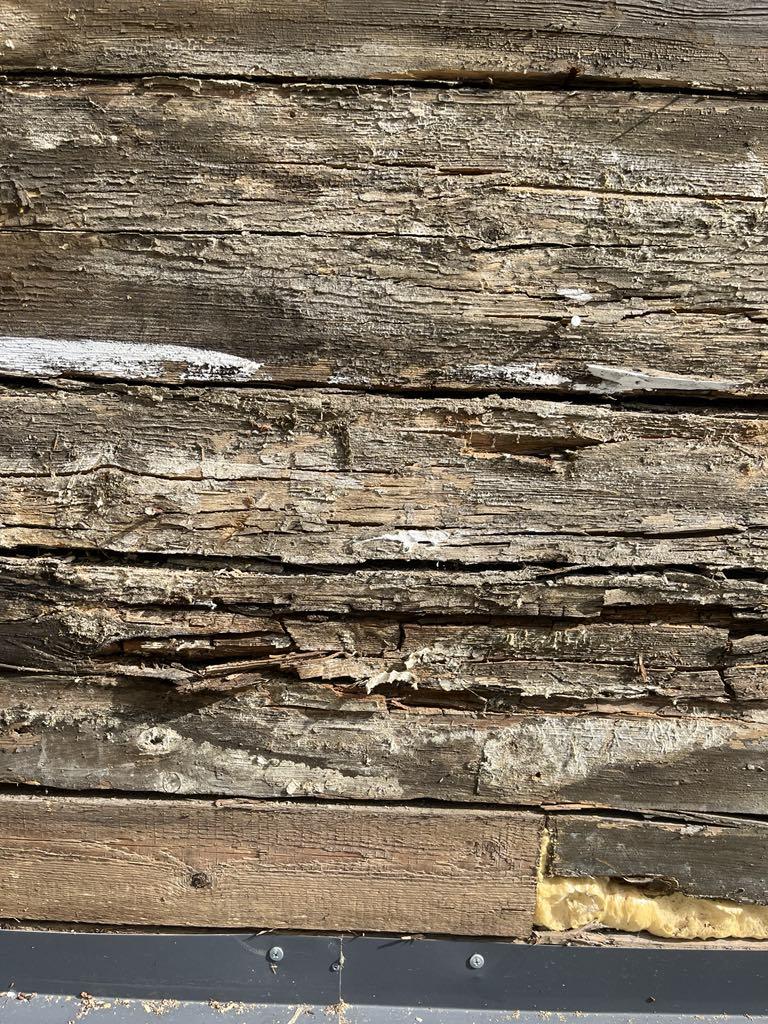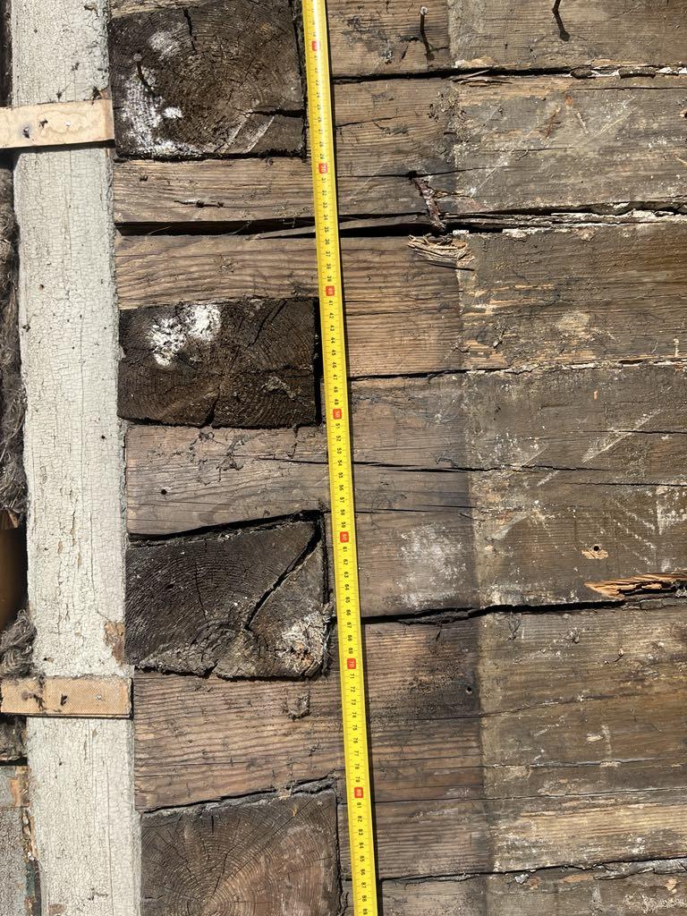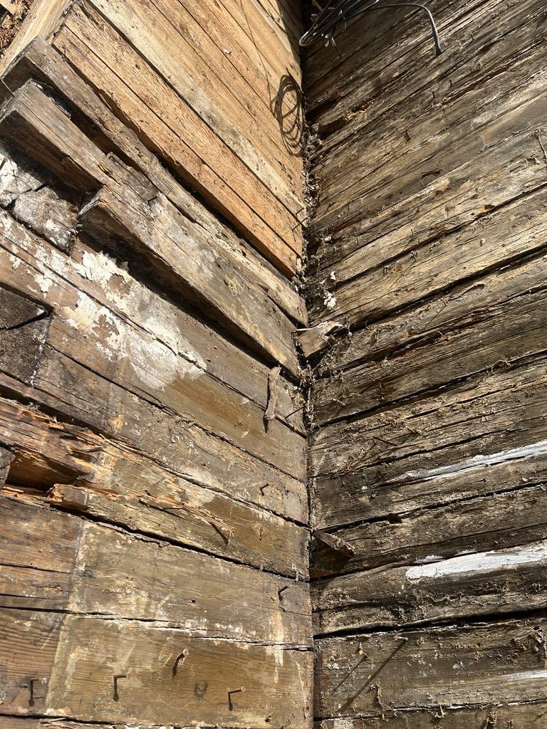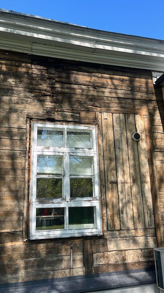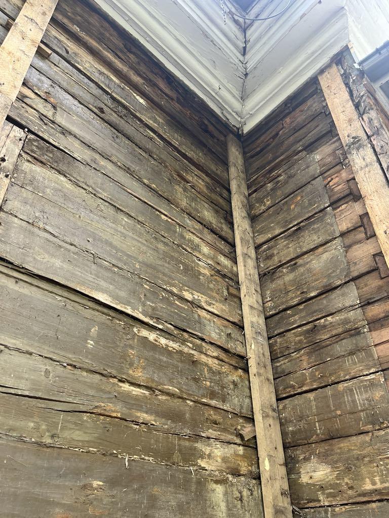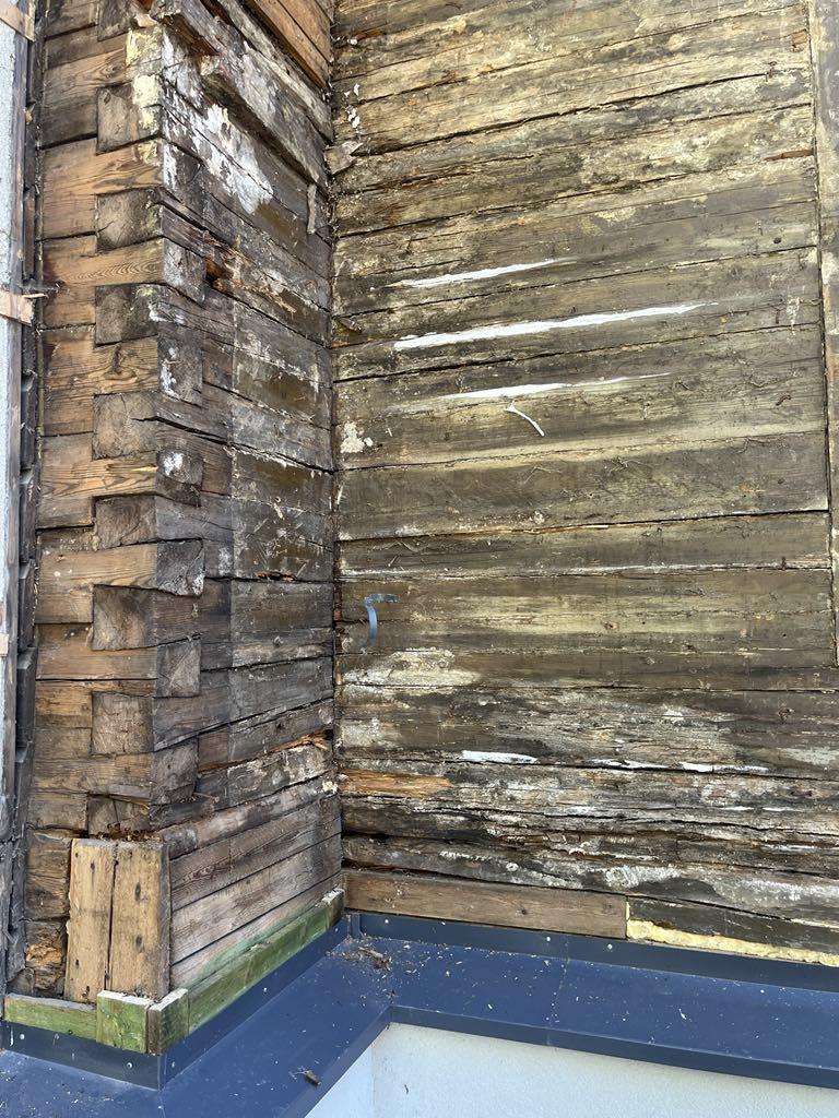 Vana suvemõis. Fassaad on eemaldatud ja selgus, et mõned kohad/palgid mädad ja vajavad vahtust/plommimist.
