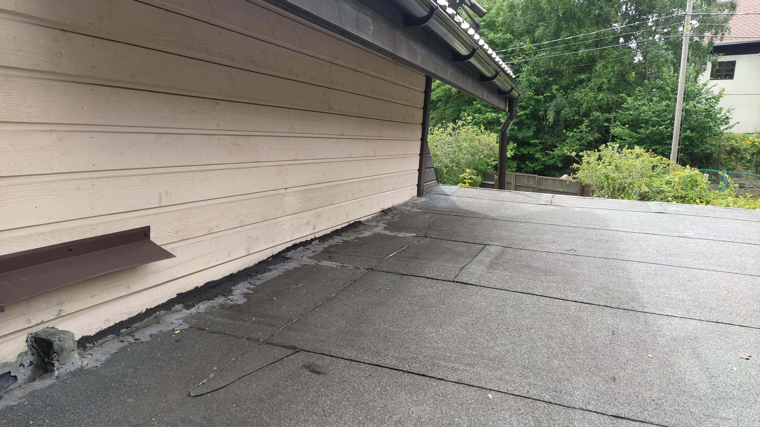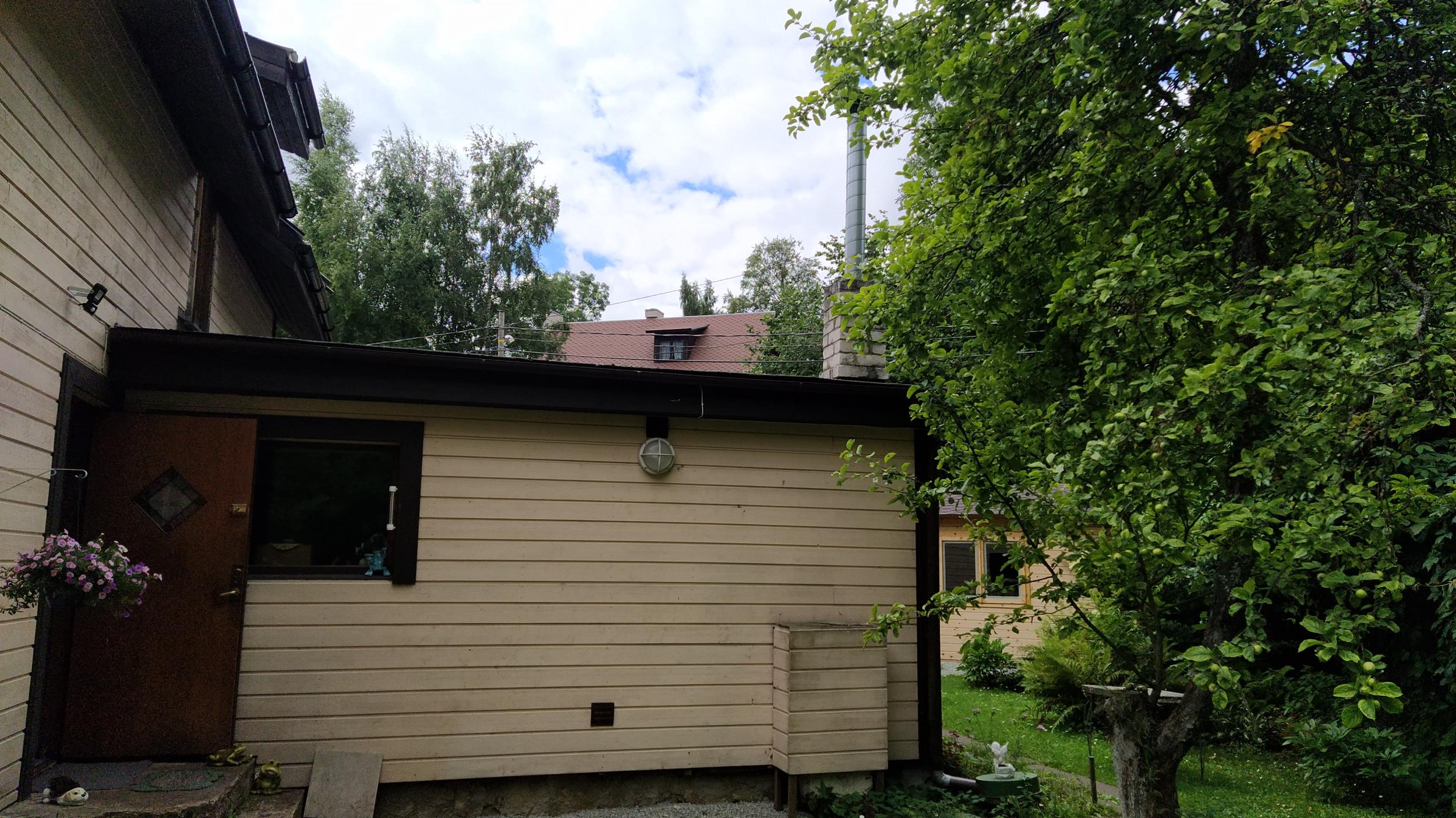 Momendil laseb katus ilmselt voodriga liitekohast vett veidi läbi ja on kaitstud kilega. Maja voodriga liitekohal on vaja vahetada ka mõned lauad. Seda täpsustaks kohapeal spetsialistiga. Võimalusel võin ise vahetada. Voodrilauad on olemas.
