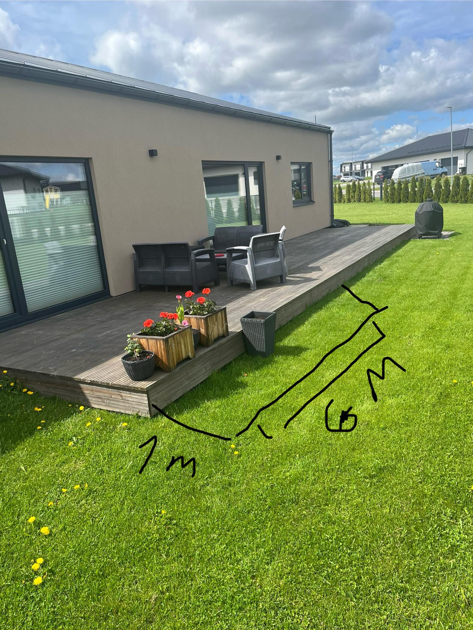 Terrassi laiendus 6x1 meeter, lisaks laiendusele teha aste (ettekujutus pildil) Ideaalis samasugune terrassilaud nagu pildil. Olemasolev terrass valatud postidel.