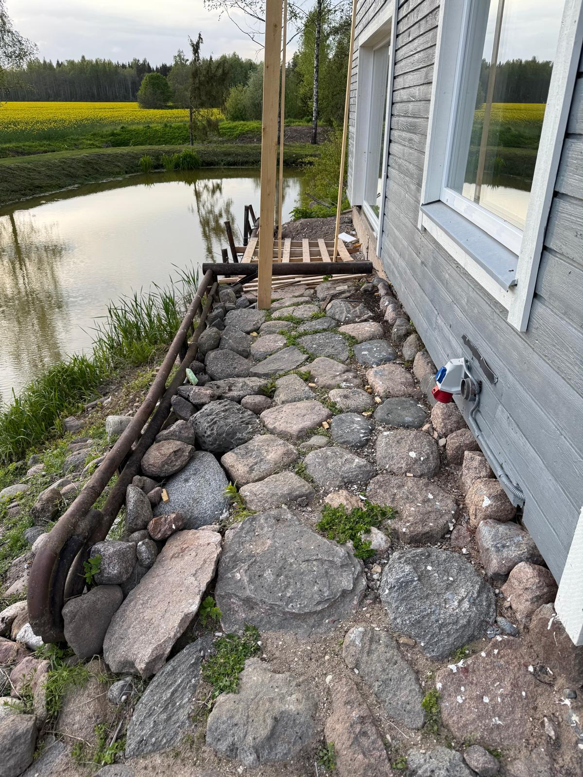 Tööde objekt asub saunahoone tiigipoolsel küljel, kus kallas on kohati vajunud või varisenud. Pildil näha olevad raudtorud tuleb valada betooni sisse.