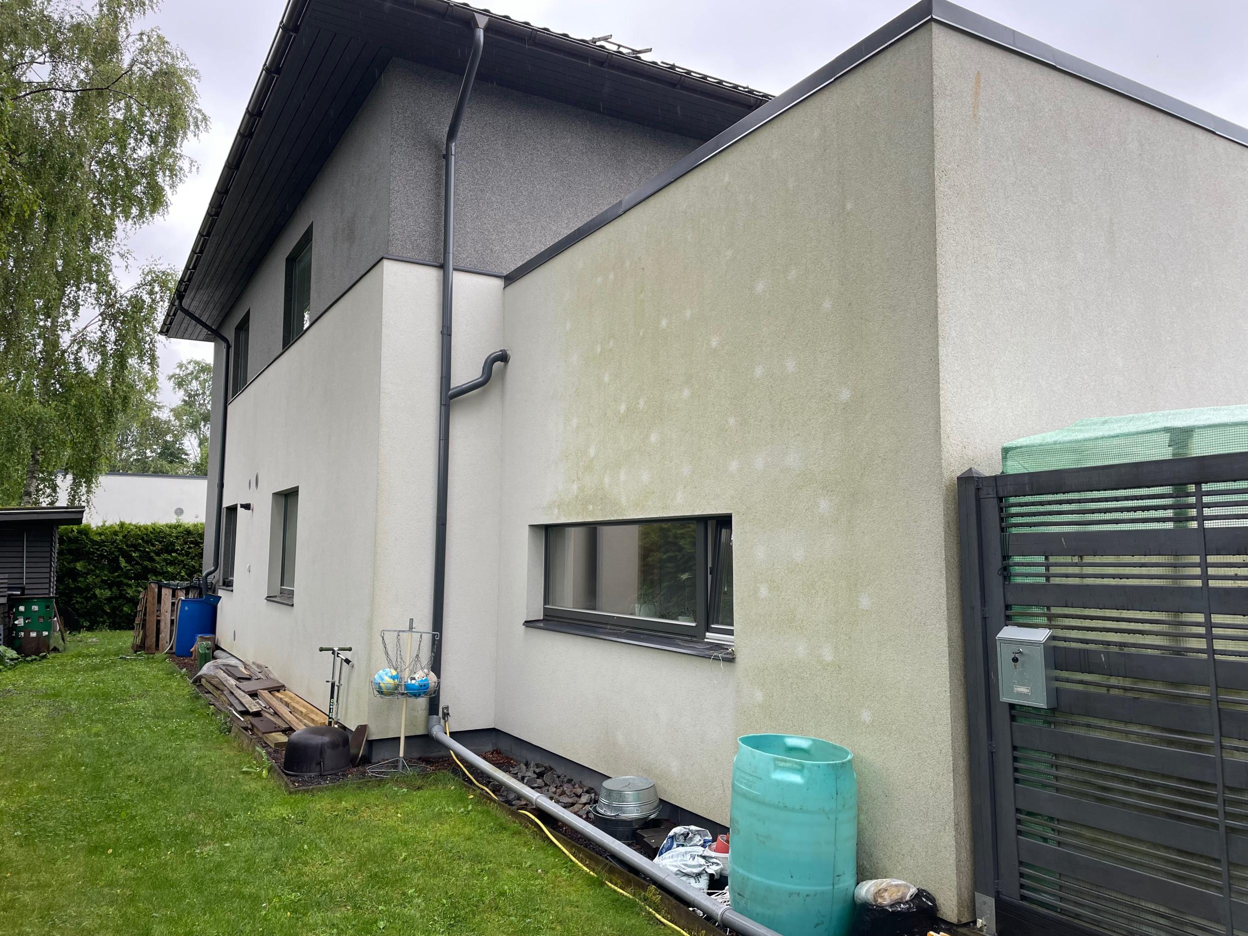 Nagu fotodelt näha, siis vajab pesu valge krohvi osa, tumedaga probleemi pole. Sama puhastust vajaks ka aed.