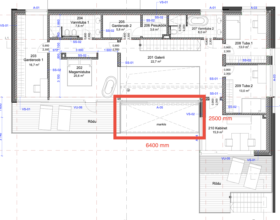 Palun tarnida ja paigaldada motoriseeritud markiis eramaja fassaadile (objekt on hetkel ehitusjärgus). Markiis peab avatud olekus katma ala 6400 mm (laius) × 2500 mm (väljeulatus) ning töötama elektrimootoriga, millel on sisseehitatud raadiovastuvõtja kaugjuhtimispuldiga või mobiilist juhtimise võimekus.
