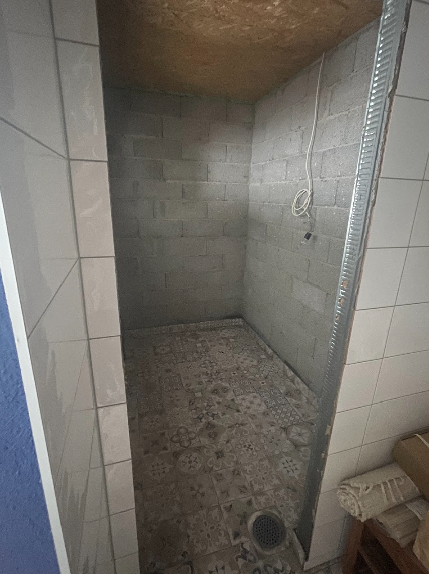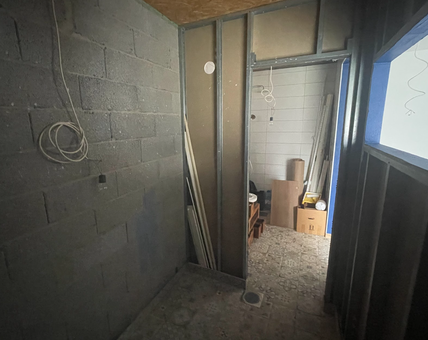 Põrand on valatud, olemas ventilatsiooniavad, seinakarkass, must lagi ja kerise juhe.