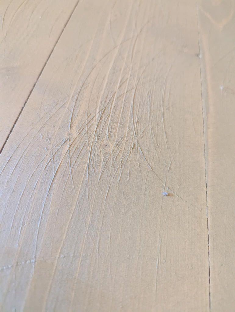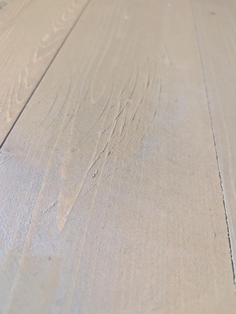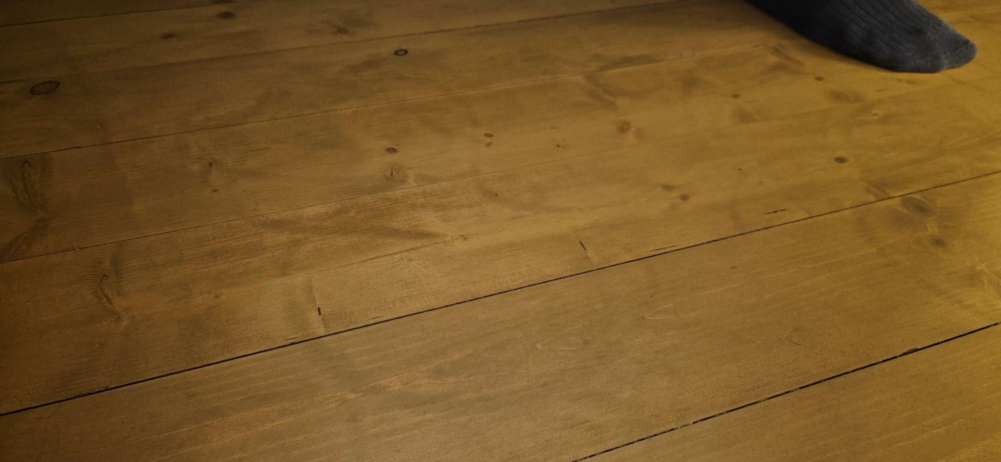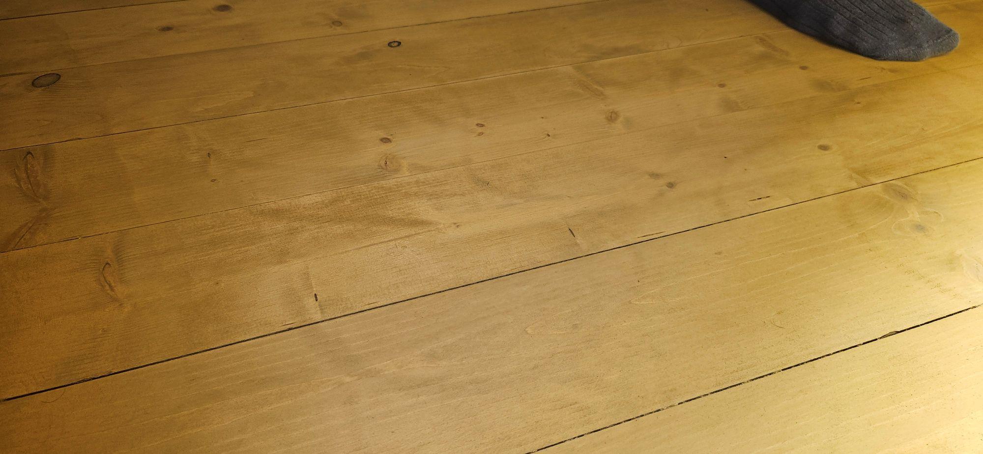 Tellisime 20m2 põrandate taastamiseks töömehelt teenuse. Tuli suure lihvimismasinaga kohale. Esimese lihvimise, peitsime ja lakkimise järel oli pool põrandat kaetud suurte, kõrgete lihvimisrantidega. Leppisime kokku, et teeb pool põrandat uuesti. Selle tagajärjel on põrandal väikesed ringid, mis imavad rohkem peitsi ja jäävad tumedamad. Põrand on vaja täielikult uuesti lihvida.