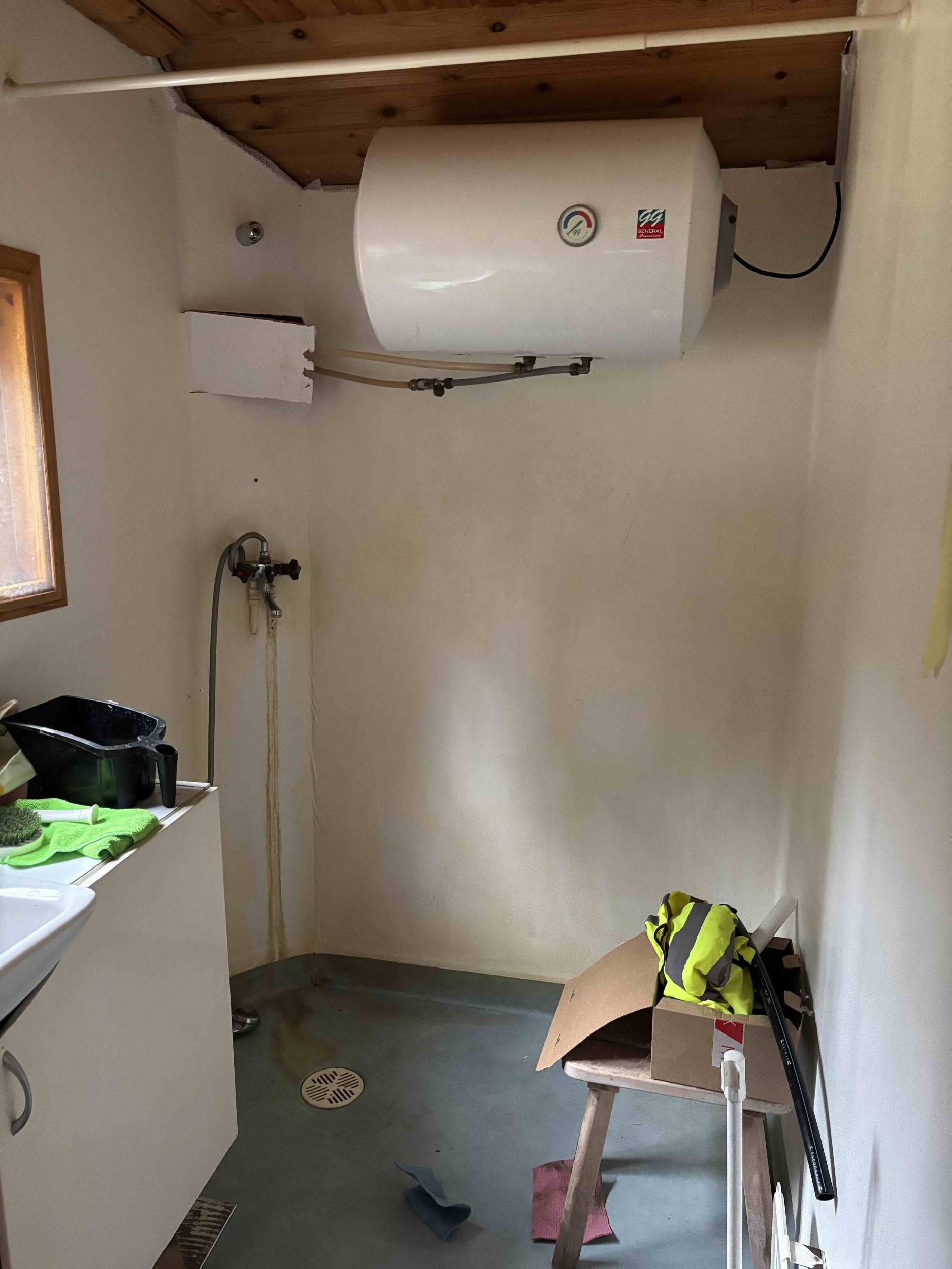 Paigaldada ujued torud (ilmselt Aluplex 16), joonisel näidatud kohast tuleb külm vesi sisse. Külm vesi peab minema boilerisse, kraanikaussi, dushi ja WC potti. Boilerist peab minema soe vesi kraanikaussi, dushi, vannitoast külma vee tuleku suunas teises toas olevasse köögikraani ja edasi sauna. Sauna peab minema ka külm vesi. Sauna minevad torud on olemas, tuleb teha üleminekud.