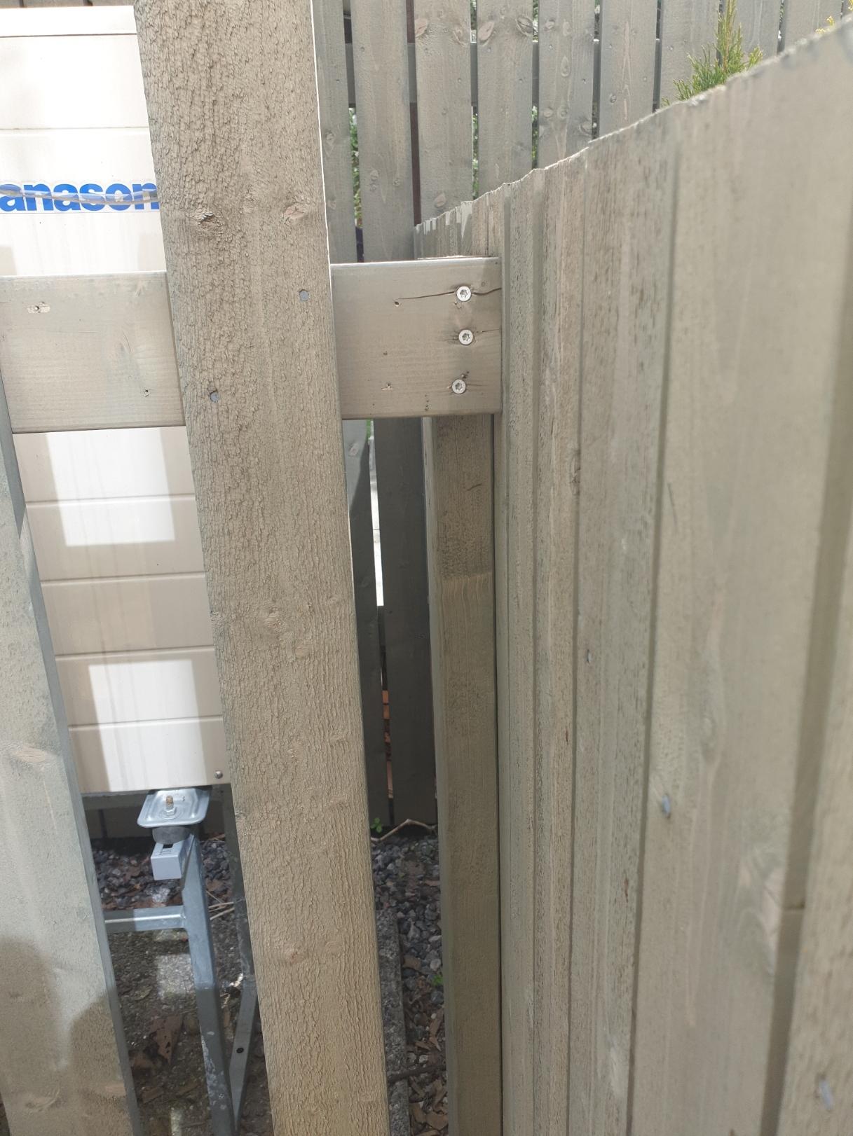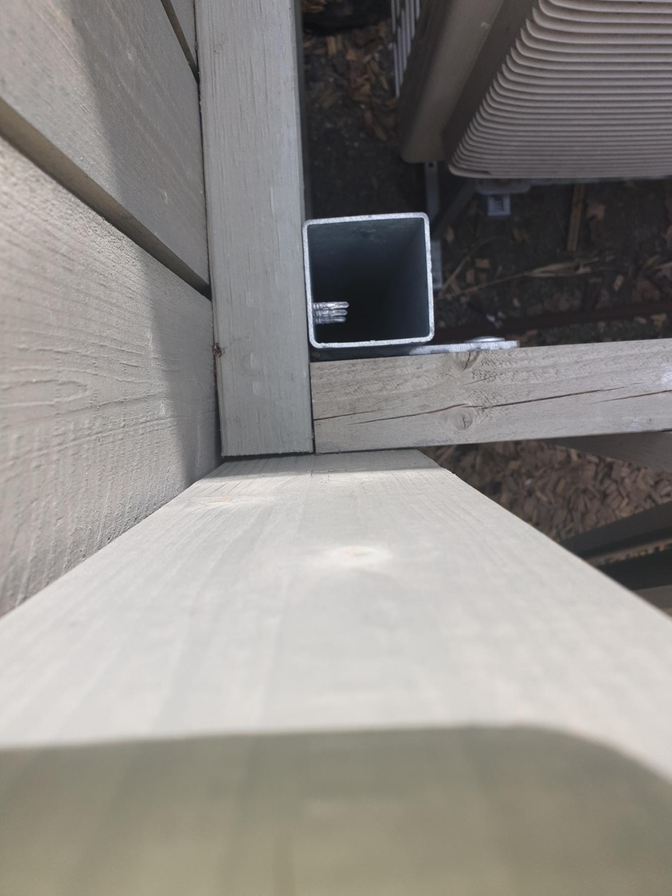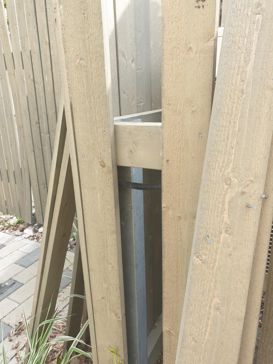Vaja on esisein (pilt 1) eest ära võtta ja panna konksude peale, et kui hooldaja tuleb, siis tõstab lihtsalt piirde eest ära. Parempoolse konksu paigaldamisega pole probleemi, aga vasakpoolsega (Pilt 3) vaja lahendus välja mõelda, et see korrektne ka välja näeks. Pilt 4 on tehtud vasakpoolsest nurgast ülevalt alla.