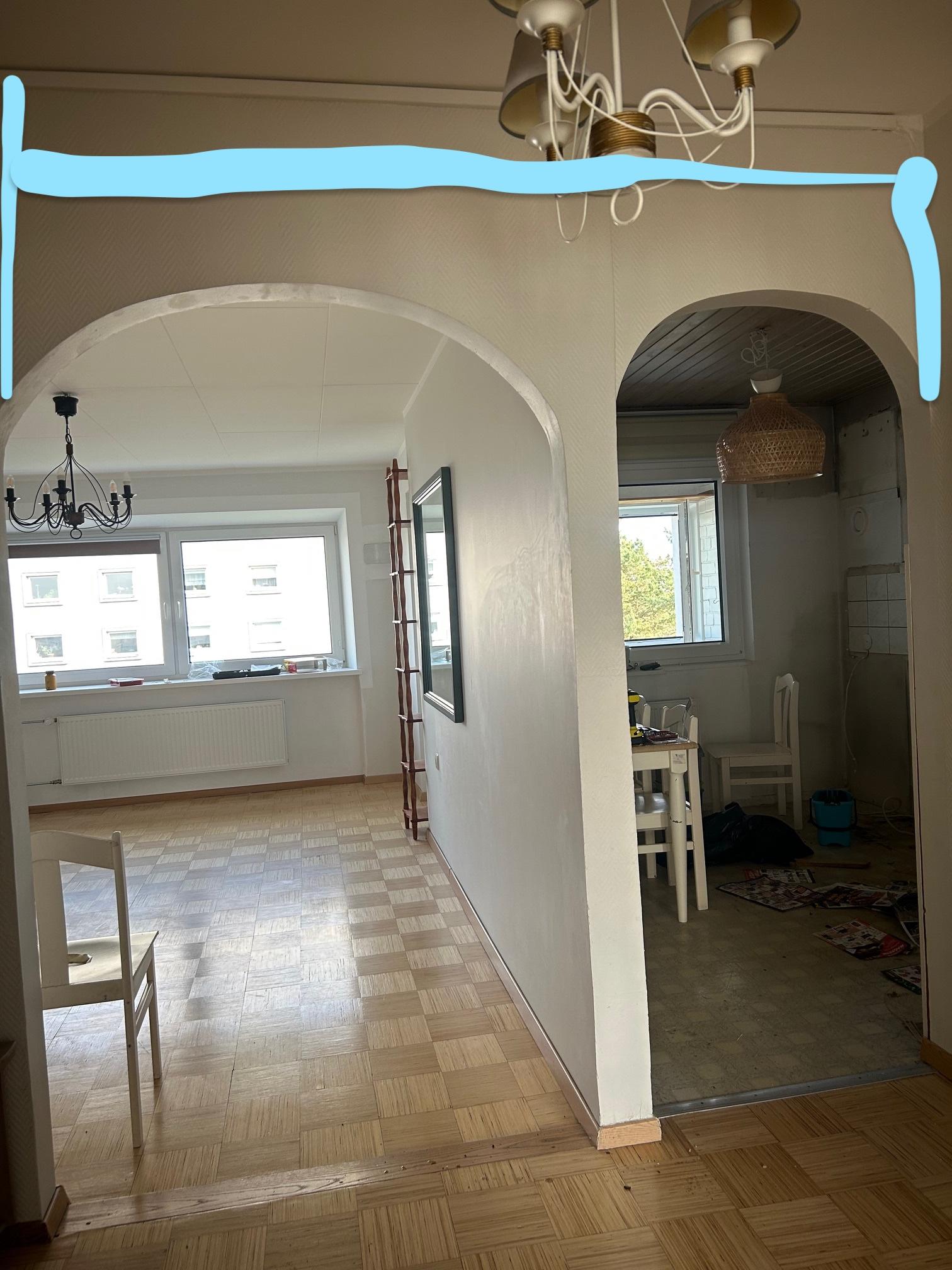 Kivimajas, neljandal korrusel. Ei ole kandev sein, kuid oleks vaja projekti, et hiljem registrisse kanda. Põranda katan ise, tekkiv prügi peaks töö tegija utiliseerima.