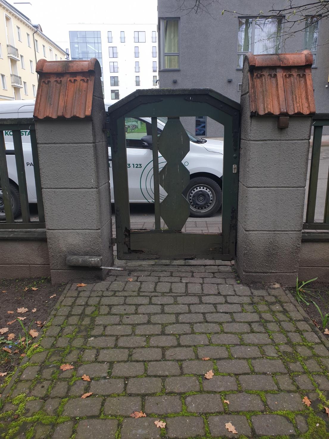 Olemasolev jalgvärav on läbi mädanenud. Raam ja keskmine sakiline iluvarb on alles, mõõdud saab nende pealt tõtta. Metalltugevdused saab samuti vanalt väravalt võtta (puhtaks teha ja värvidamustaks). Väraval on fonolukk. Värava sulguri jaoks peab kinnitus olema, sulguriga tegeleme ise.