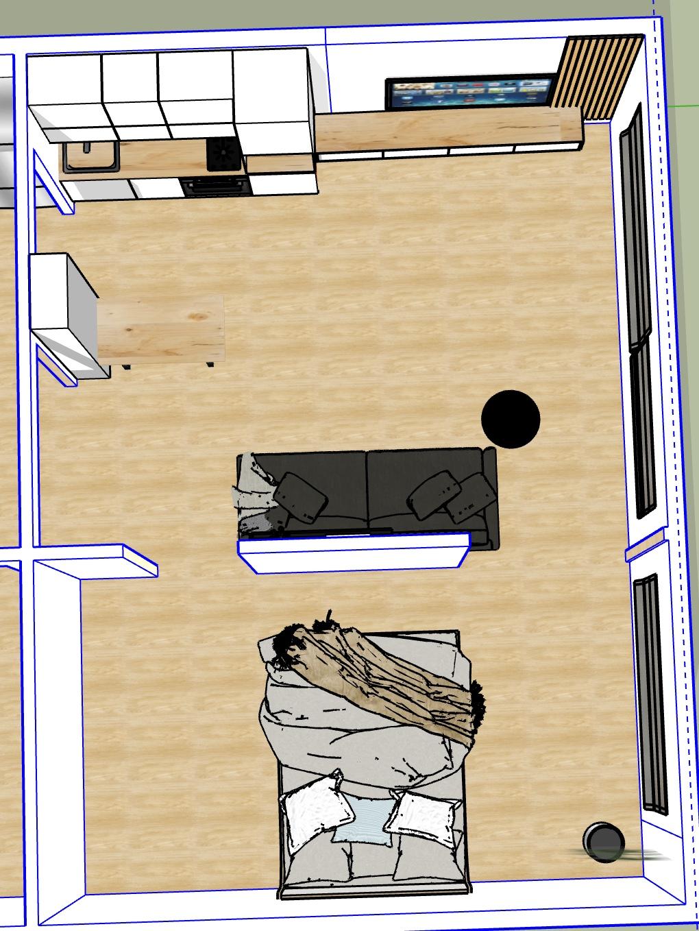 Tegu õlitatud puitspooniga parkeiga. Põranda pinda 30 ruutmeetrit. Kokku 2 tuba, mis on omavahel ühenduses. Magamistoas on voodi ja sisseehitatud kapp. Elutuba-köögis on diian ning köök ning TVkapp.