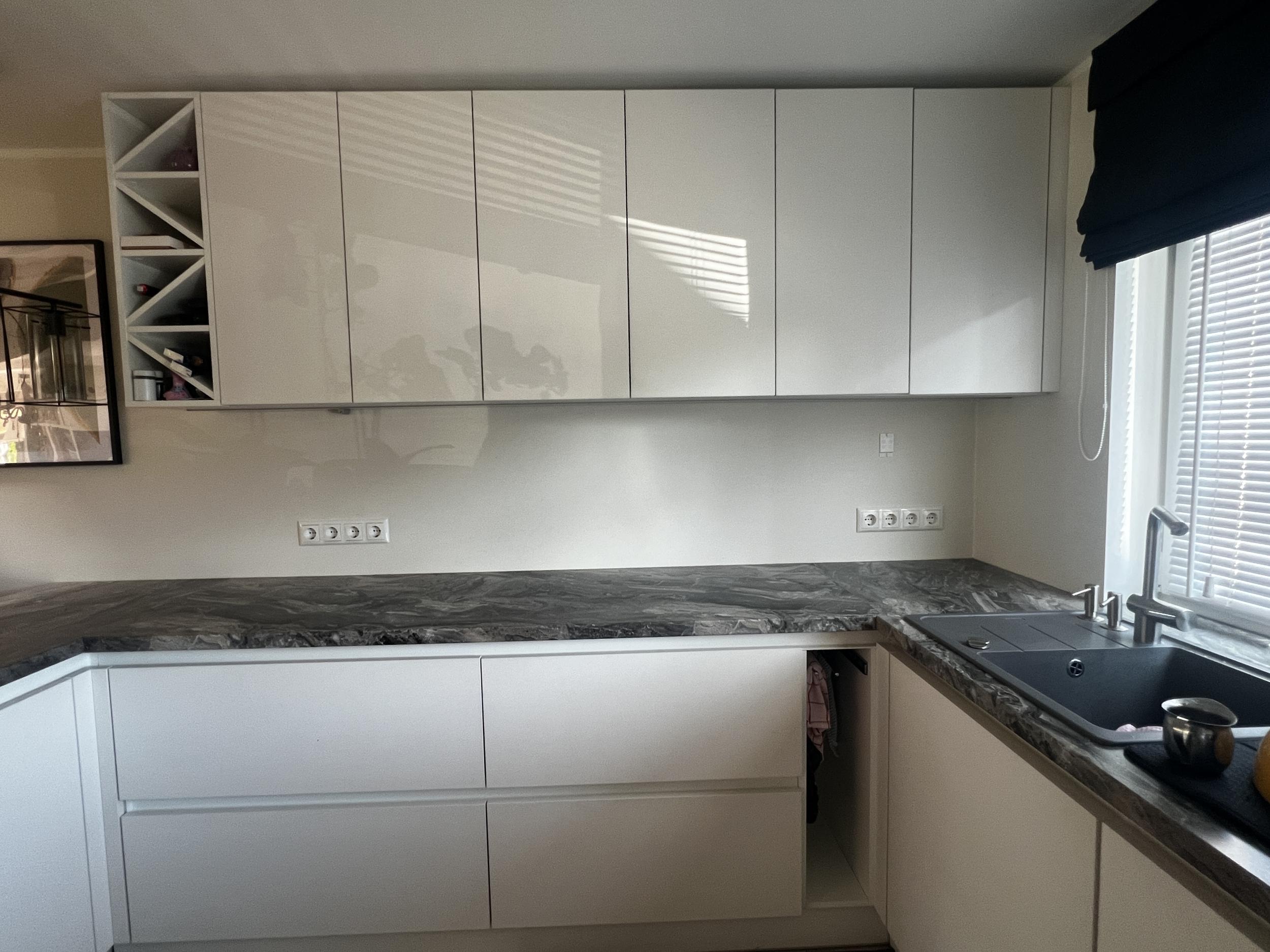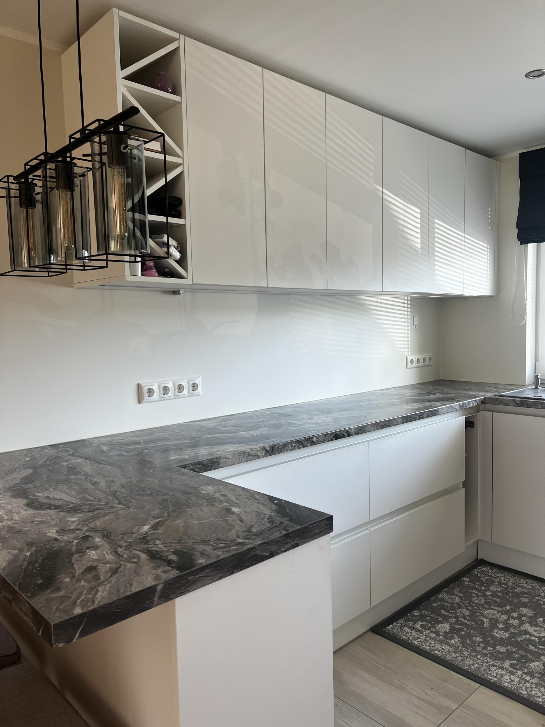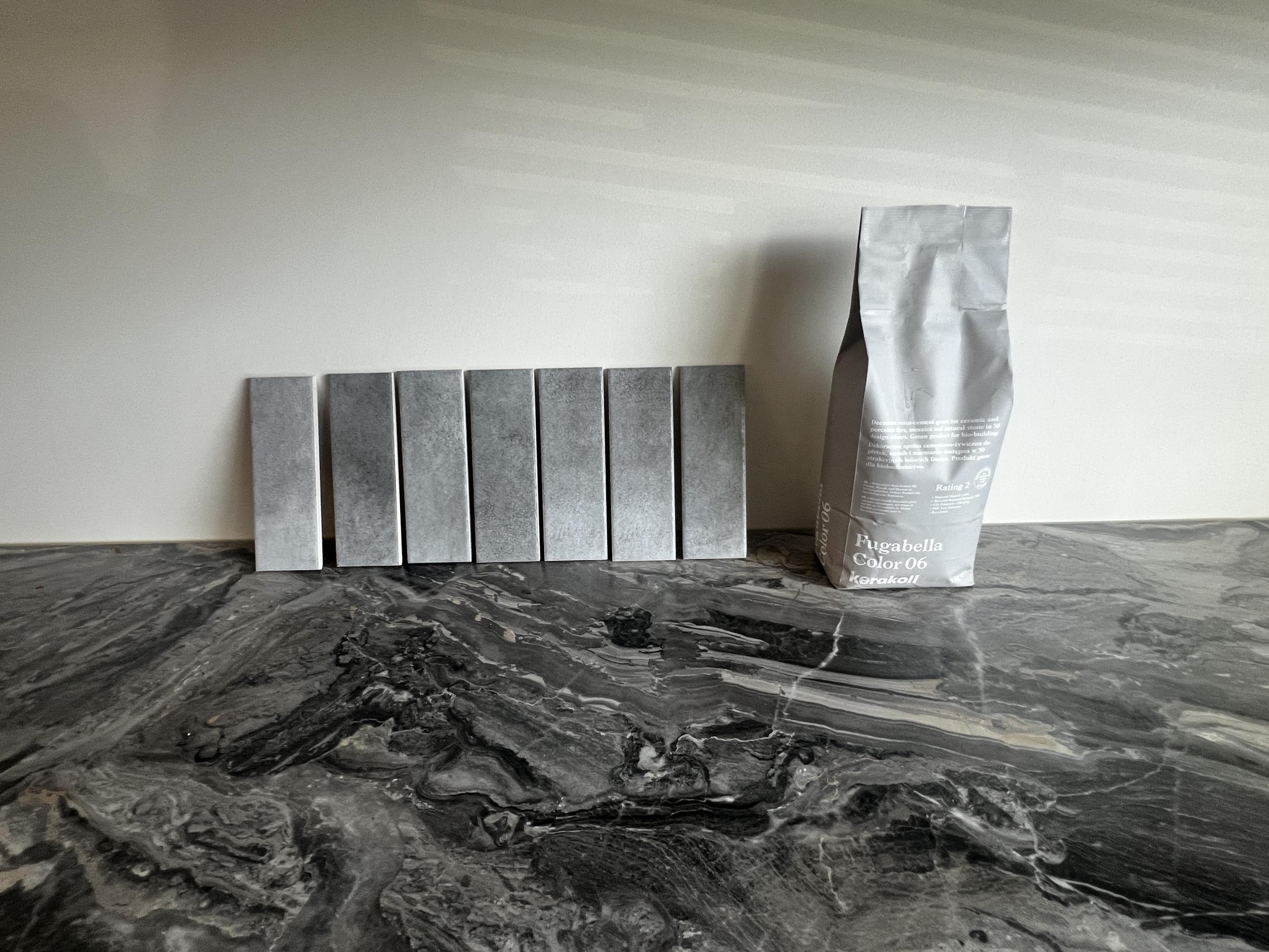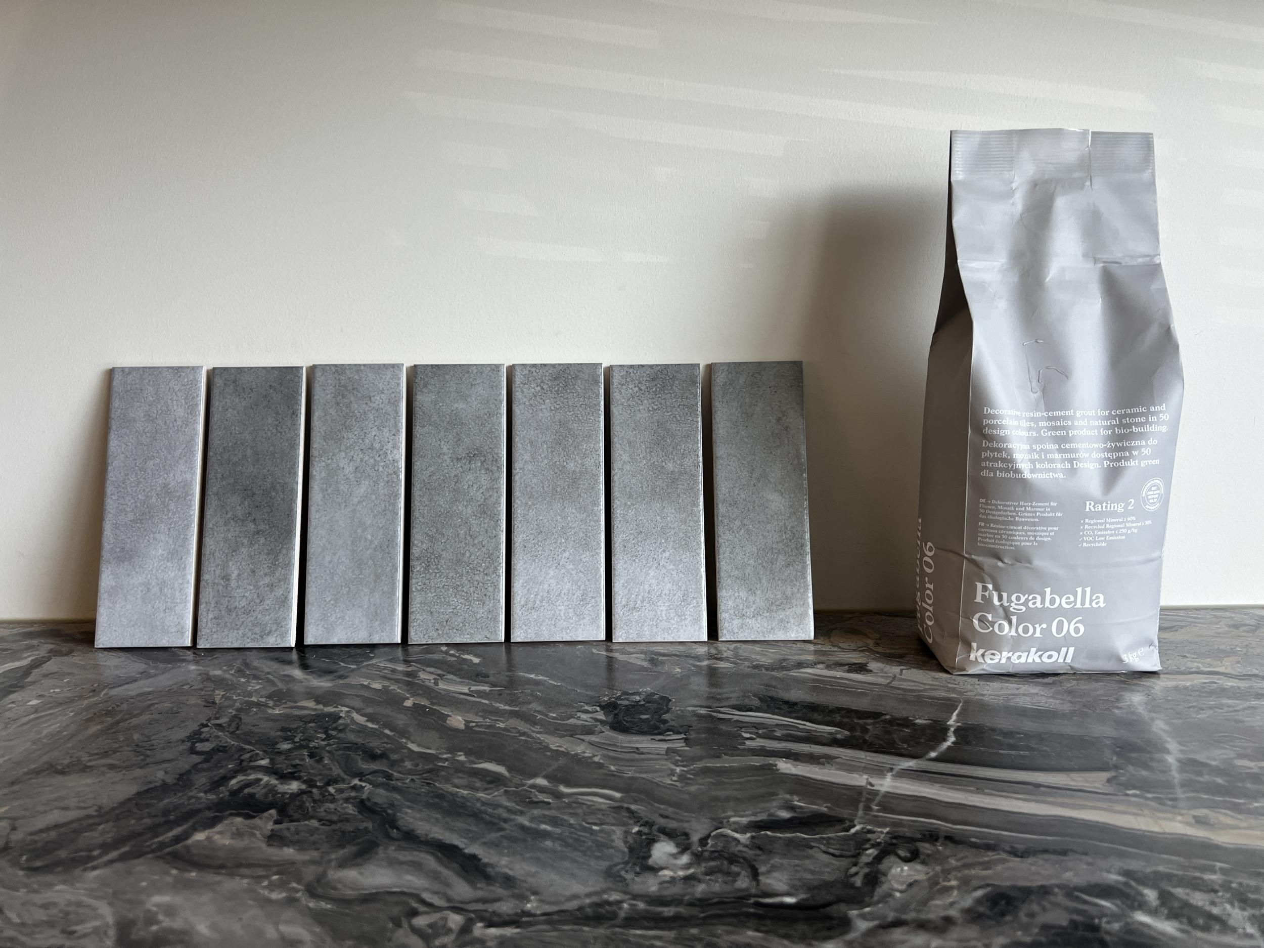 Köögi taustaseina plaatimine kalasaba mustriga, ülemise kapi äärest äreni L kuju, kokku ca 1,75m2. Plaadid (2,3m2) ja 3kg kott vuugisegu olemas. Plaadi suurus on 6,5x20cm.