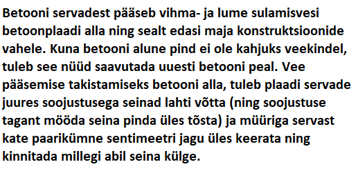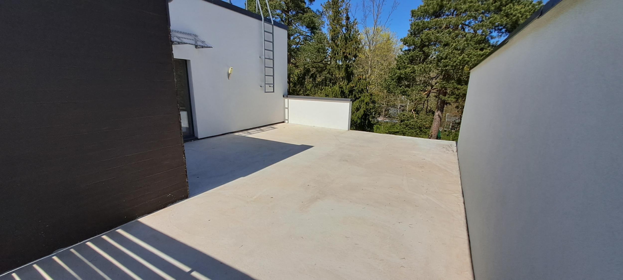 ~50 ruutmeetrise betoonkattega teise korruse katuseterrassi servade ja pinna veekindlaks muutmine. Erinevad seinad: krohvitud fibo, krohvitud penoga soojustatud fibo, voodrilaud, viimistletud krohvitud plaat. Materjali eelistust ei ole. Betoon on valatud kerge kaldega ühele lahtisele poole, kus olemas vihmaveerenn.