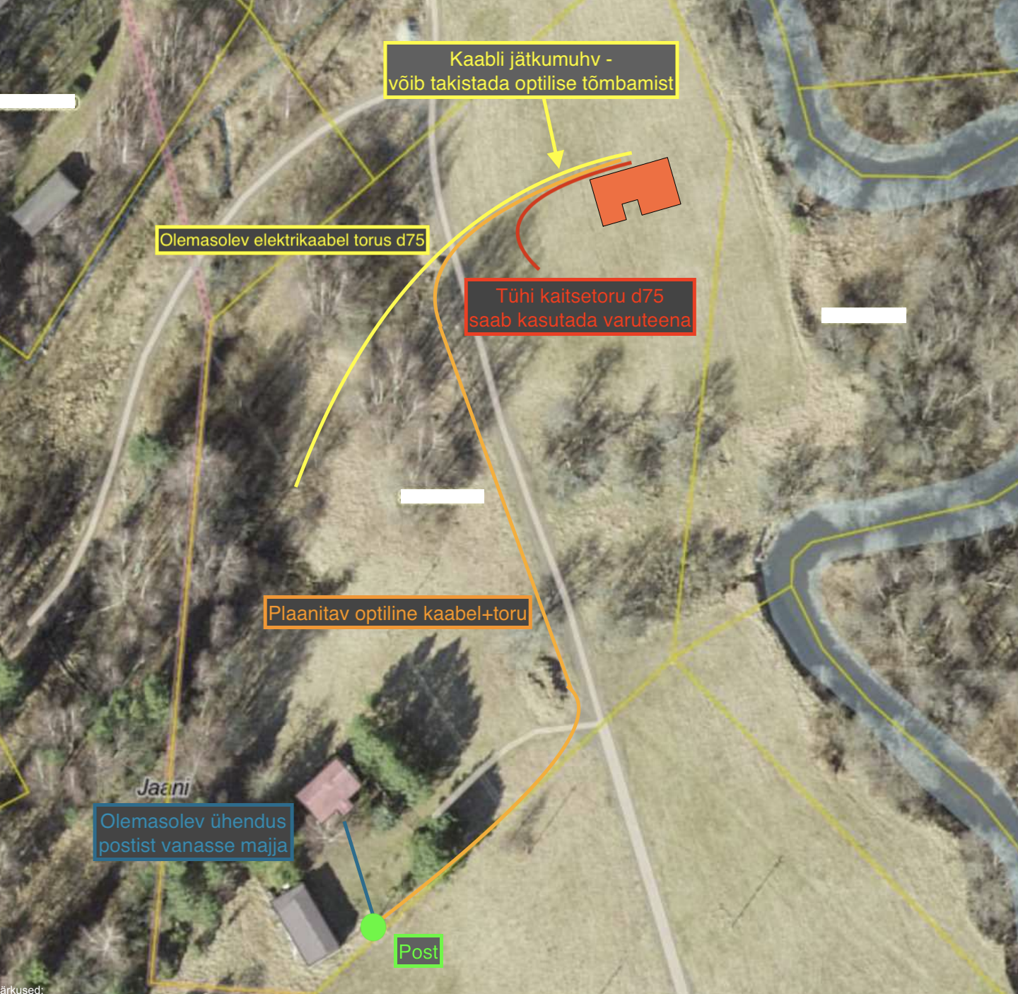 Optilise kaabli liitumispunkt krundi piiril postil. Hetkel kasutab ühendust suvila, kuid soovin, et esmane ühendus tekiks uue elumajaga ning suvila ühendus käiks uues majas oleva ruuteri kaudu. Optilises kaablis ühenduste loomise osas on pakkuja olemas, käesolevas hankes otsin ennekõike trassi rajajat ehk kaablikaitsetoru maasse panijat. Lisatud olemasolevate ja plaanitavate trasside skeem. Soovin pakkumist ca 190-200m kaablikaitsetoru paigaldusele liivapinnases. Kui soovite teha pakkumise ka optilise kaabli paigaldusele ja ühenduste loomisele, märkige see eraldi.