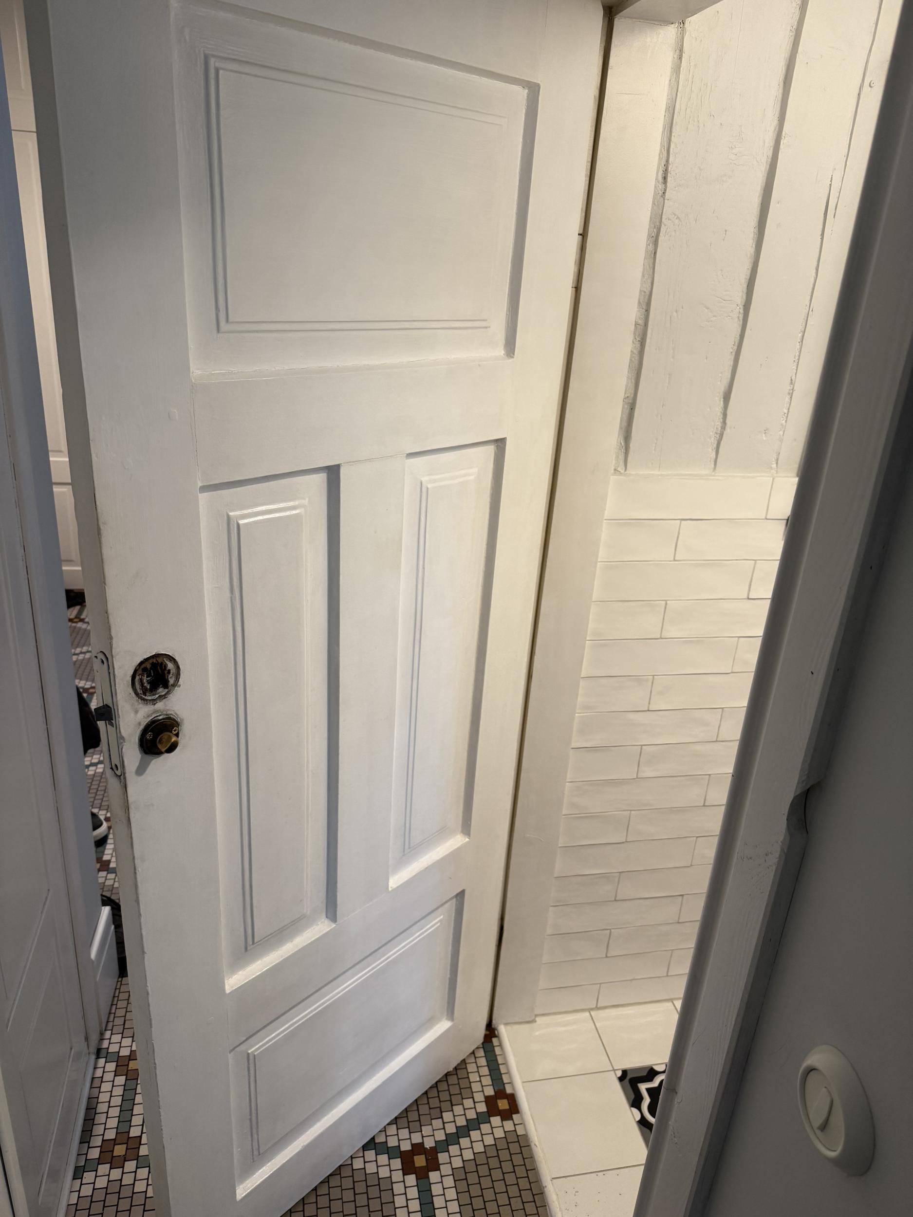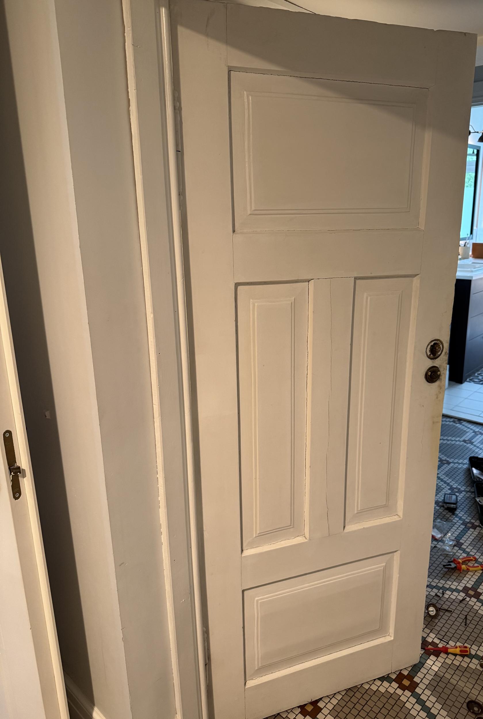 Vaja oleks renoveerida puidust uks ja uuesti ilusti käima panna. Eemaldada uks. Lihvida, parandada/taastada luku piirkond ja hingede piirkond, uuesti valgeks värvida, paigaldada kas vanad hinged uuesti või uued hinged, link ja lukk (link ja lukud olemas).