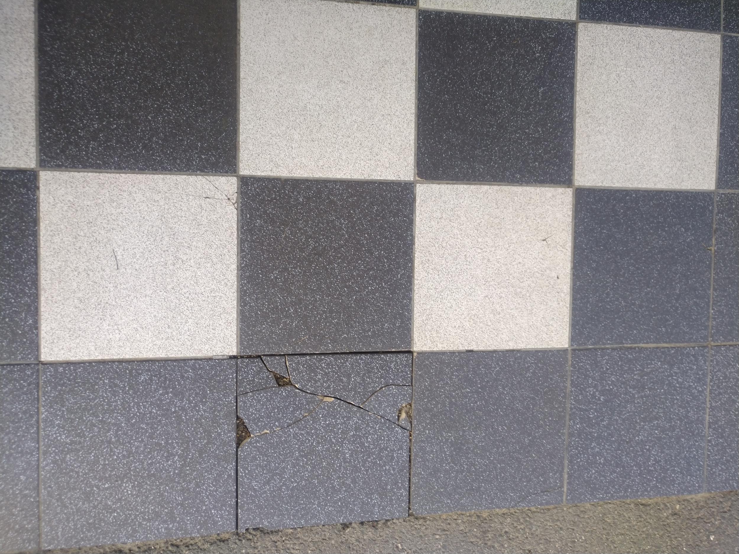 Välistrepi äärealal on mitmed plaadid pragunenud või murenenud. Kahjustatud plaadid tuleb eemaldada ning asendada uutega. Töömaht hõlmab trepi ääreplaadirea ning osaliselt ka teise rea plaatide eemaldamist ja uute plaatide paigaldust. Kokku vahetatakse välja 38 plaati.