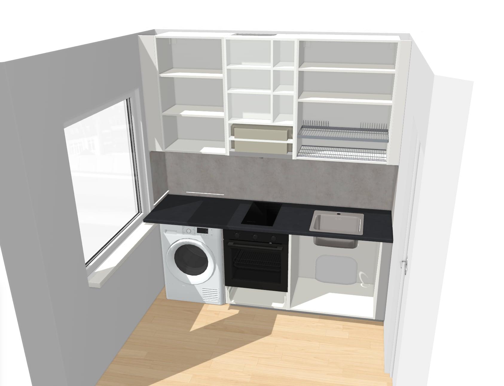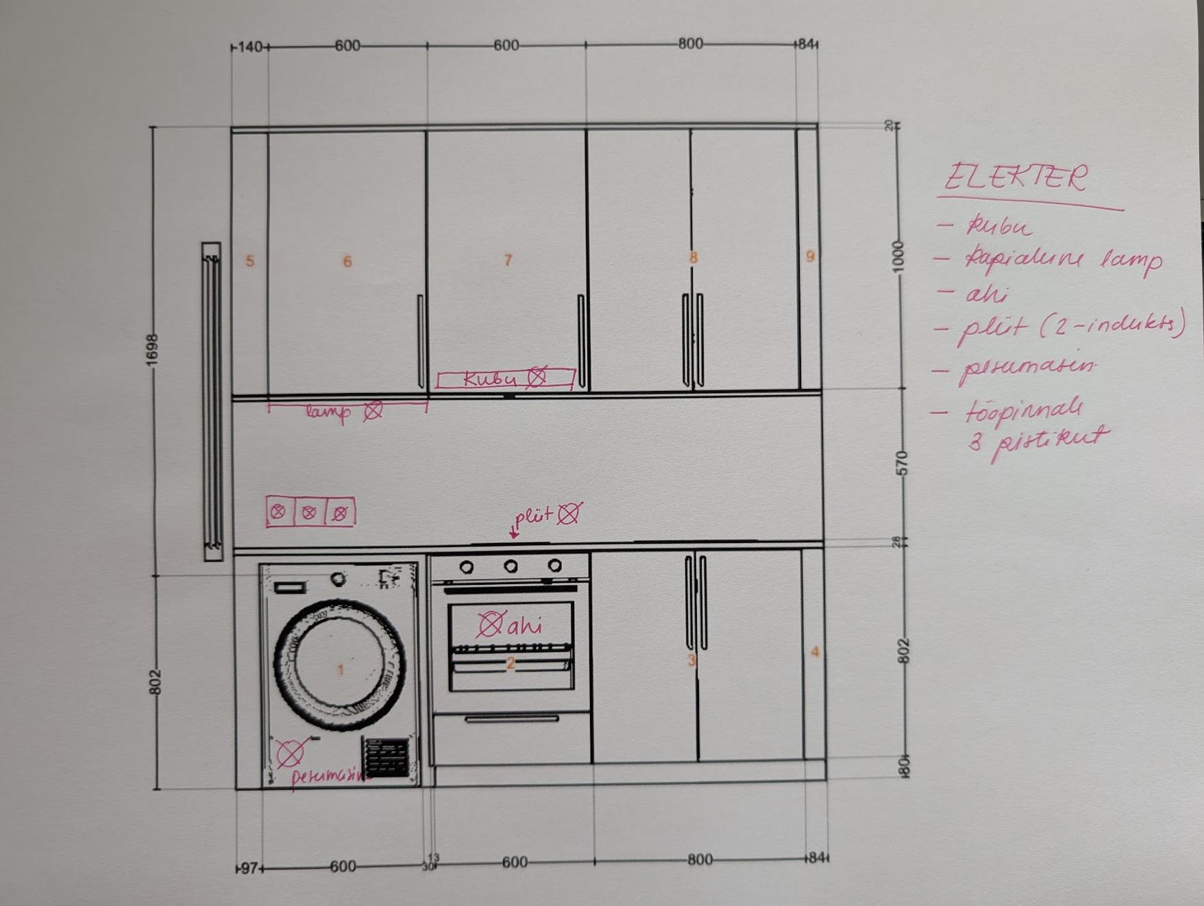 Ühendusi oleks vaja ahjule, pliidile, kubule, ülemiste kappide valgustusele, pesumasinale ja lisaks kolm pistikut tööpinna peale seinale.