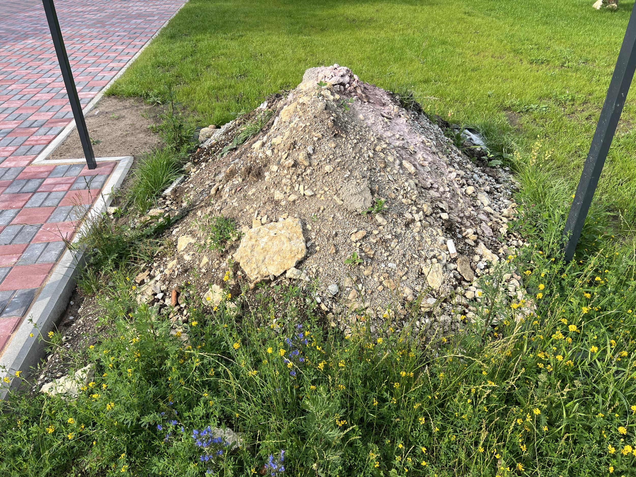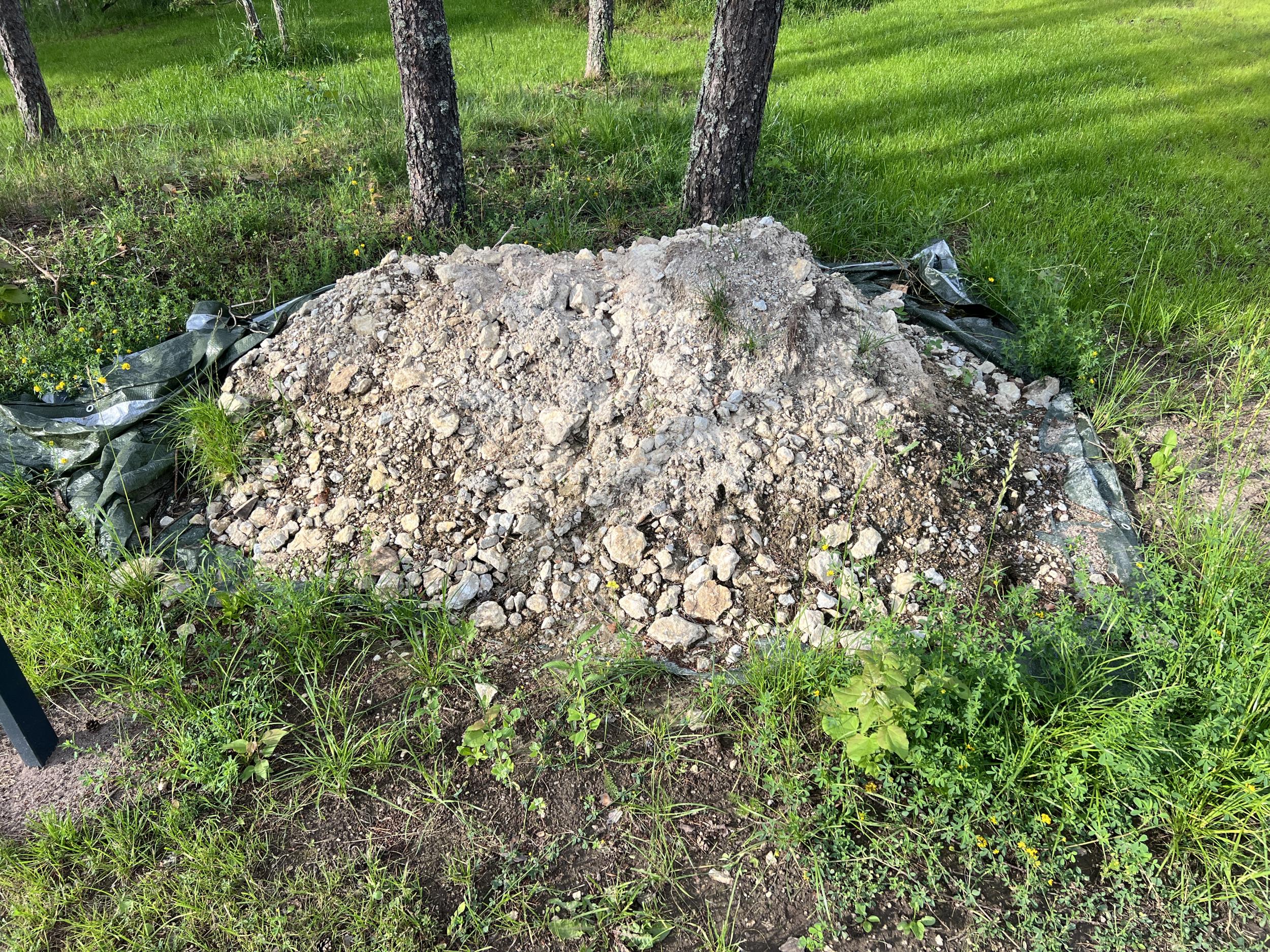 Tööks on pinnase äravedu, piltidel näidatud 2 hunnikut. Hunnikutes on aiapostide aukude kaevamisest muld, paekivi jms pinnas.