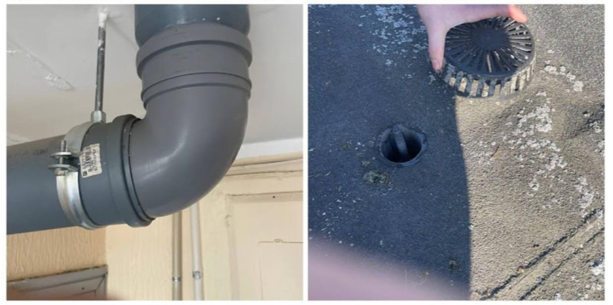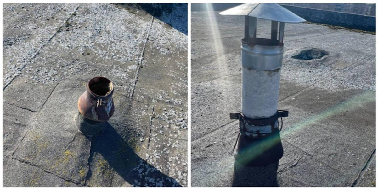 Vihmaveetoru - puurida katusele augud läbimõõduga 90 mm (hetkel on 50 mm). Viia toru läbi betooni. Paigaldada ülaosas uued vee kogumiskarbid. Isoleerida ühenduskohad, et hiljem katusele uus kate paigaldada.